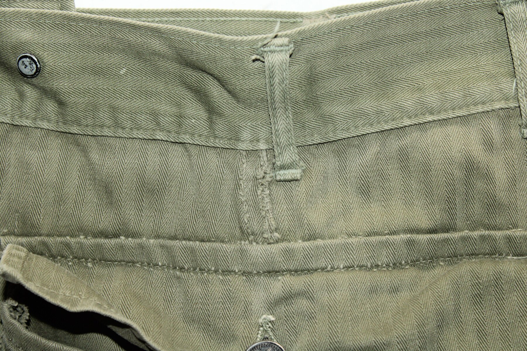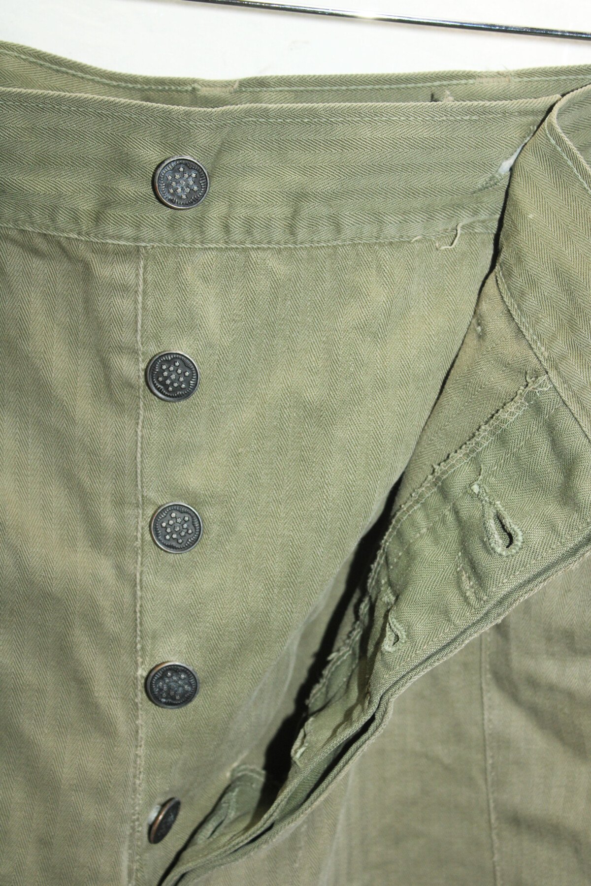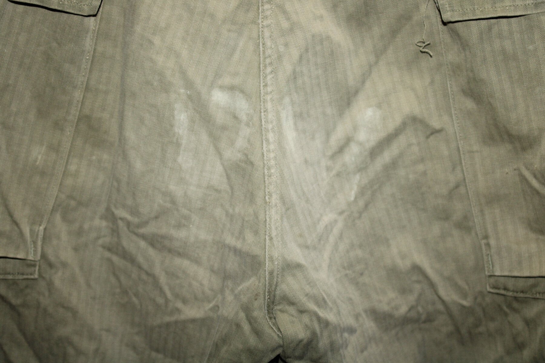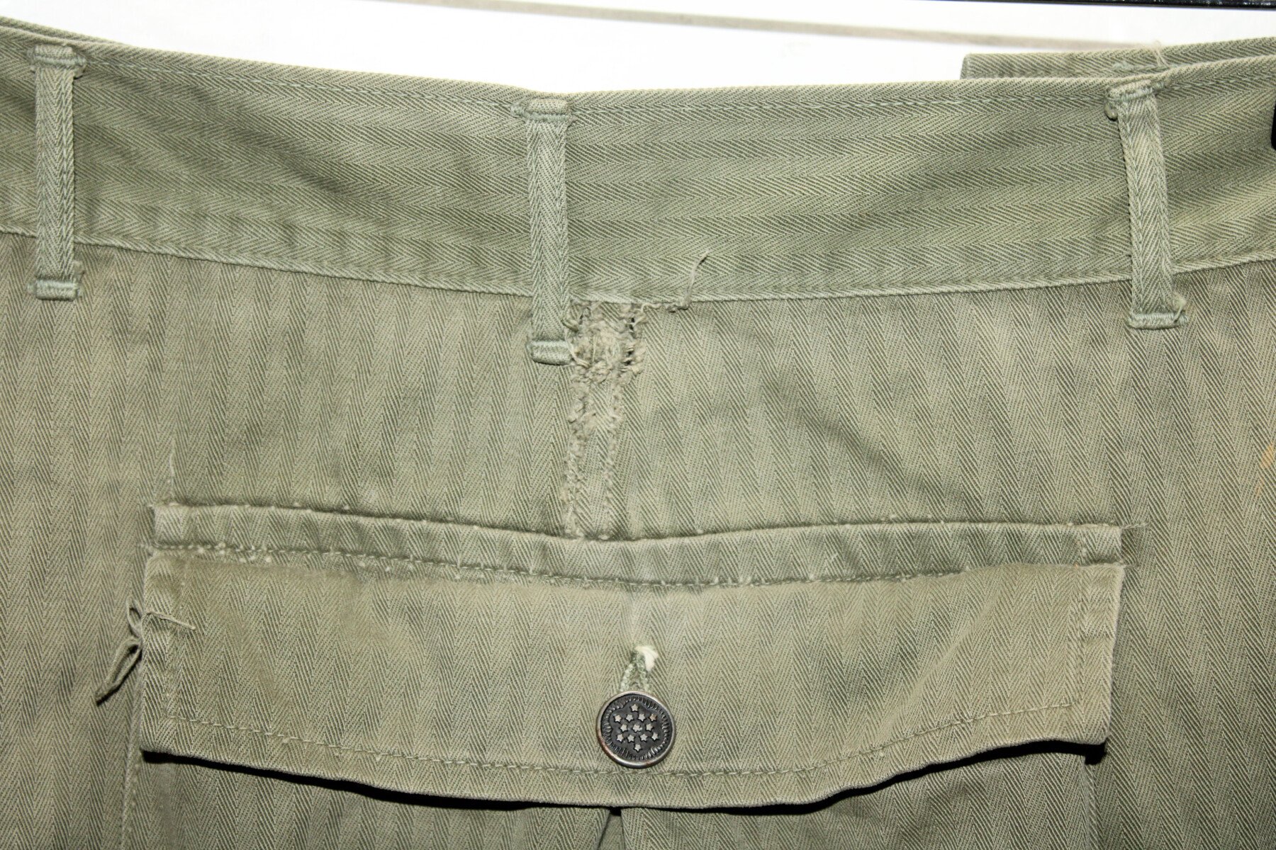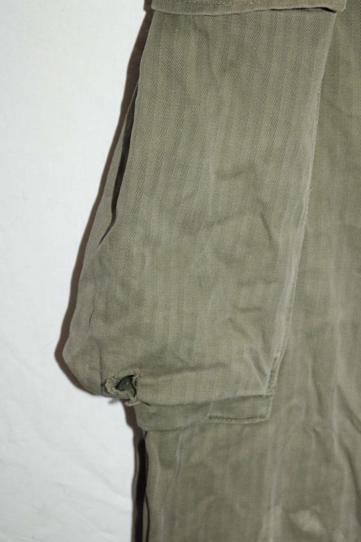 Pantalon de treillis HBT (Herringbone Twill) marqué PW (Prisonner of War) sur les cuisses et les fesses. Poches à soufflet médian. Taille W32-L33. Rabat anti gaz présent, étiquette absente. Une couture de poche abimé, un trou sur une poche. Tout les boutons sont présents. Belle pièce difficile à trouvé. Provient de camps cigarettes en Seine-Maritime.
