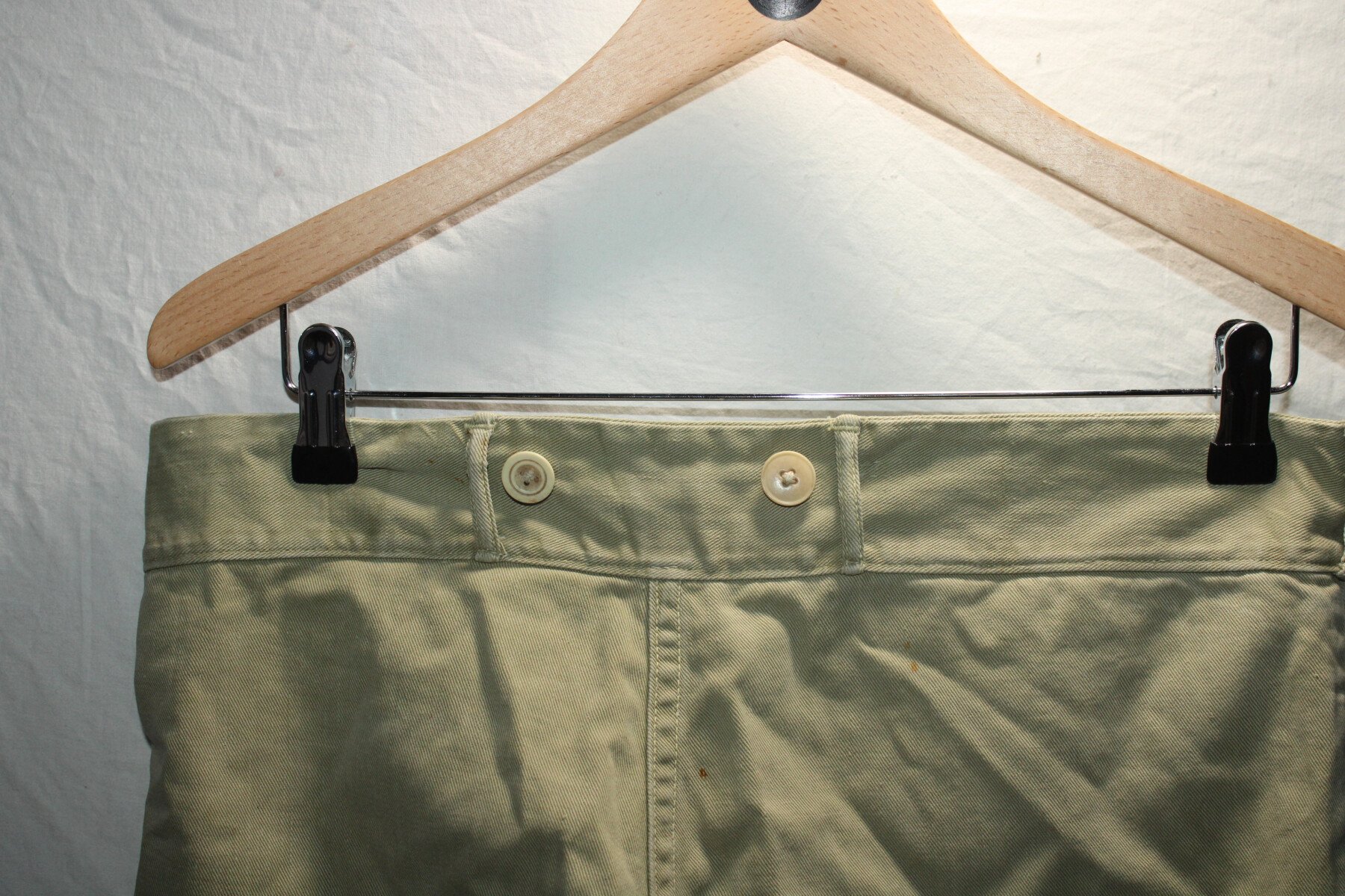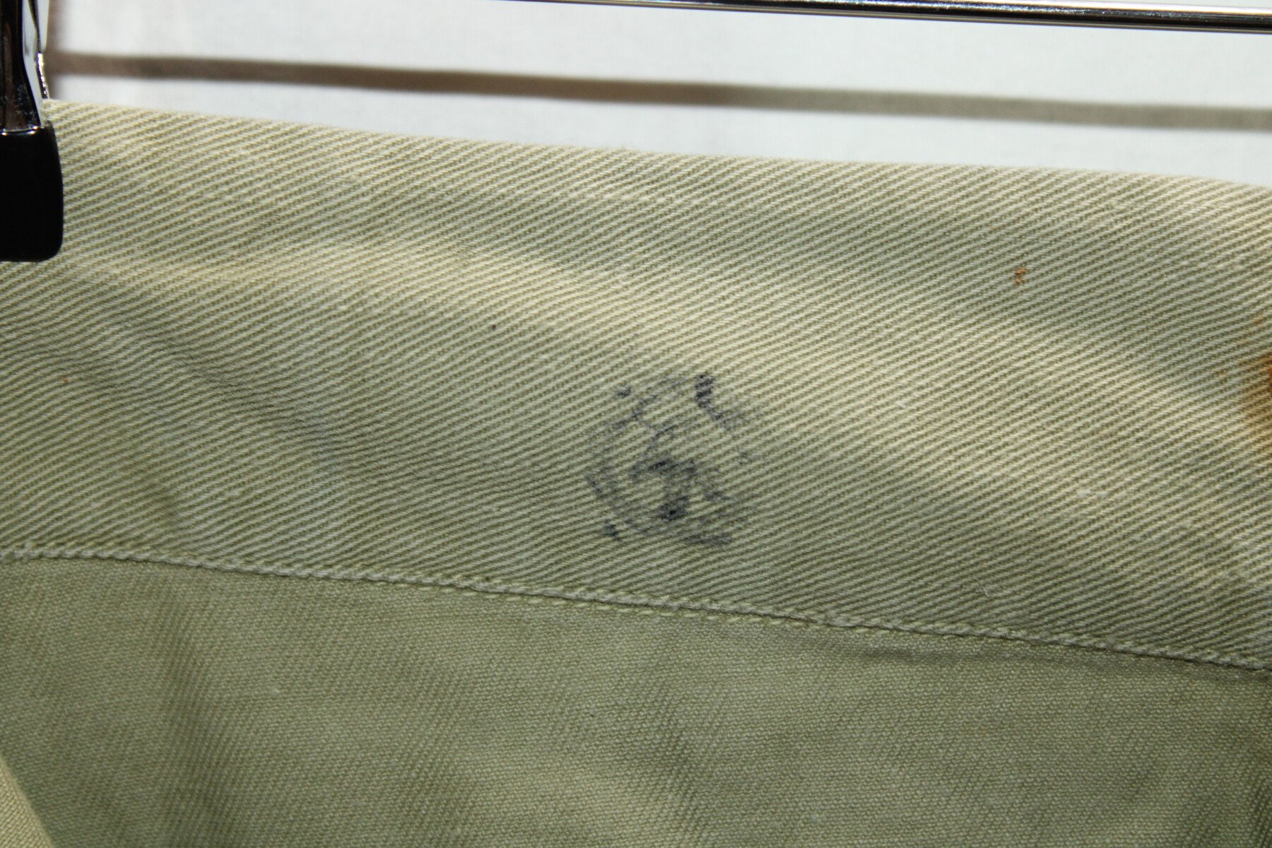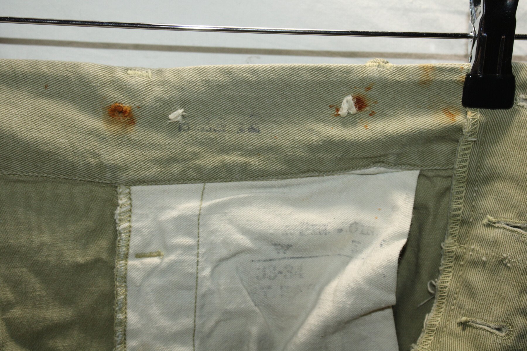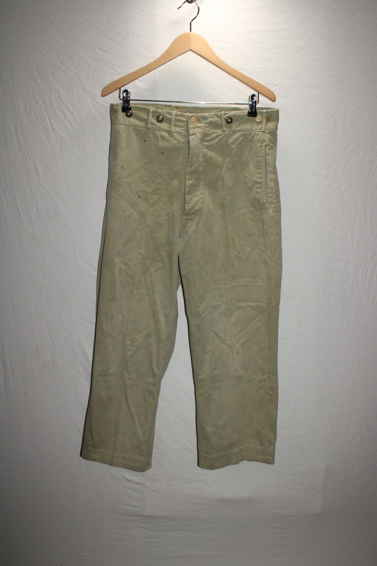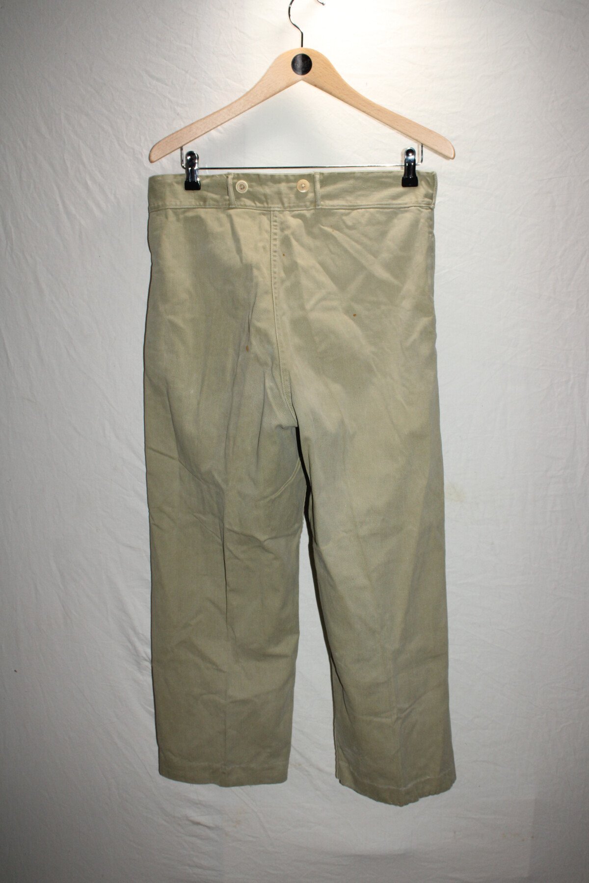 Pantalon en toile Khaki drill, fabrication canadienne. Tampon présent. Date illisible. Quelques petites taches de rouille. Une réparation sur le genou. Provient de camps cigarettes en...
