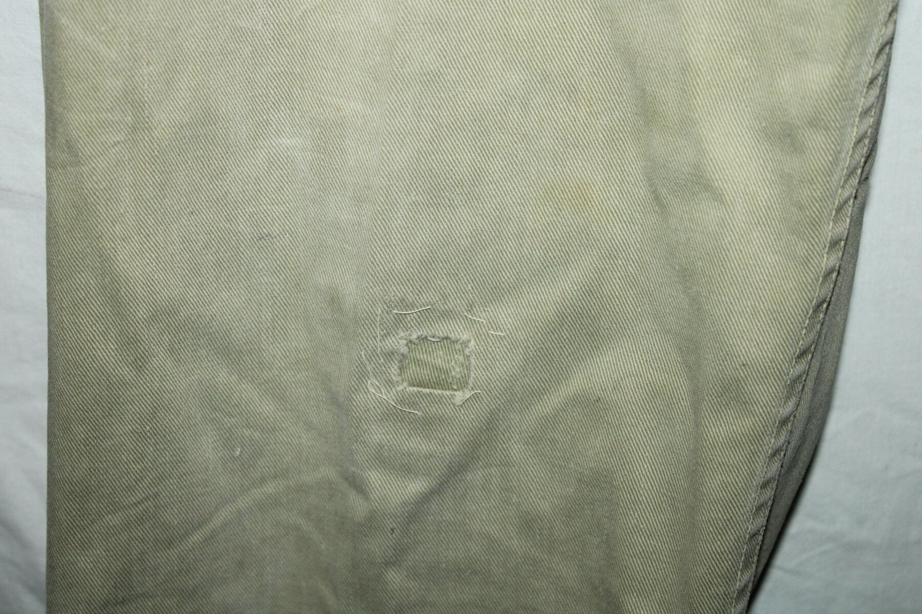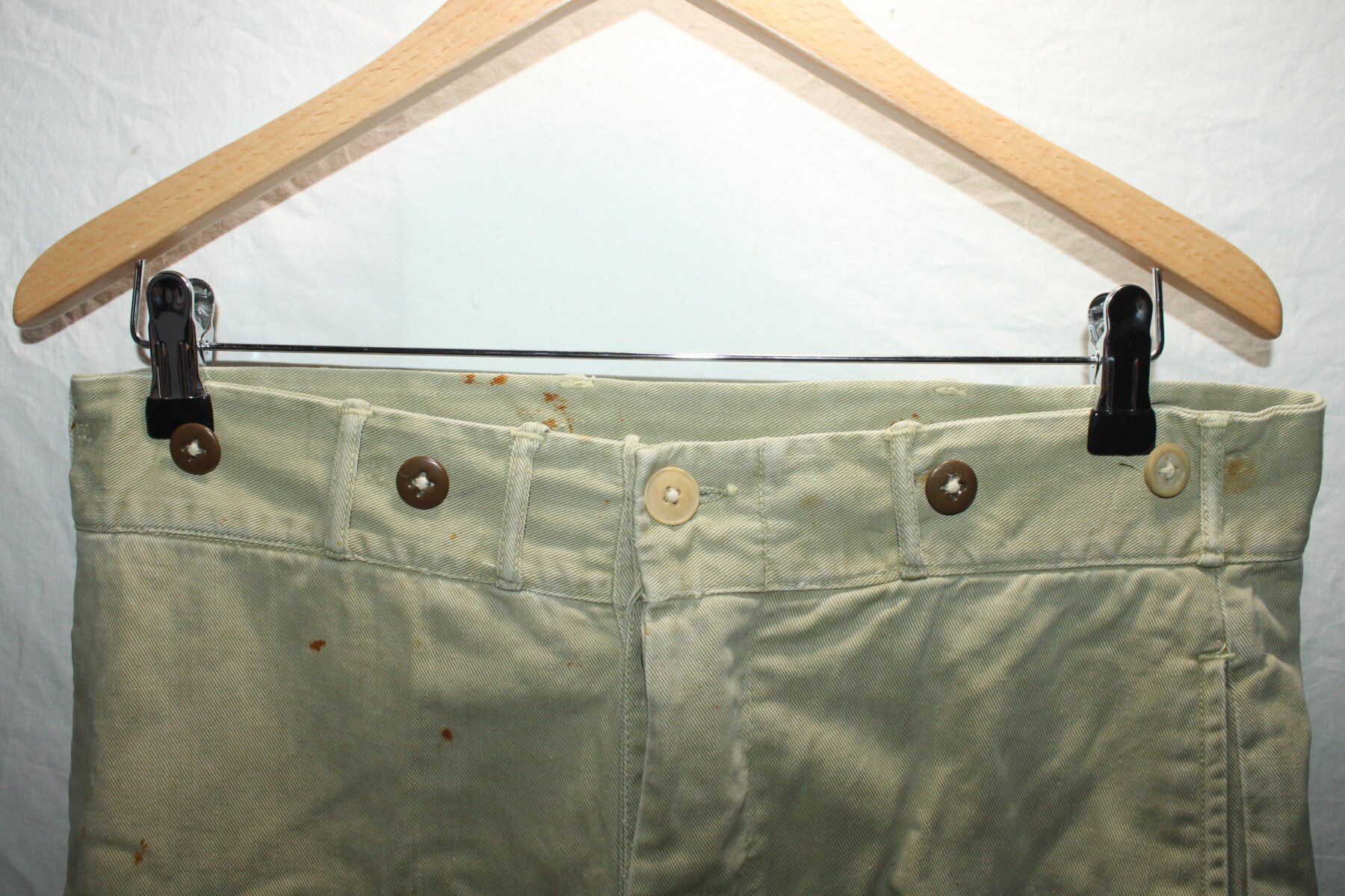 Pantalon en toile Khaki drill, fabrication canadienne. Tampon présent. Date illisible. Quelques petites taches de rouille. Une réparation sur le genou. Provient de camps cigarettes en Seine-Maritime. Tour de taille à plat 42cm, longueur totale 96cm, entre jambe 63cm.