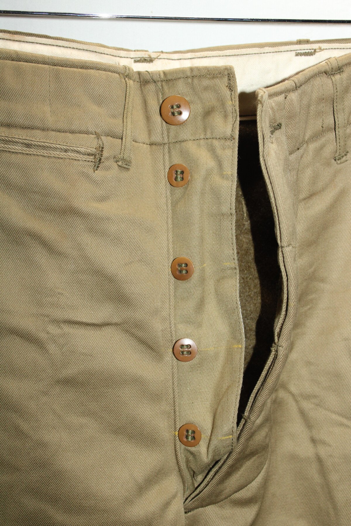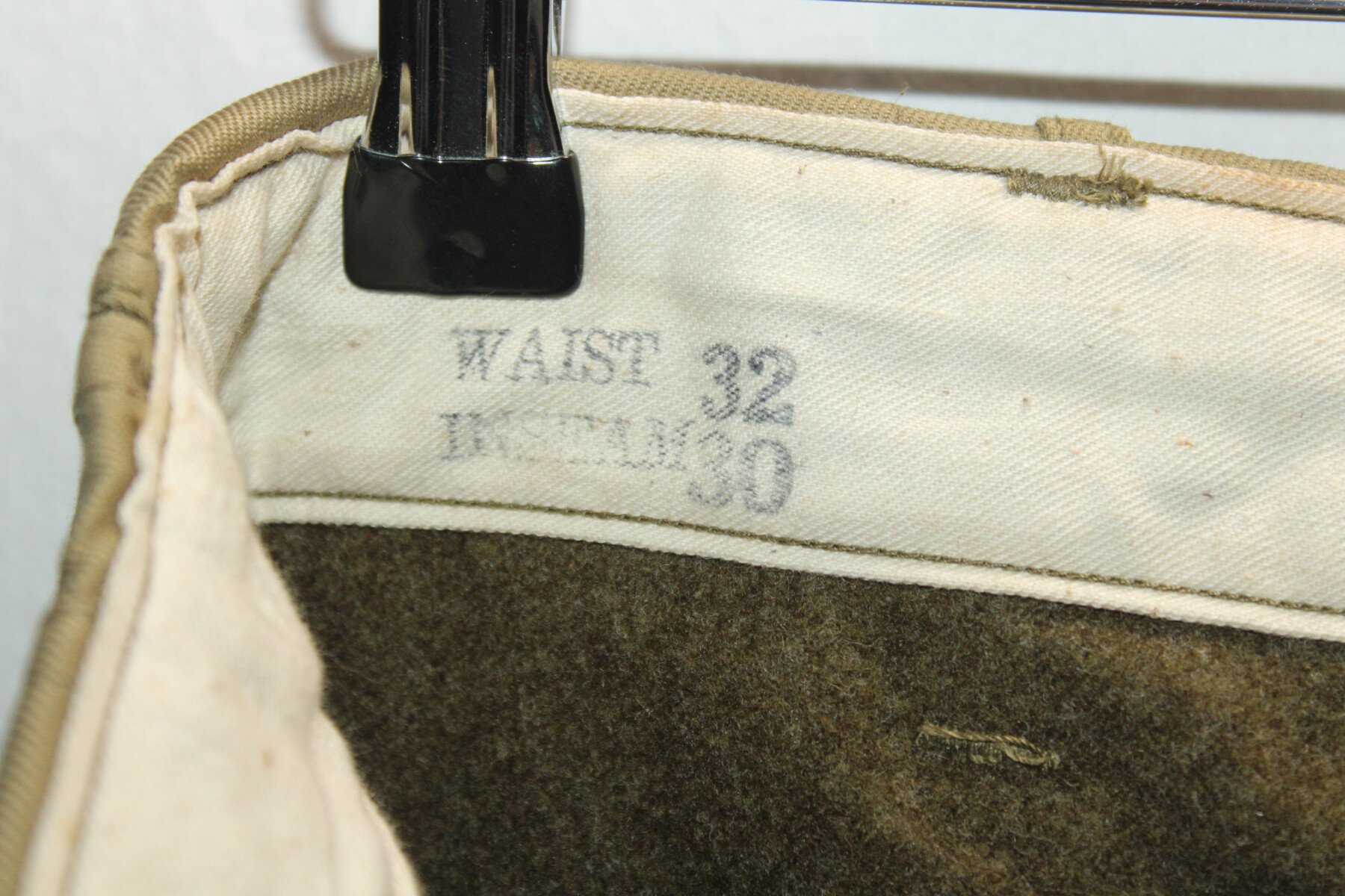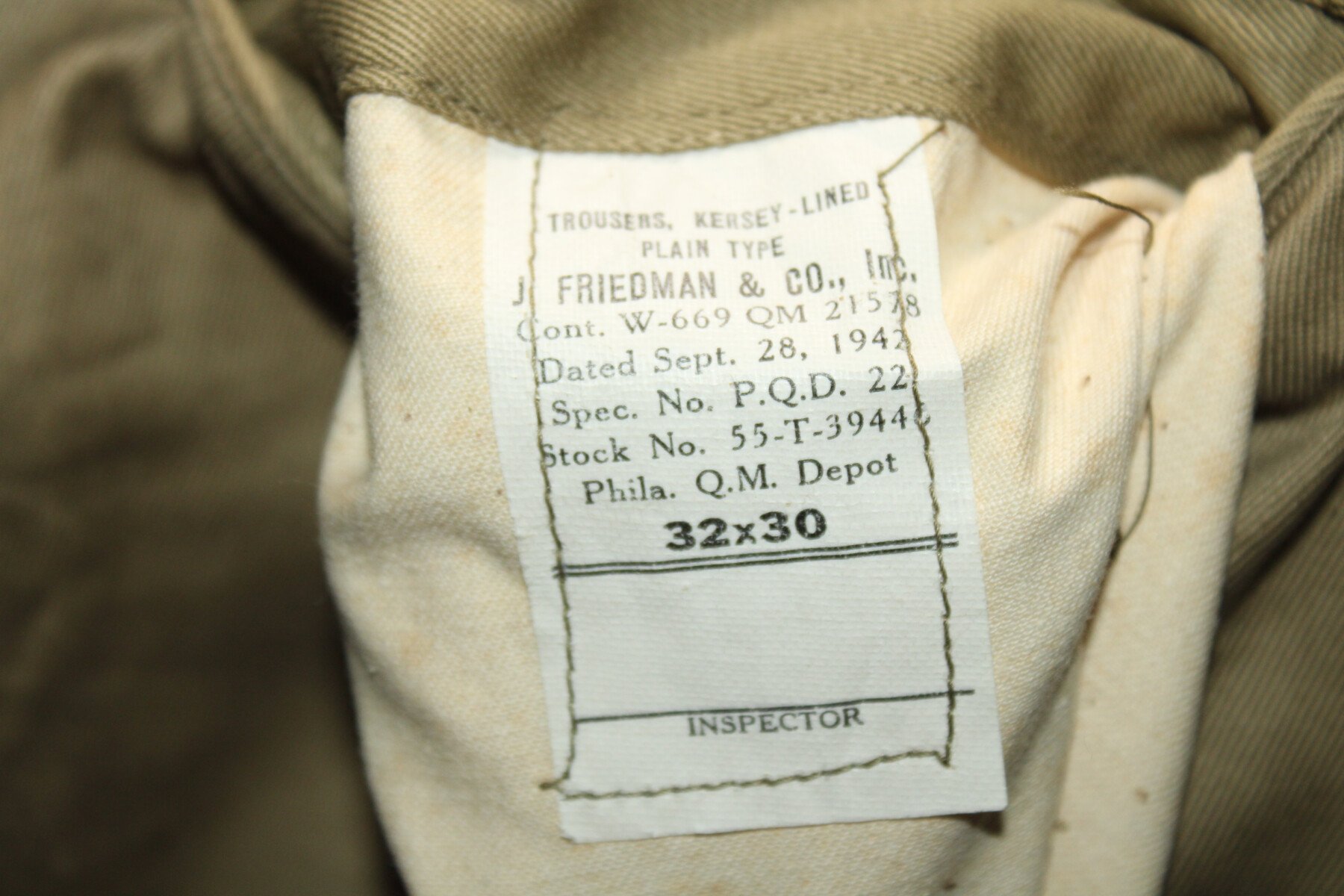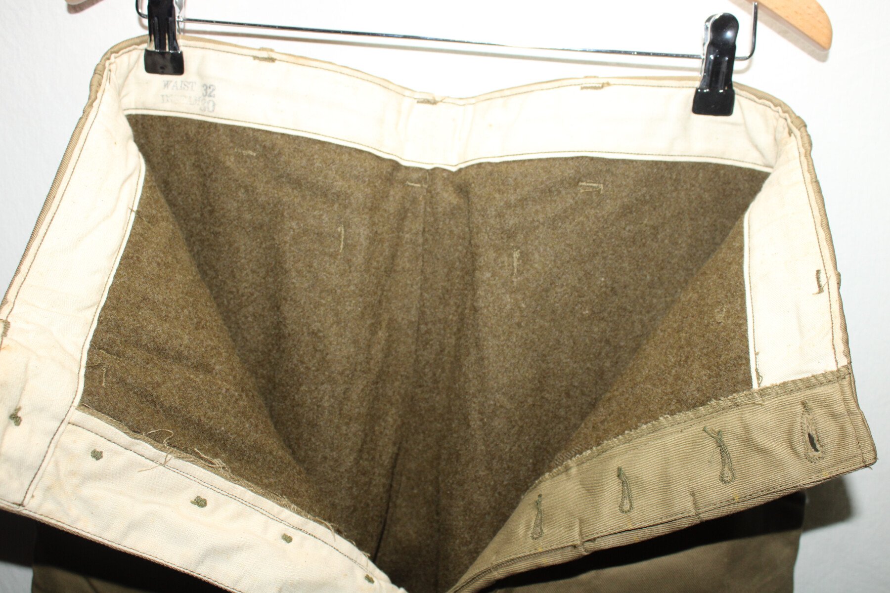 Pantalon Kersey lined, allant avec la veste M41 arctic. étiquette présente daté 1942. Taille 32X30. Tour de taille à plat 40cm, longueur de jambe 103cm. Neuf de stock. Surnommé pantalon de tankiste par les soldats en Italie.