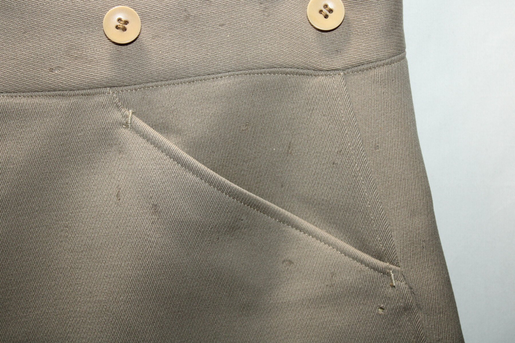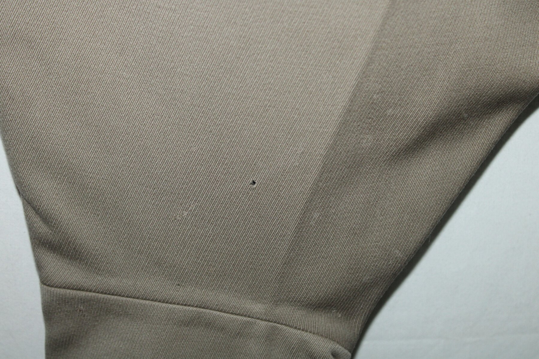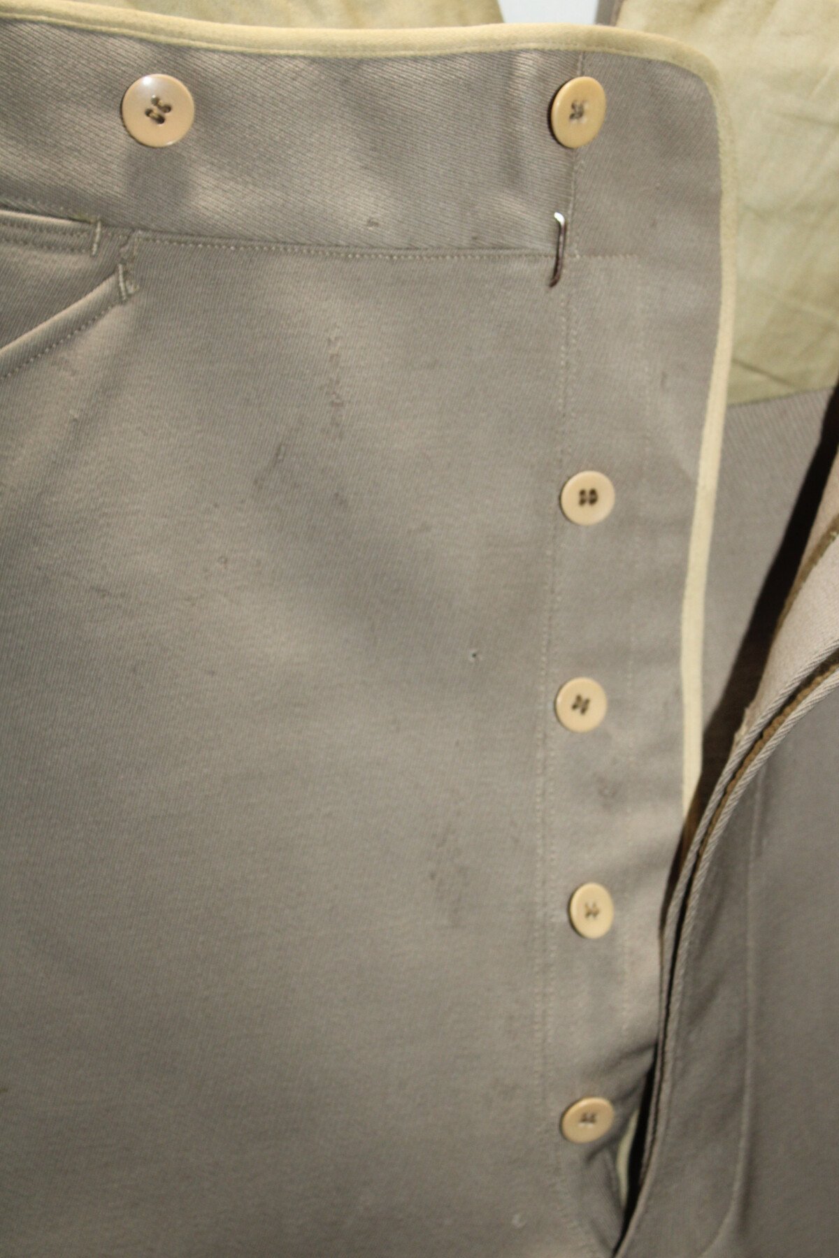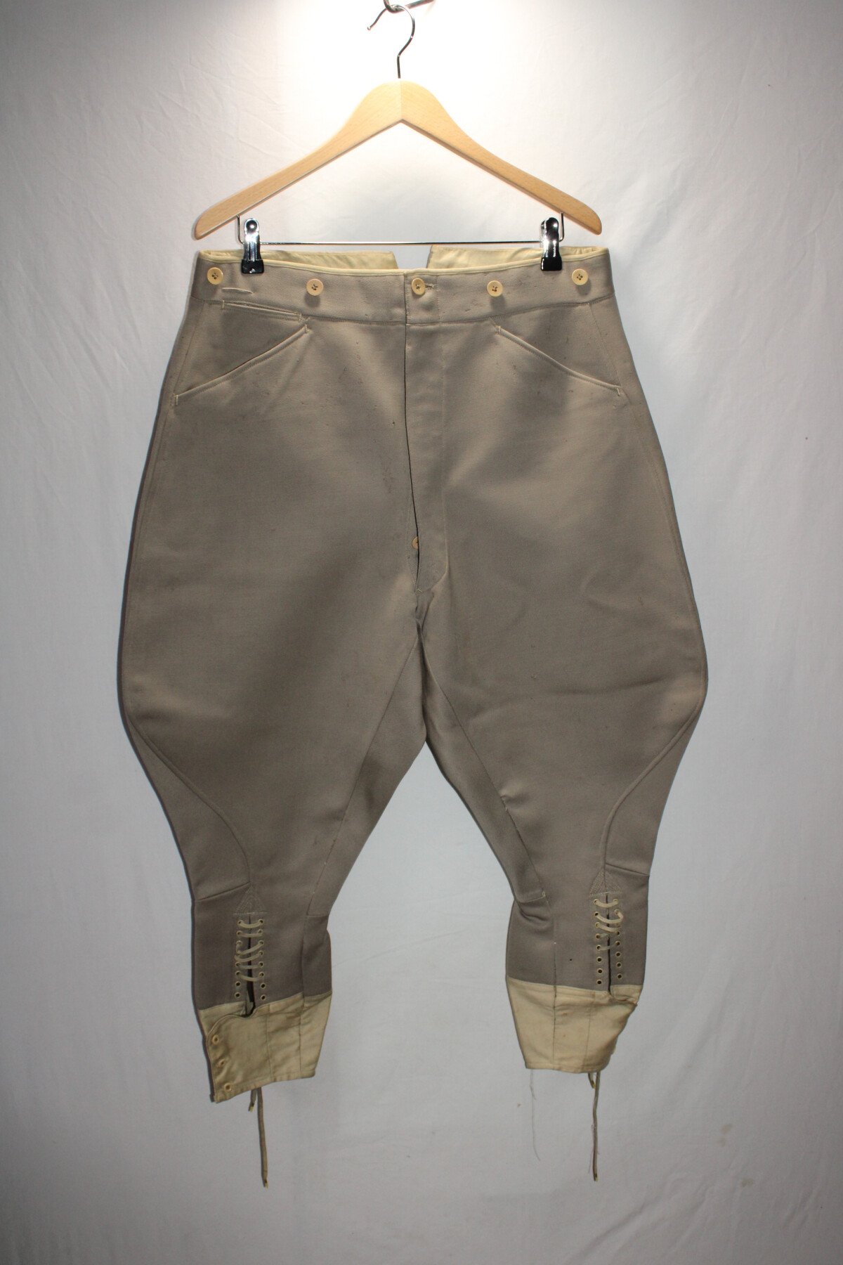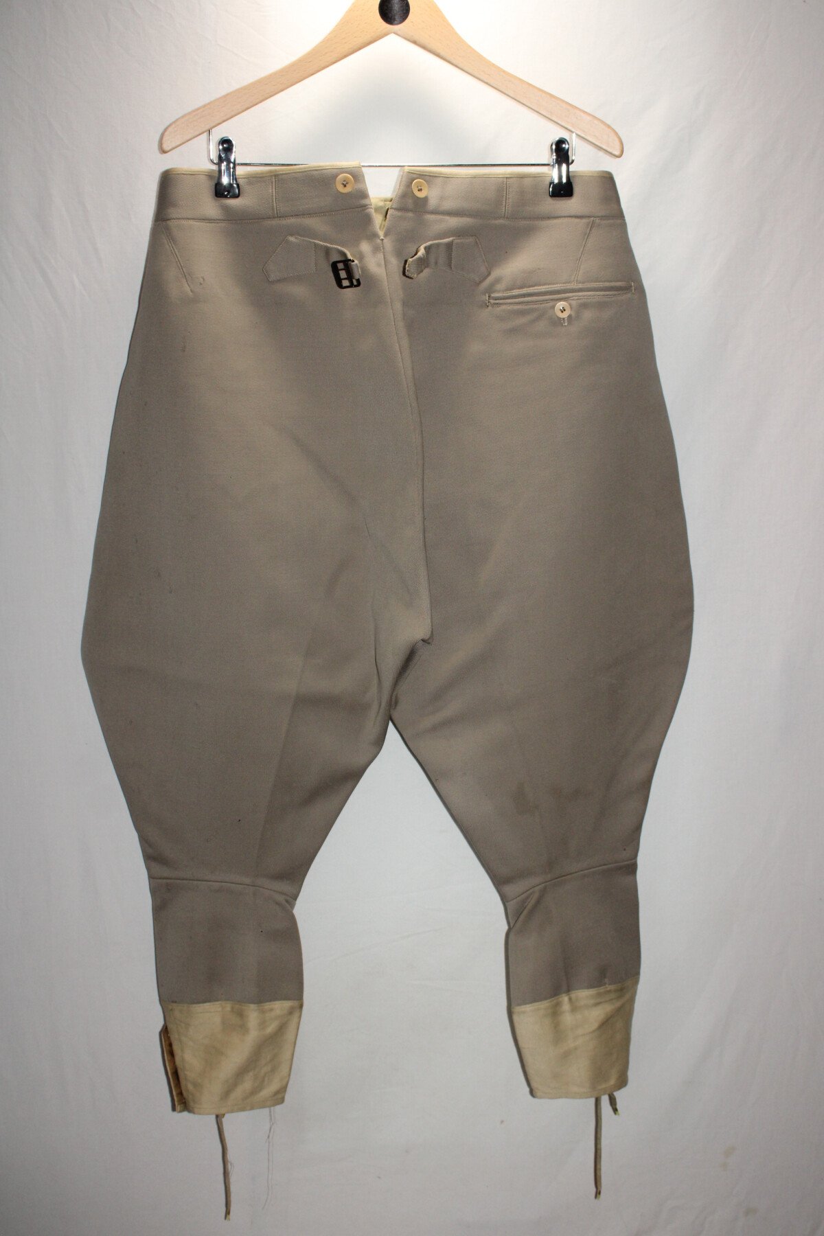 Pantalon-culotte d'officier en tissu mastic. Nombreuse petit trous. Lacets présents. Tour de taille à plat 46cm, hauteur total 96cm, mollet à plat 16cm.