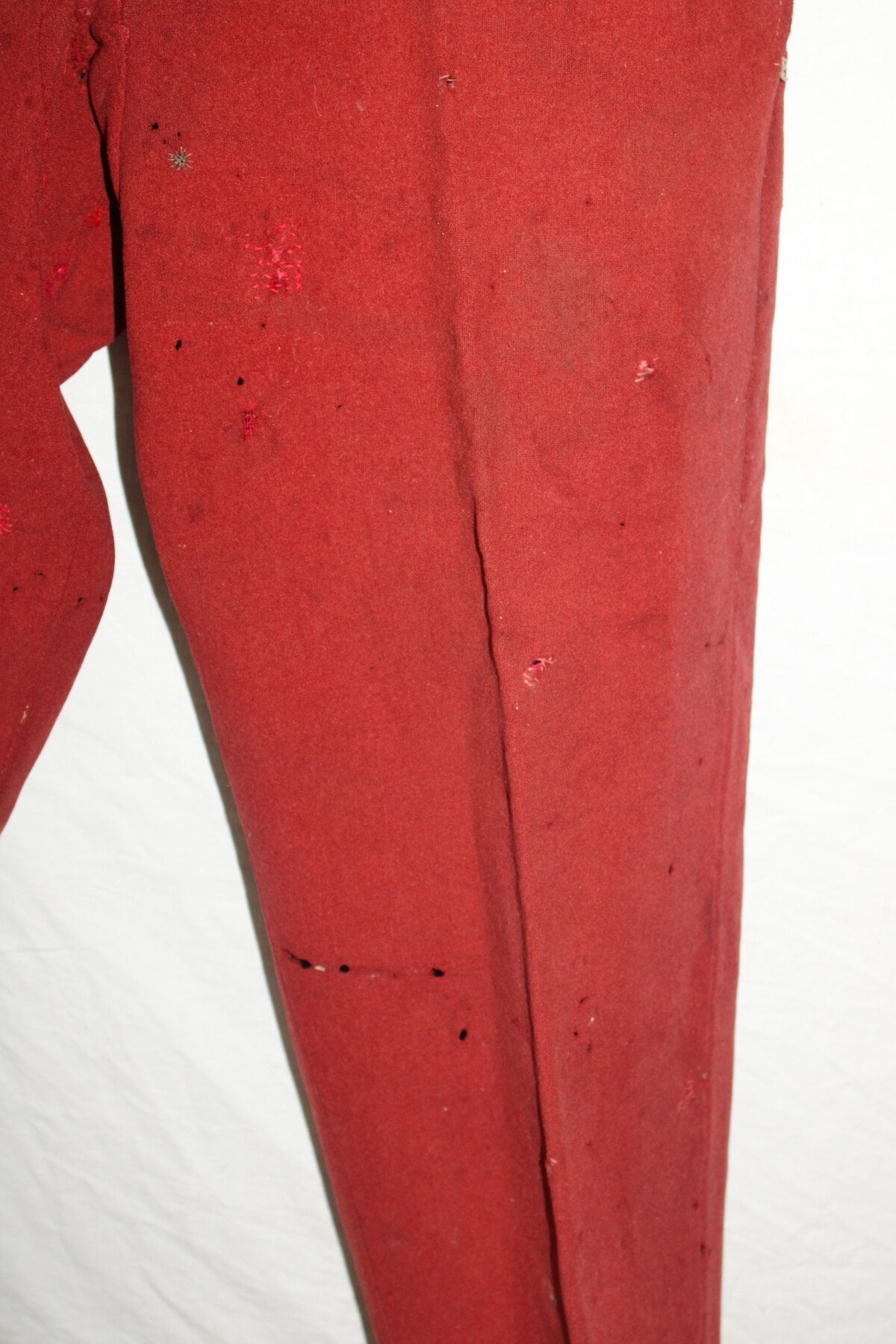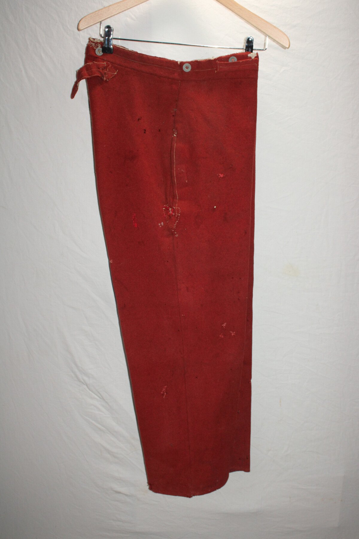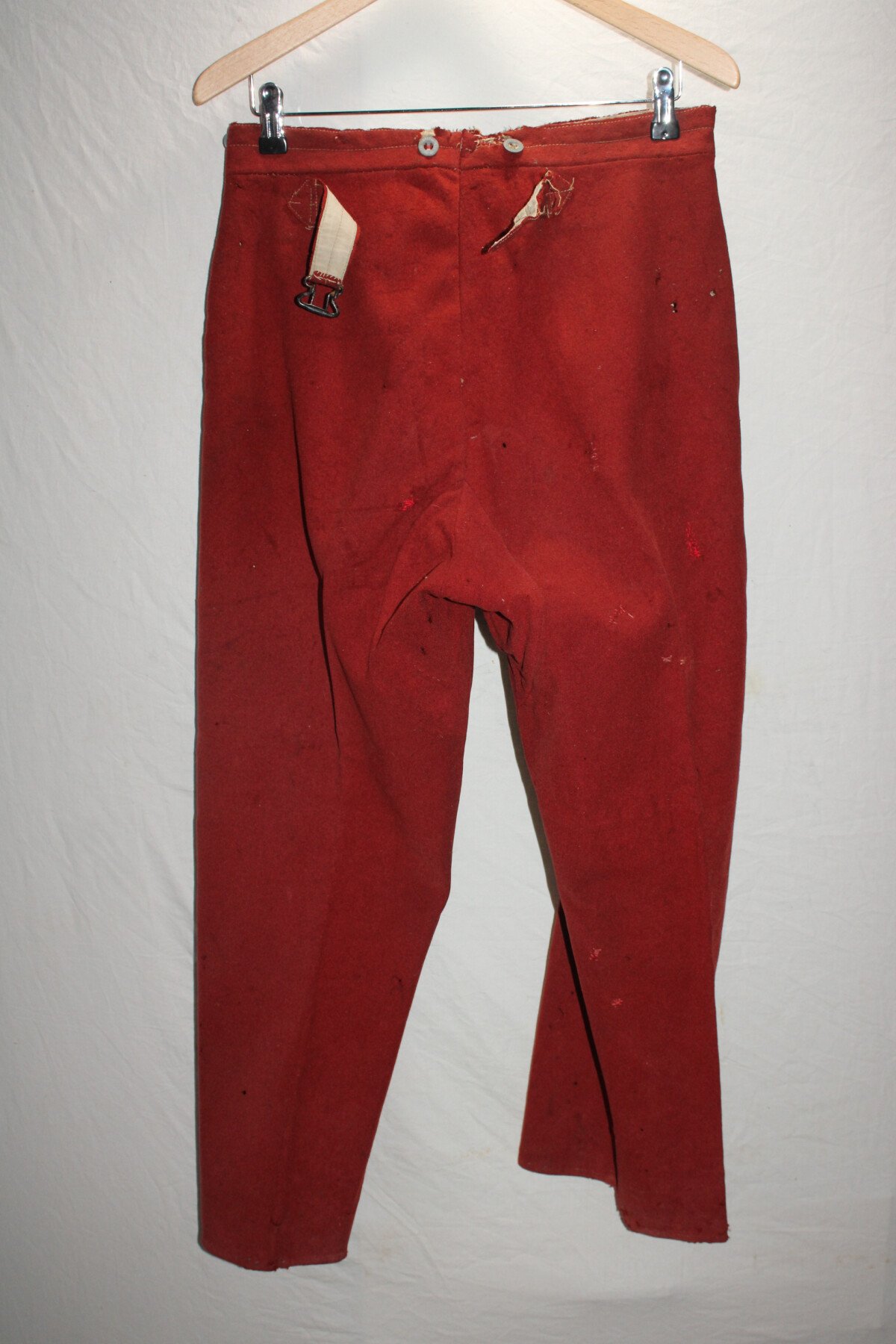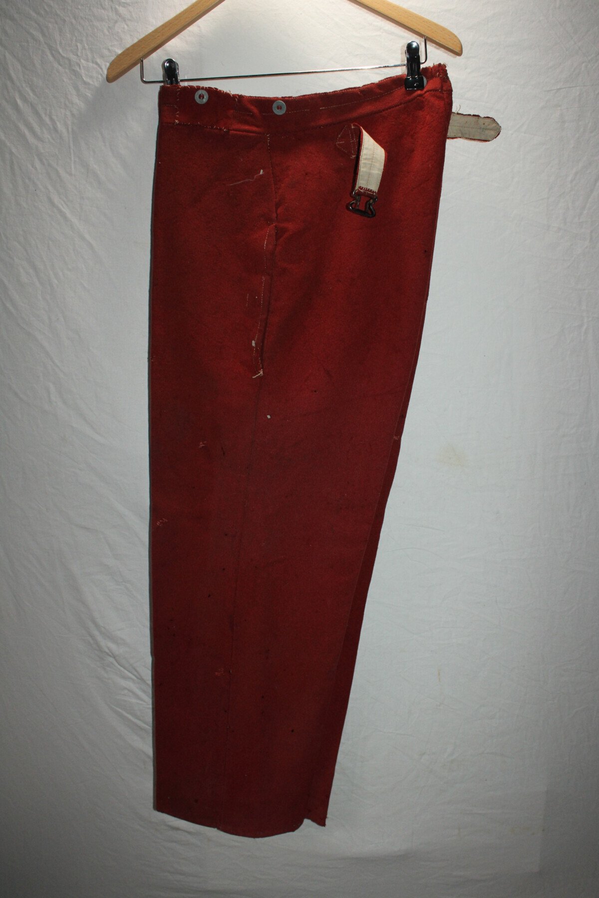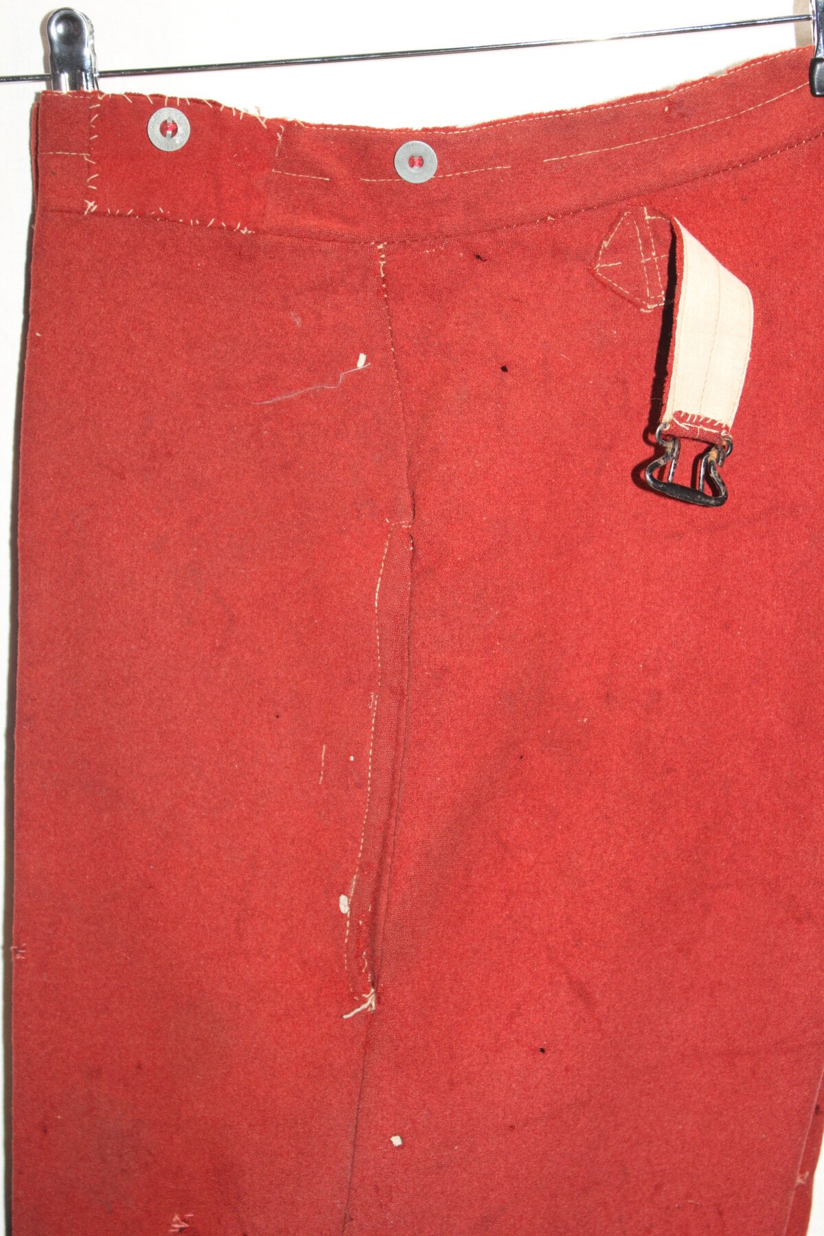 Pantalon garance modèle 1867. Quelque petit trous et léchure de mite, une partie de la martingale coupée. Datés 1912 et régimenté au 115éme de ligne. Elargie a l'arrière. Tour de taille à plat 48cm, longueur totale 102cm, entre jambe 73cm.