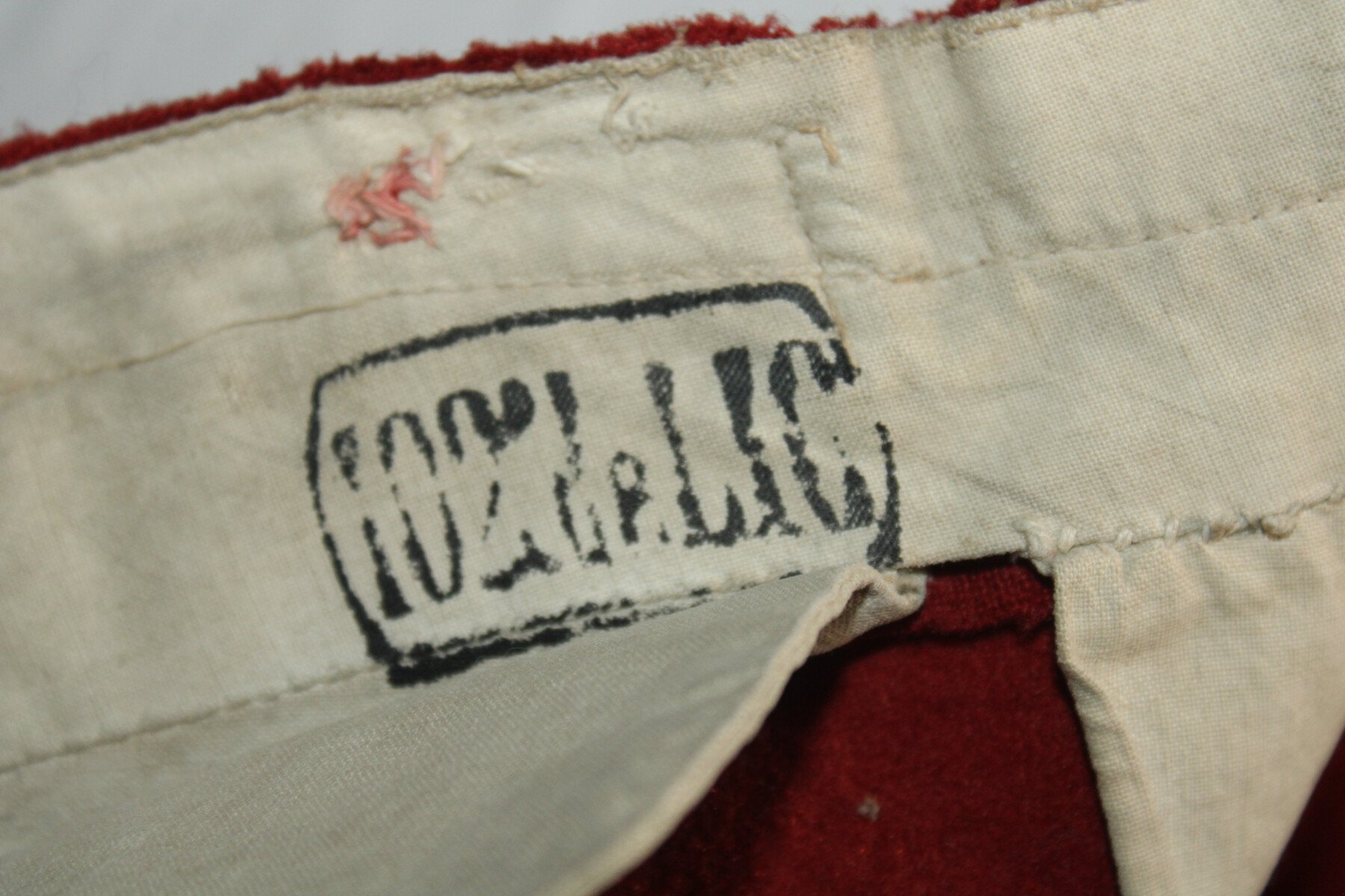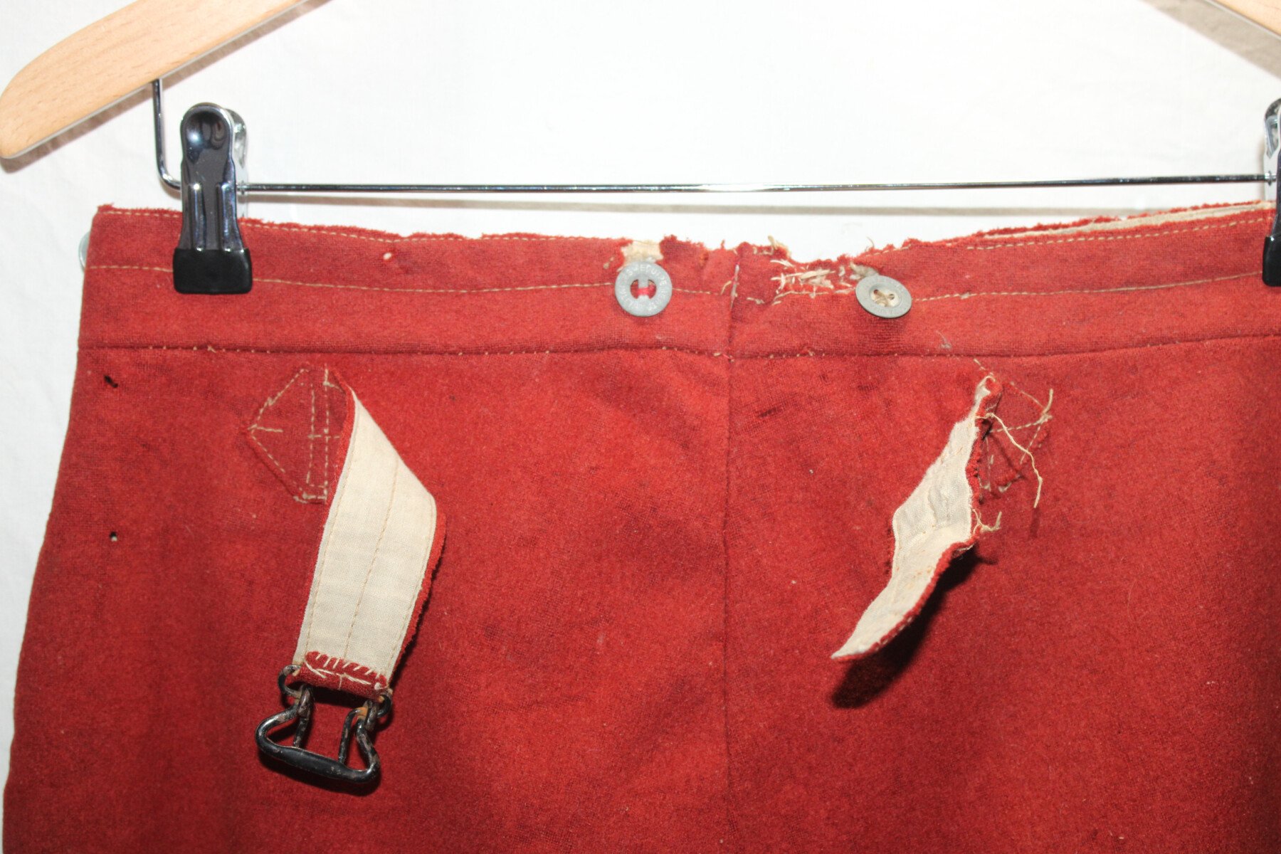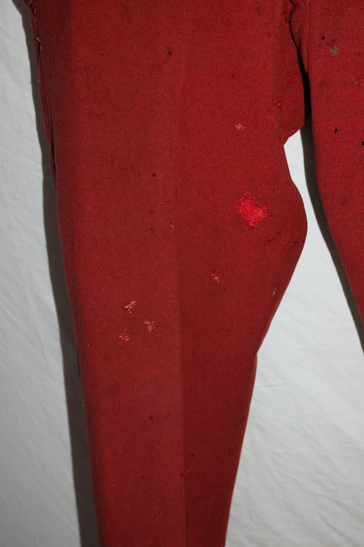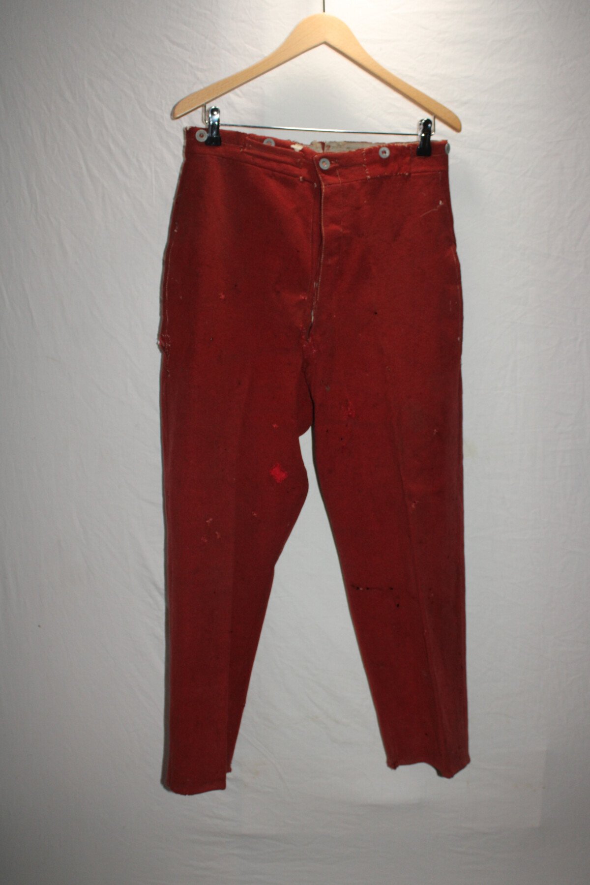 Pantalon garance modèle 1867. Quelque petit trous et léchure de mite, une partie de la martingale coupée. Datés 1912 et régimenté au 115éme de ligne. Elargie a l'arrière. Tour de taille à plat 48cm, longueur totale 102cm, entre jambe 73cm.