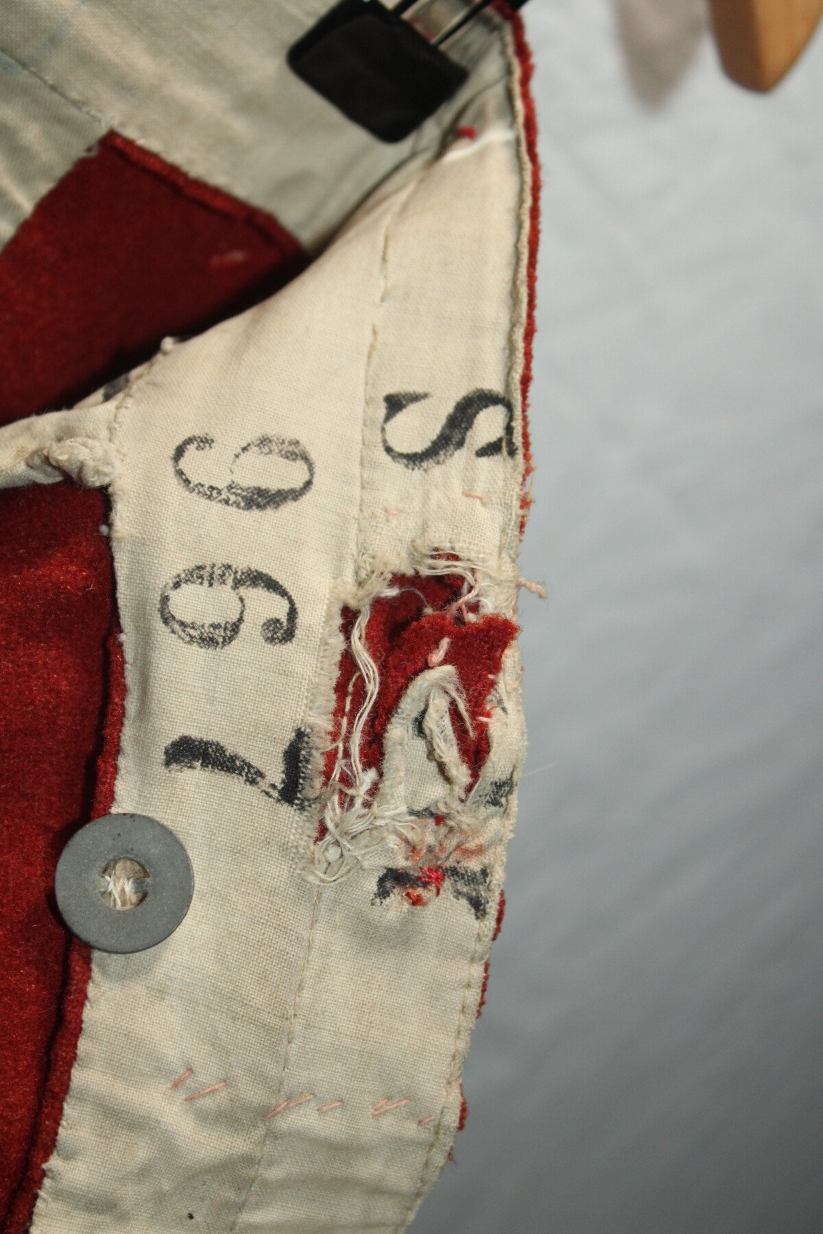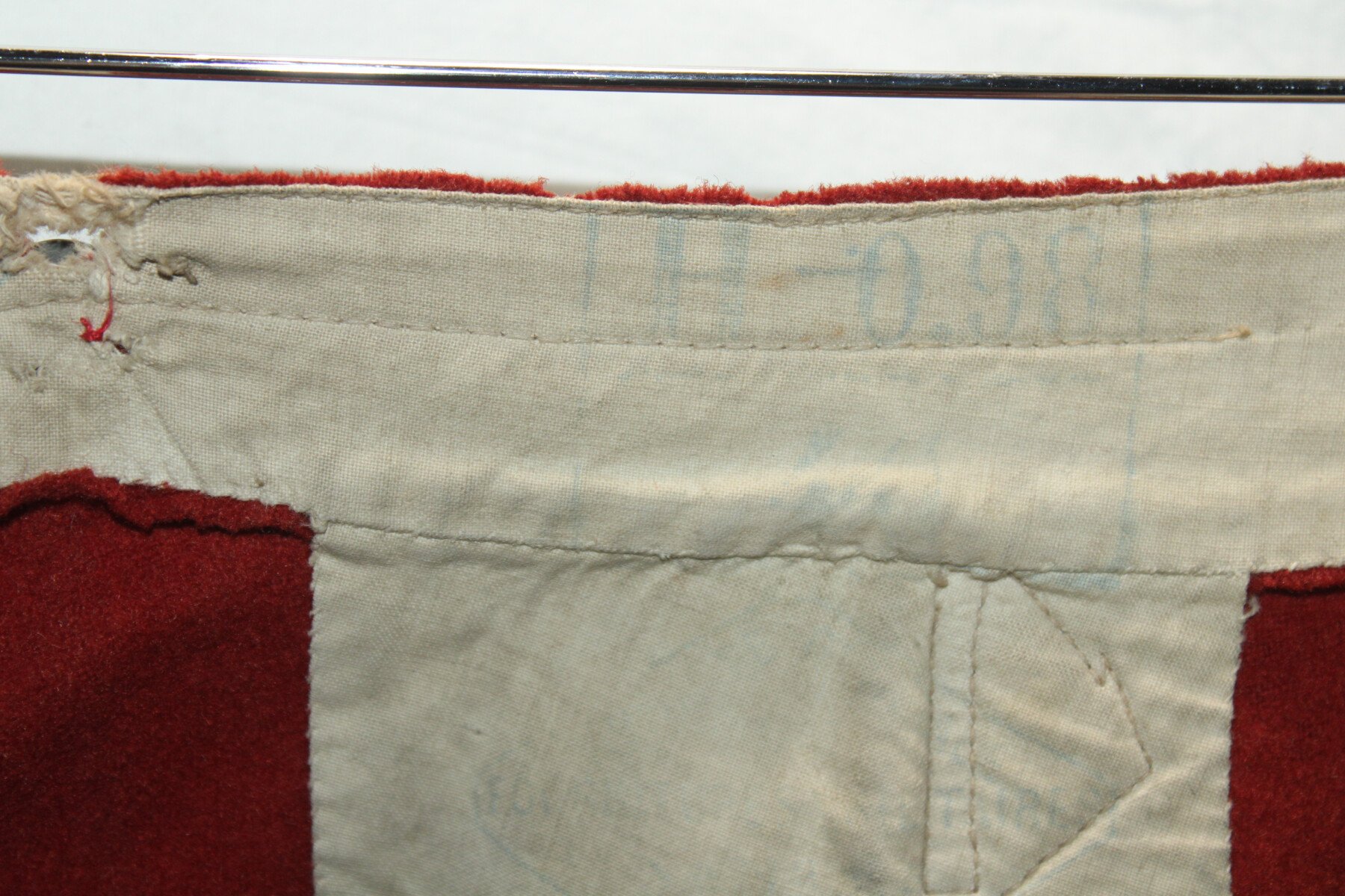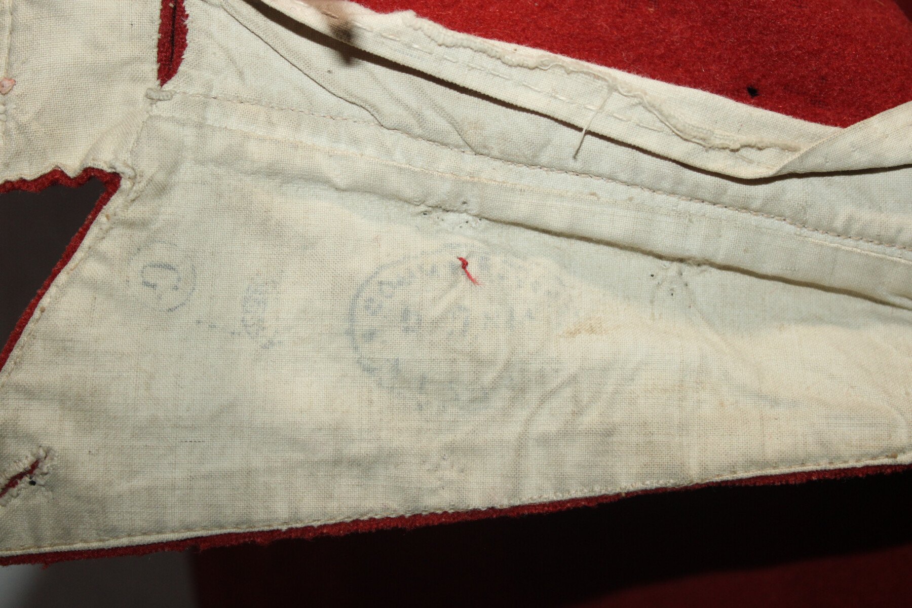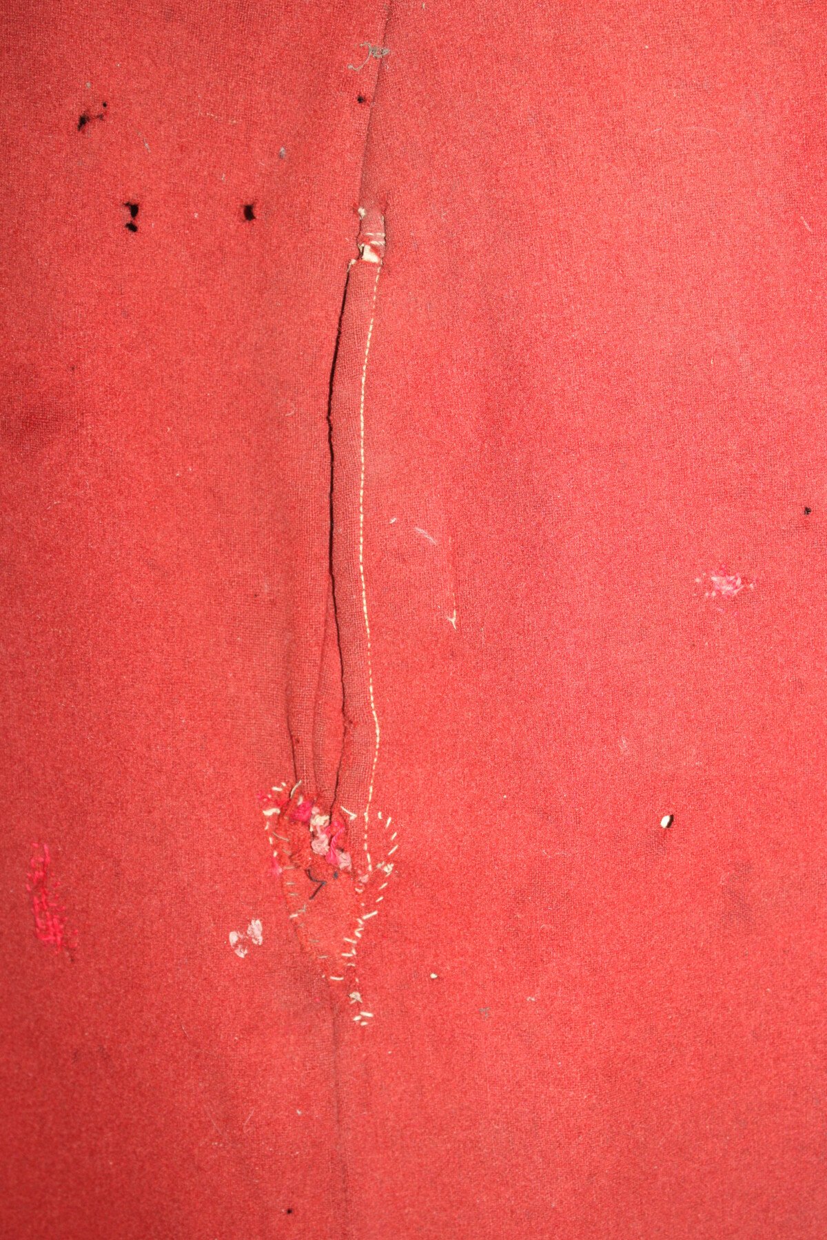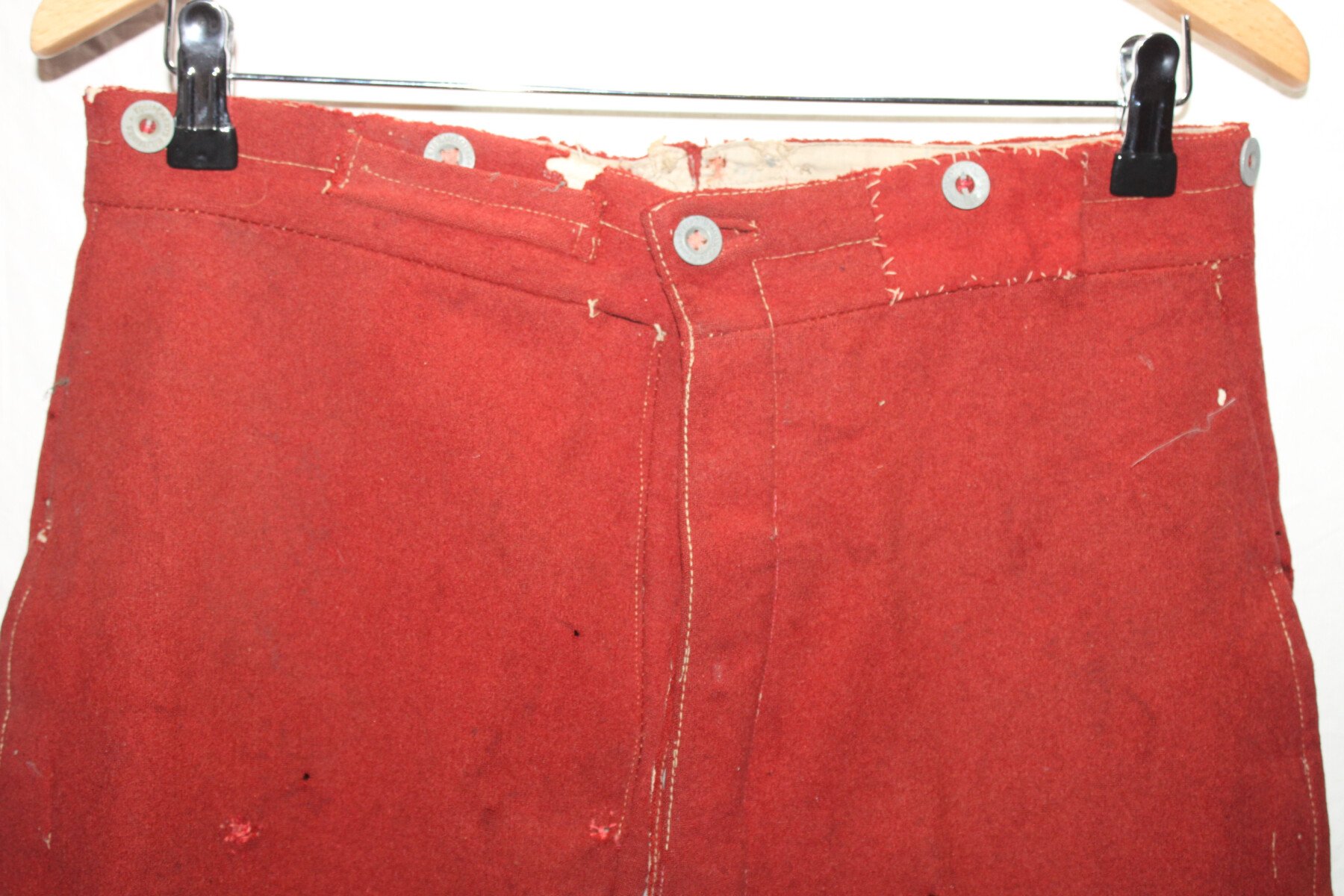 Pantalon garance modèle 1867. Quelque petit trous et léchure de mite, une partie de la martingale coupée. Datés 1912 et régimenté au 115éme de ligne. Elargie a l'arrière. Tour de taille à plat 48cm, longueur totale 102cm, entre jambe 73cm.