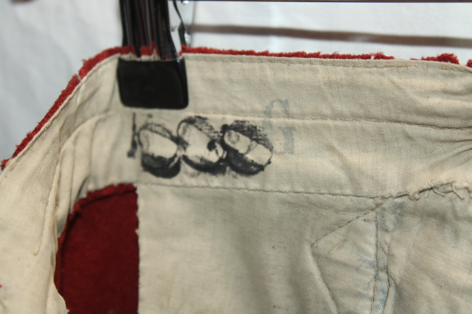 Pantalon garance modèle 1867. Quelque petit trous et léchure de mite, une partie de la martingale coupée. Datés 1912 et régimenté au 115éme de ligne. Elargie a l'arrière. Tour de taille à...