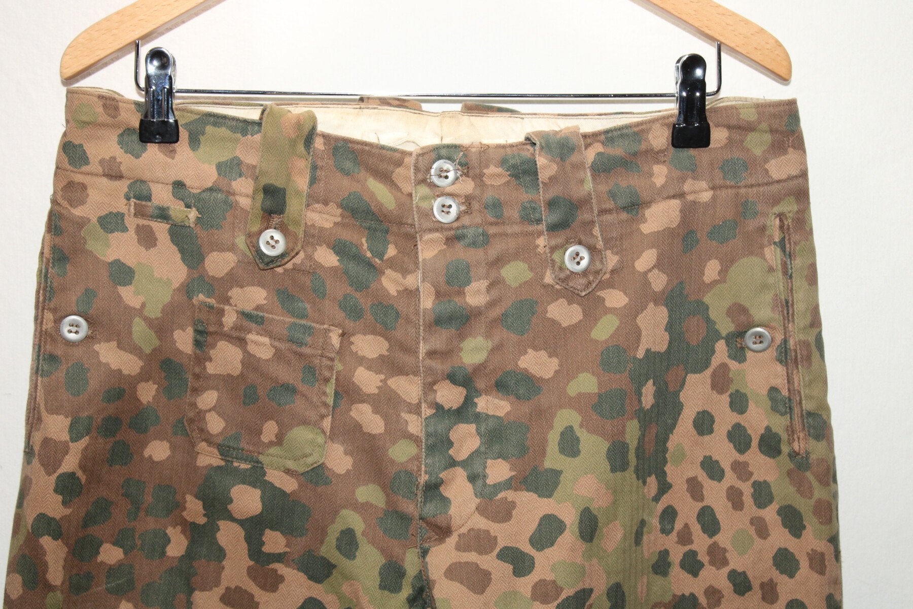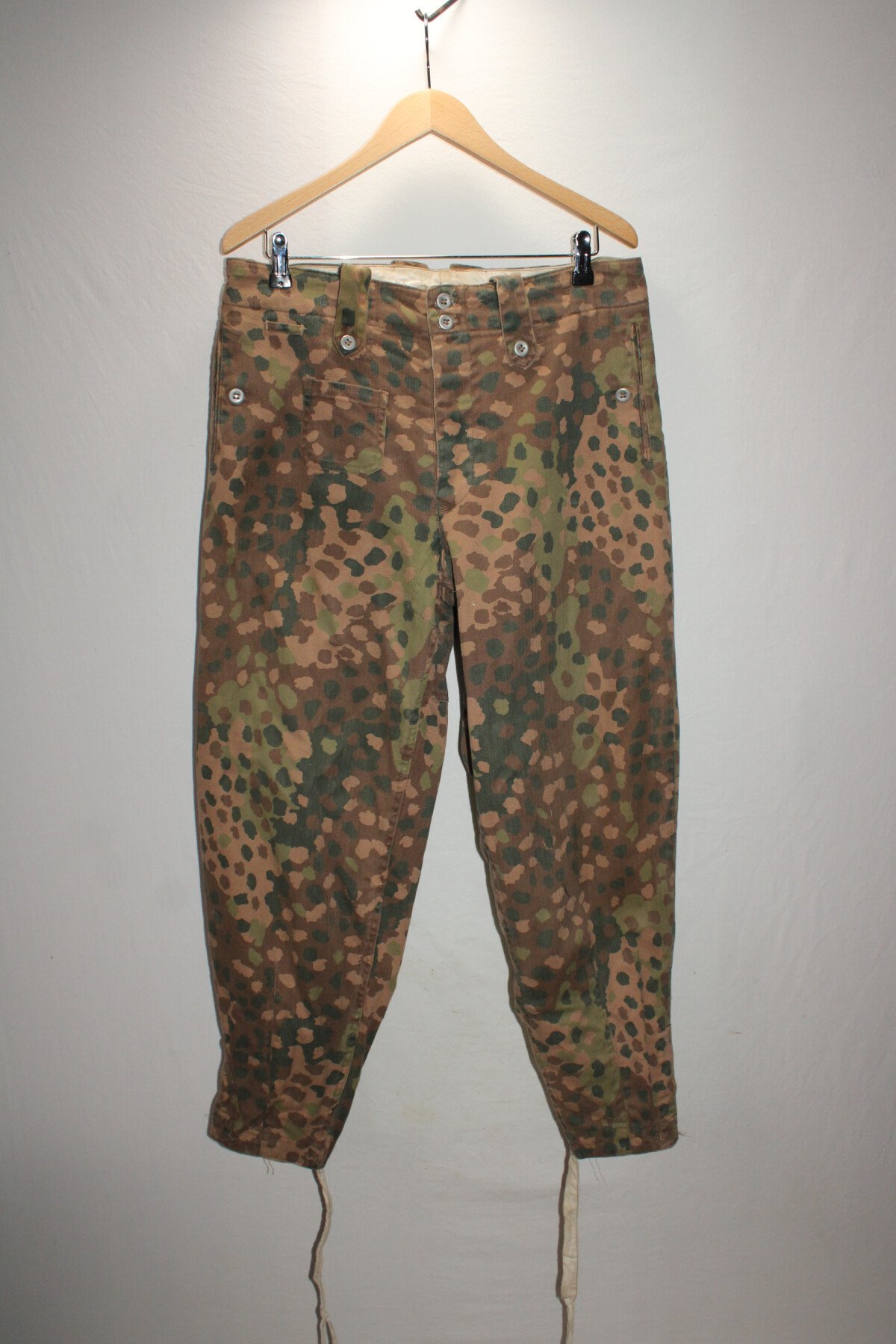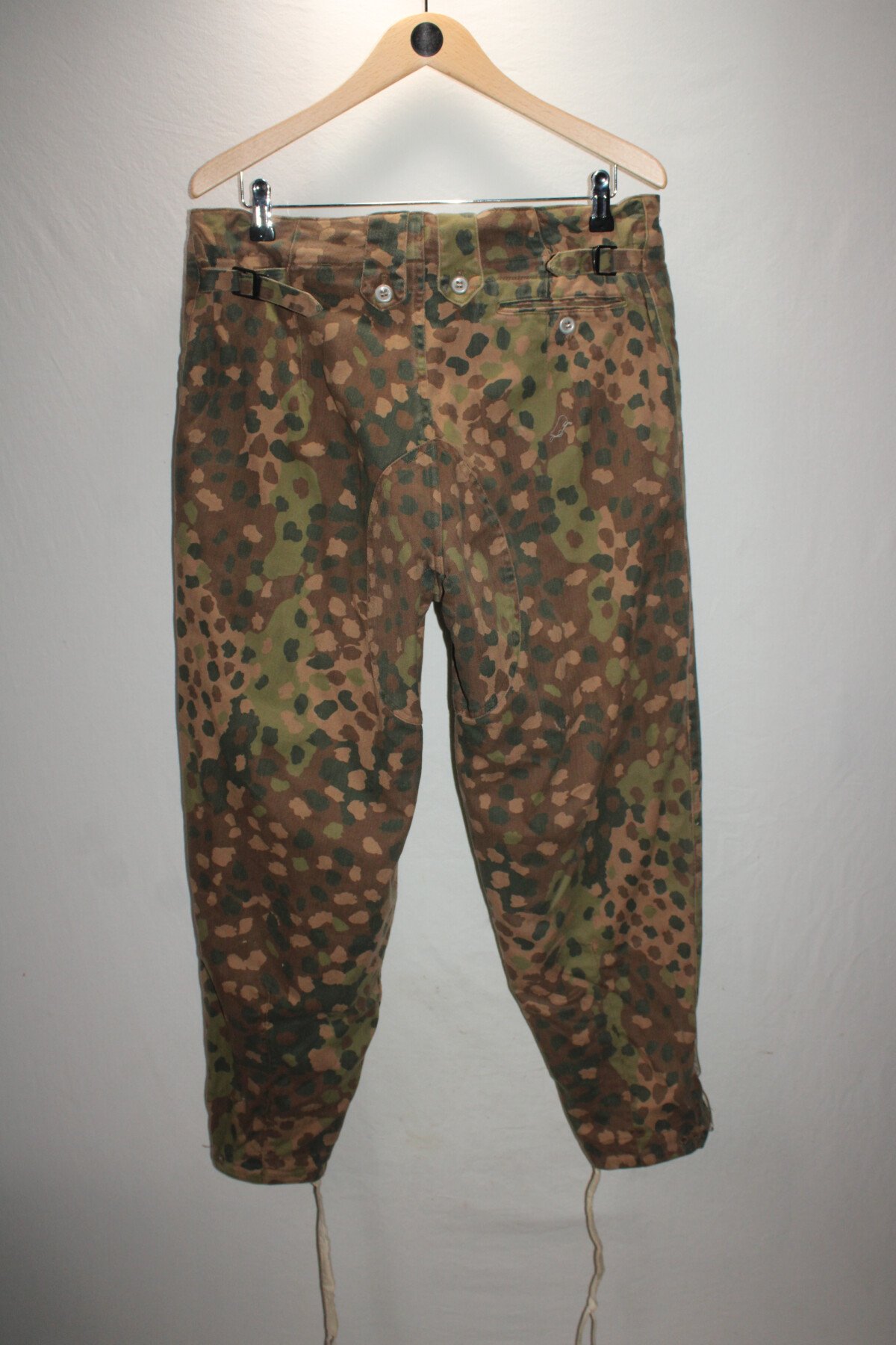 Pantalon de treillis en camouflage petit pois. Porté mais en bon état. Taille: tour de taille 45cm à plat, hauteur total 100cm, hauteur d'entrejambe 74cm.