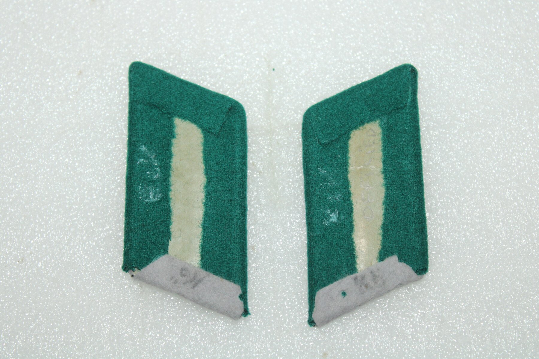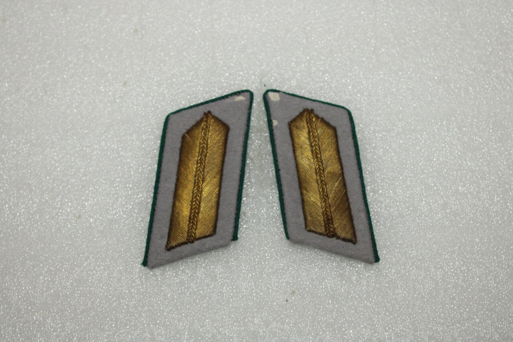 Paire de pattes de col Zonderfuher officier supérieur, à partir du grade de commandant jusqu'à colonel. Fil de cannetille doré brodé sur fond gris avec passepoil vert foncé. Fond gris abimé. Les Zonderfuhrer étaient des civils recrutés comme officiers pour leur compétence dans un domaine où l'armée n'avait pas assez de spécialistes (ingénieurs météo, photographes, radaristes, vétérinaires, médecins, électro-techniciens, etc.).