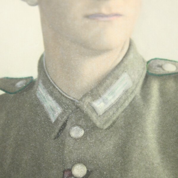 Carte photo colorisée d'un Landser de la Heer arborant médaille du front de l'est , insigne des blessés et insigne de combat 3 jours. Pattes d'épaules vertes, possible Gebirgsjäger ou panzer grenadier.