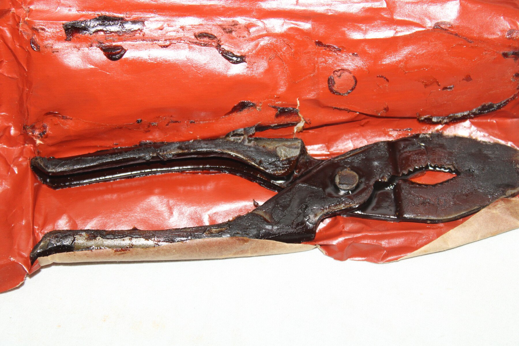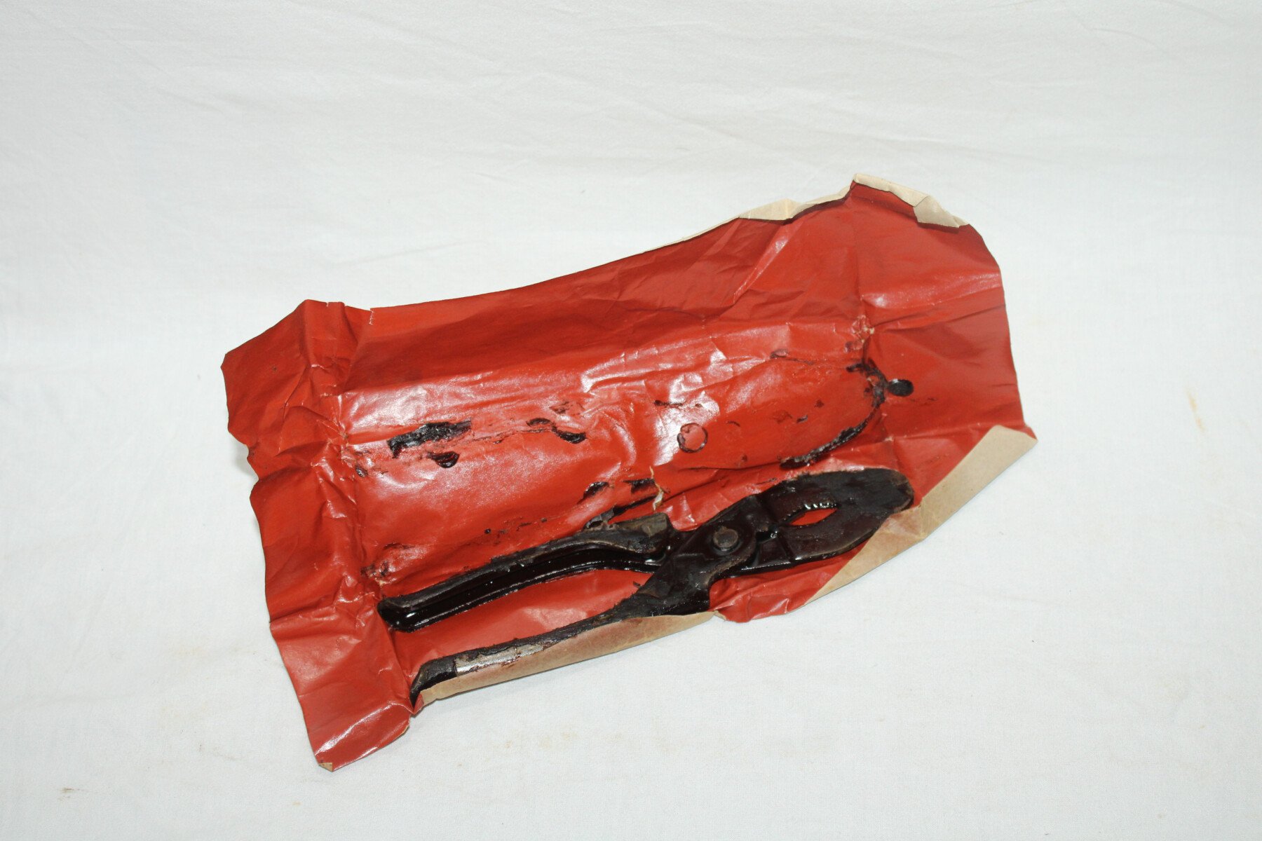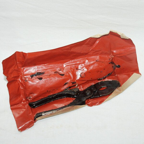 Pince anglaise dans sont papier et graisse de stockage. Marqué WD et de la flèche.