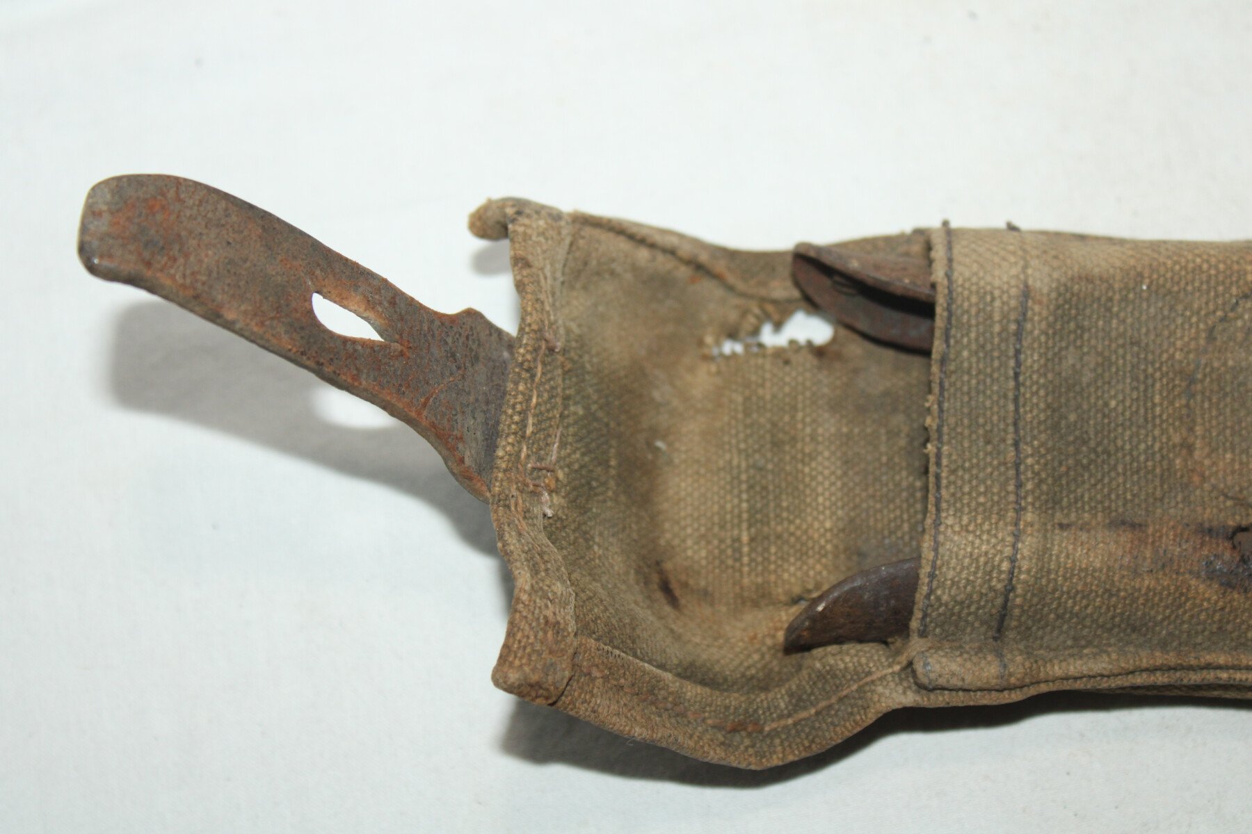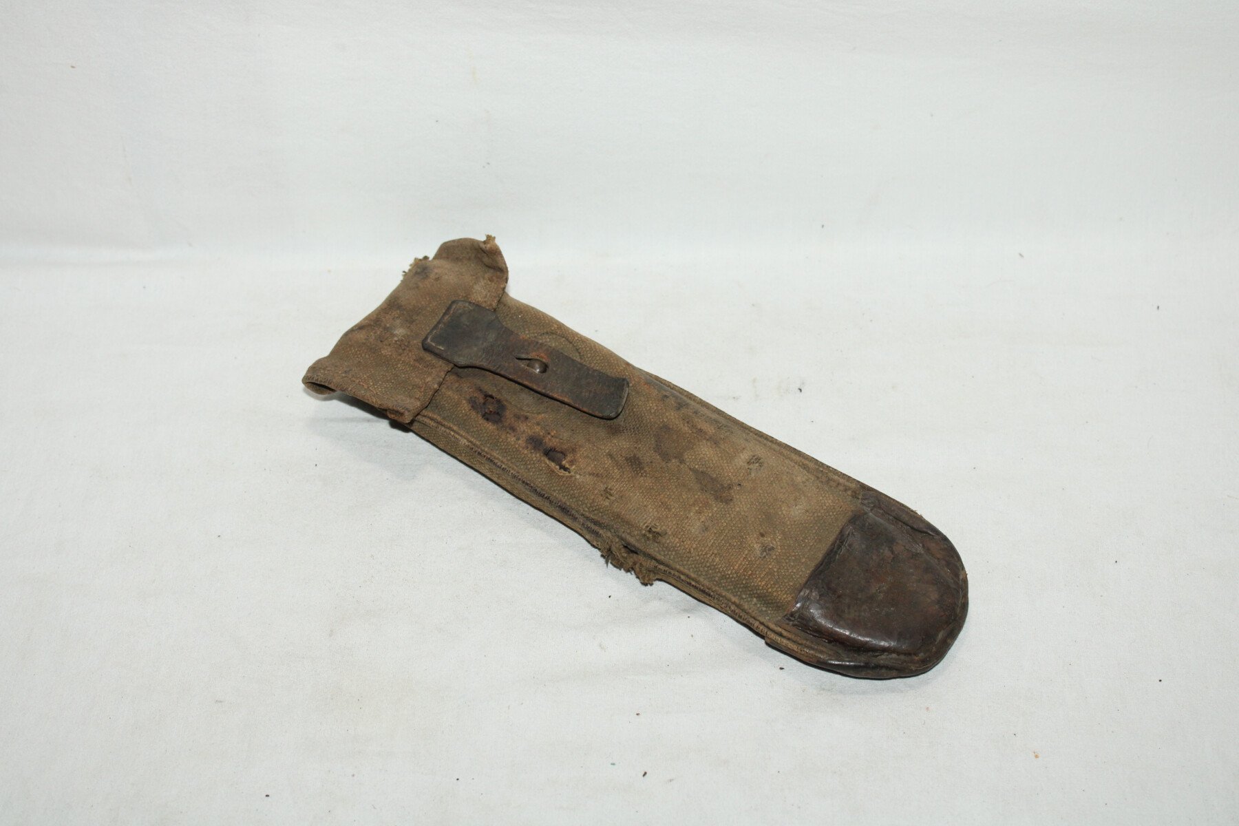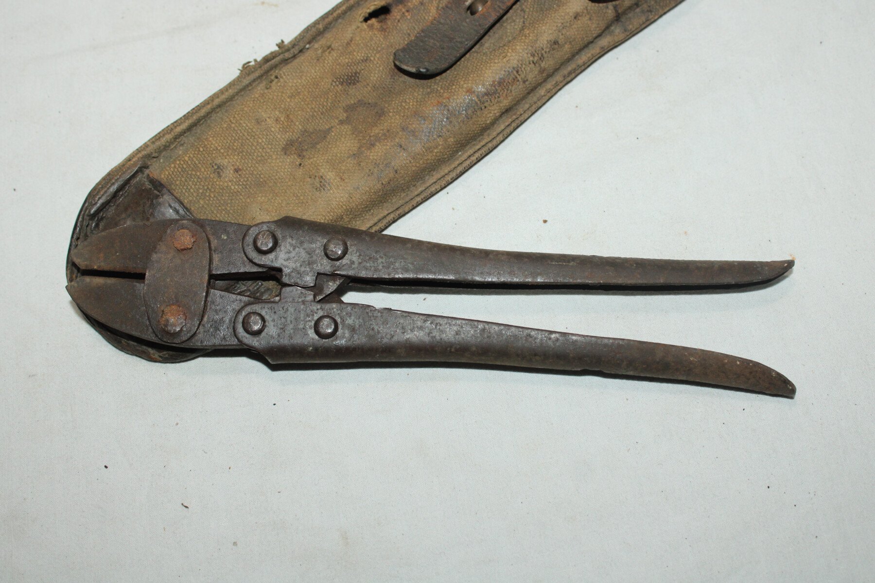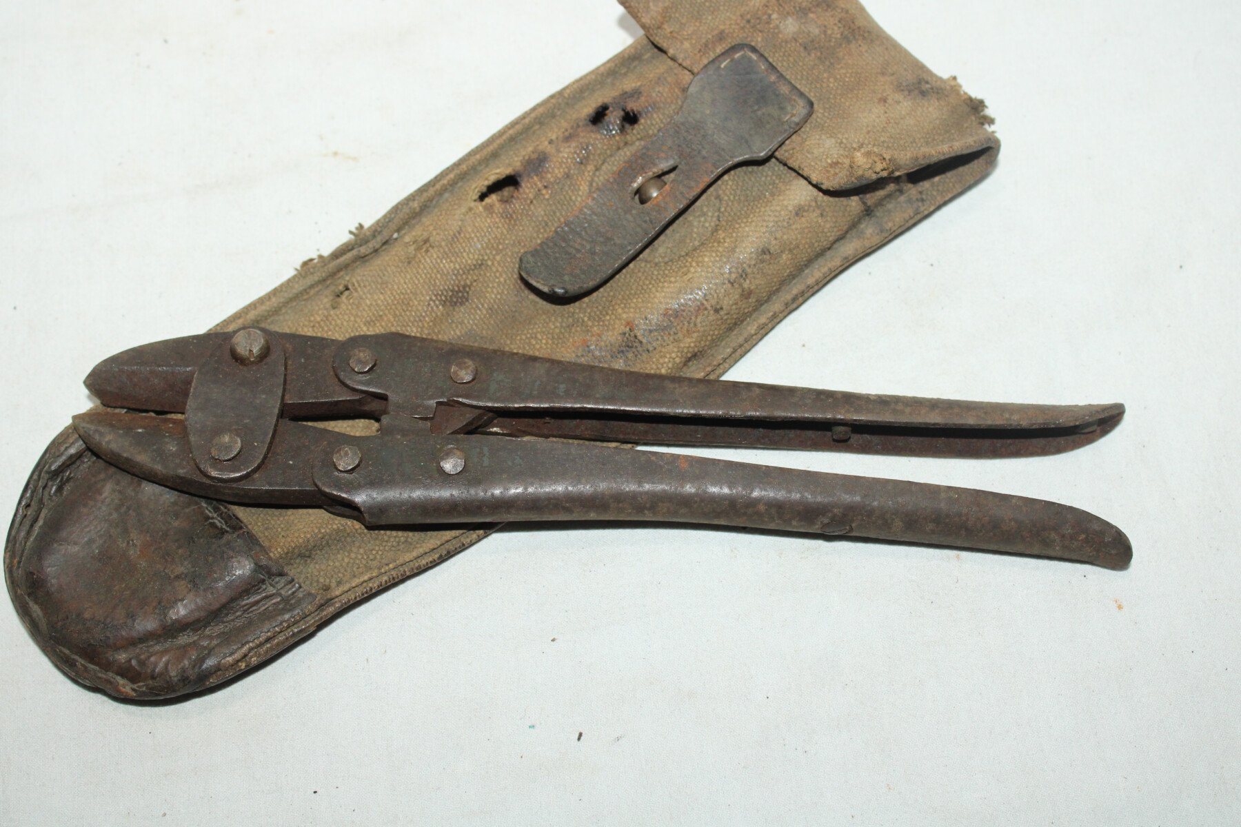 Petite pince coupante dans son étui. Pas de marquages visibles sur la pince. Ressort cassé. Etui en toile et cuir. Plusieurs trous et déchirures. Ensemble homogène trouvé tel que.