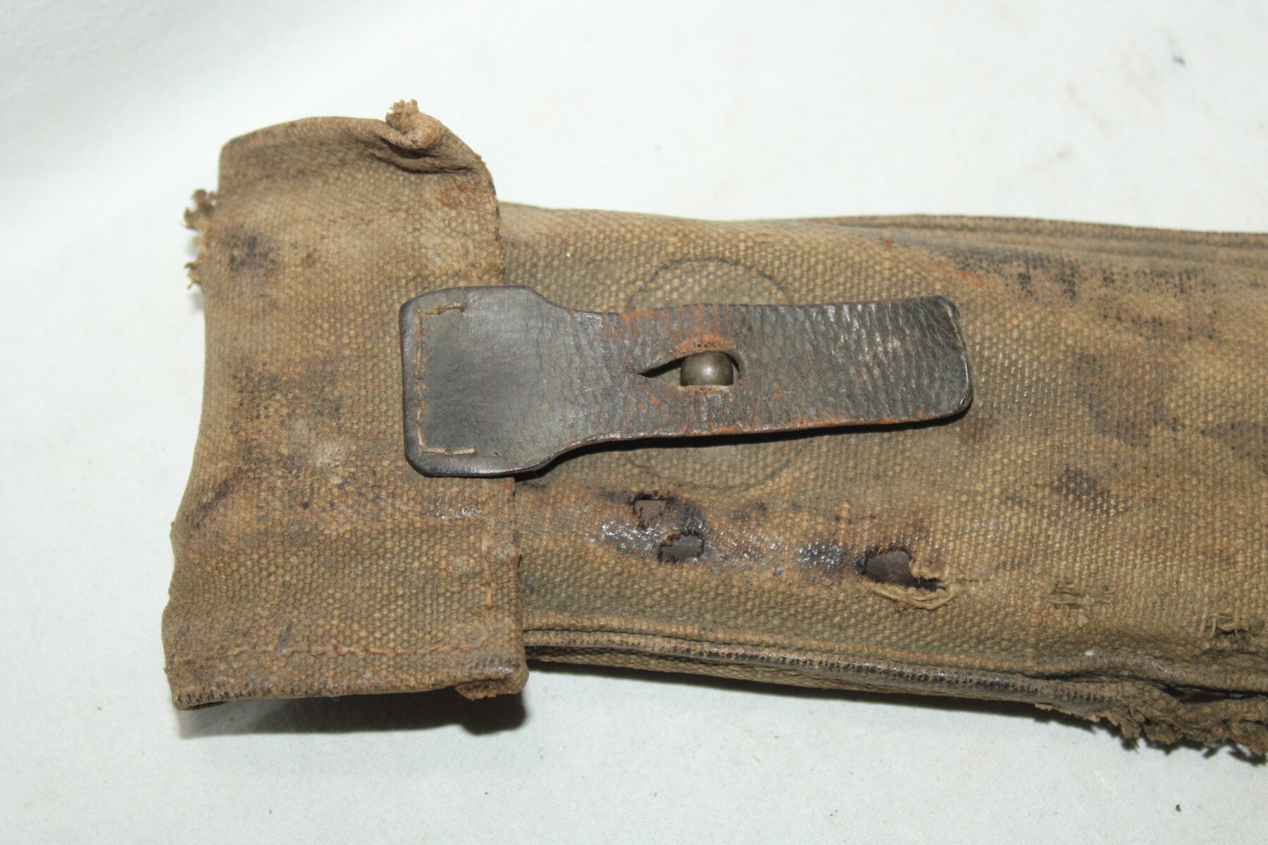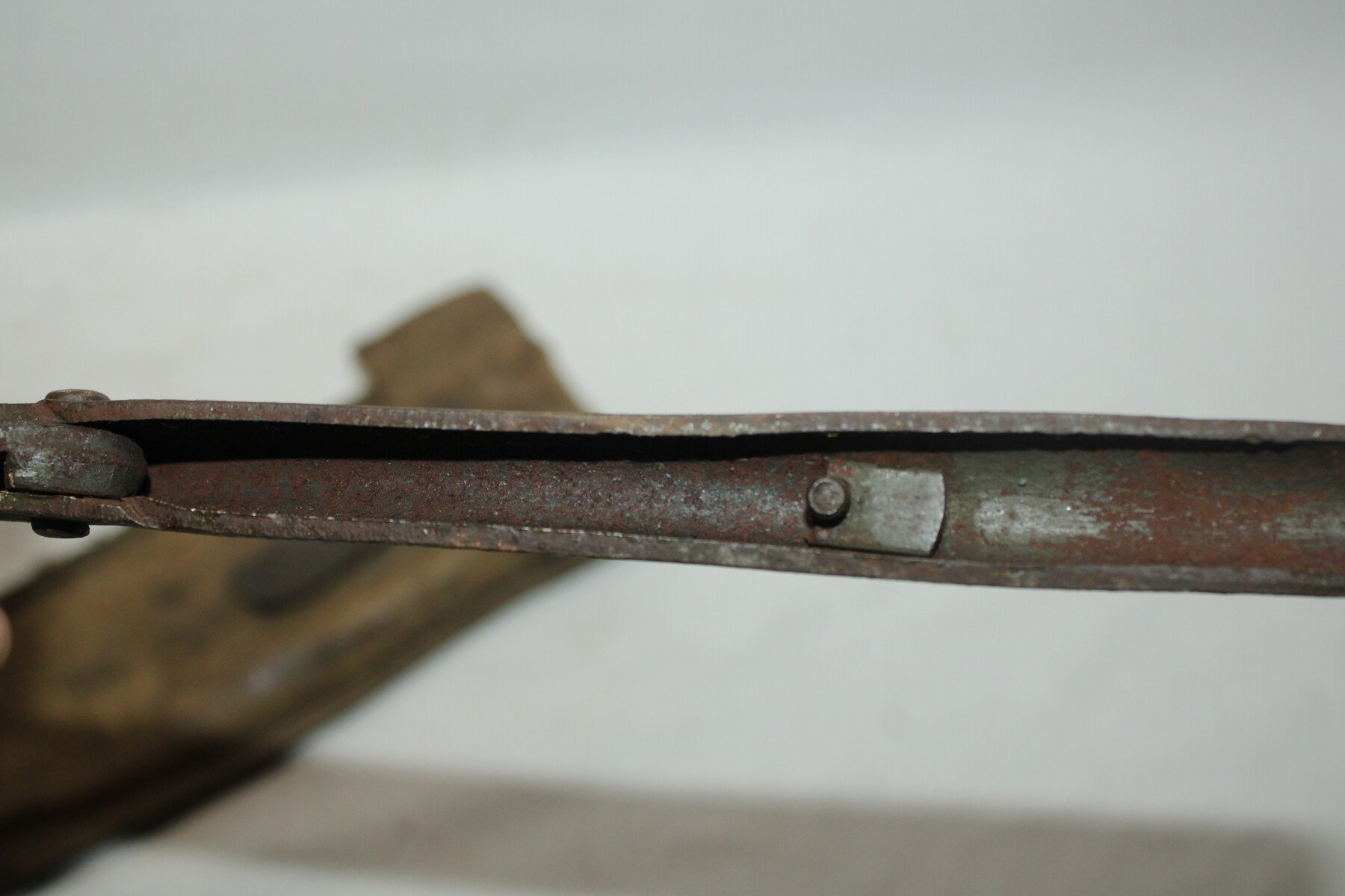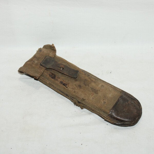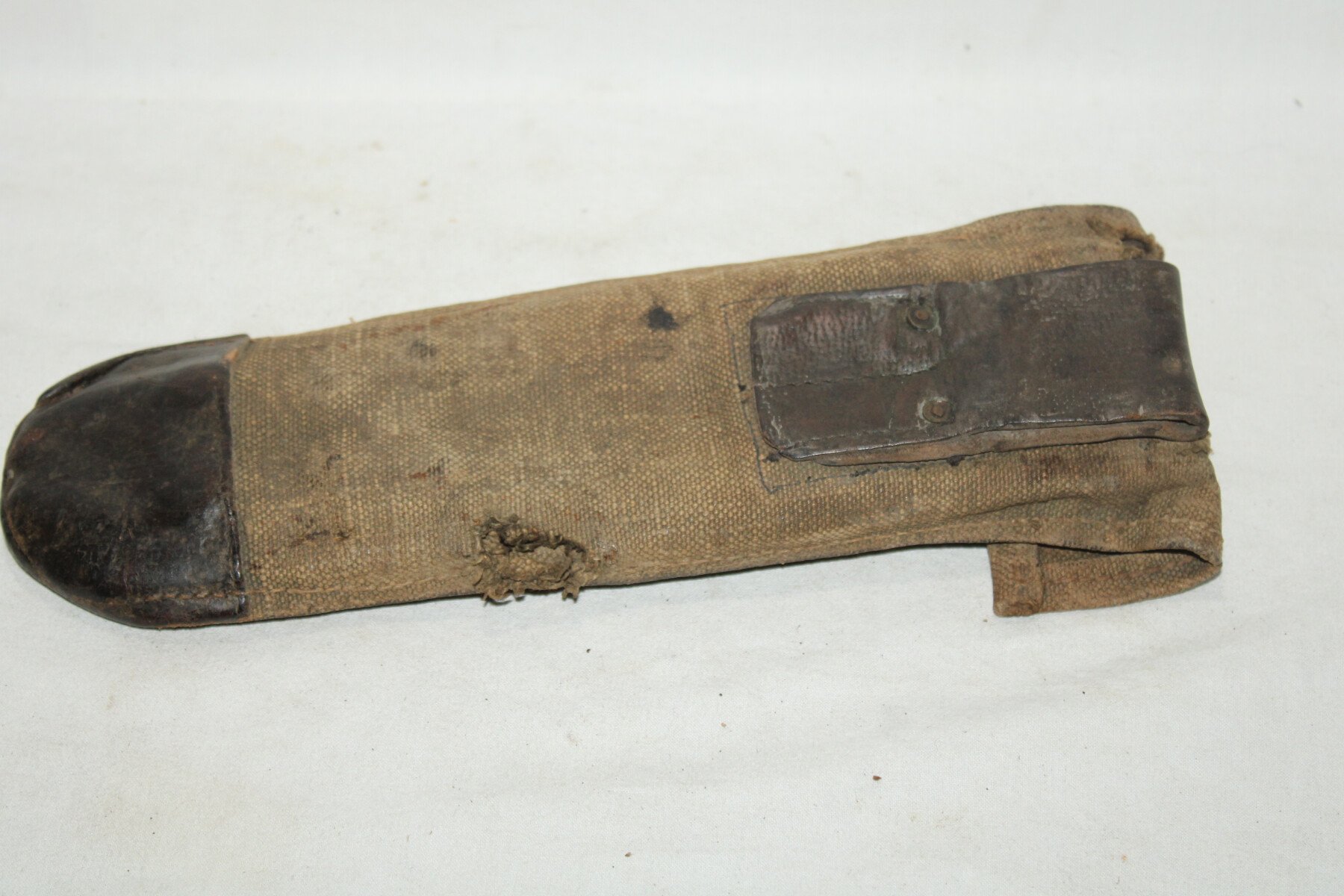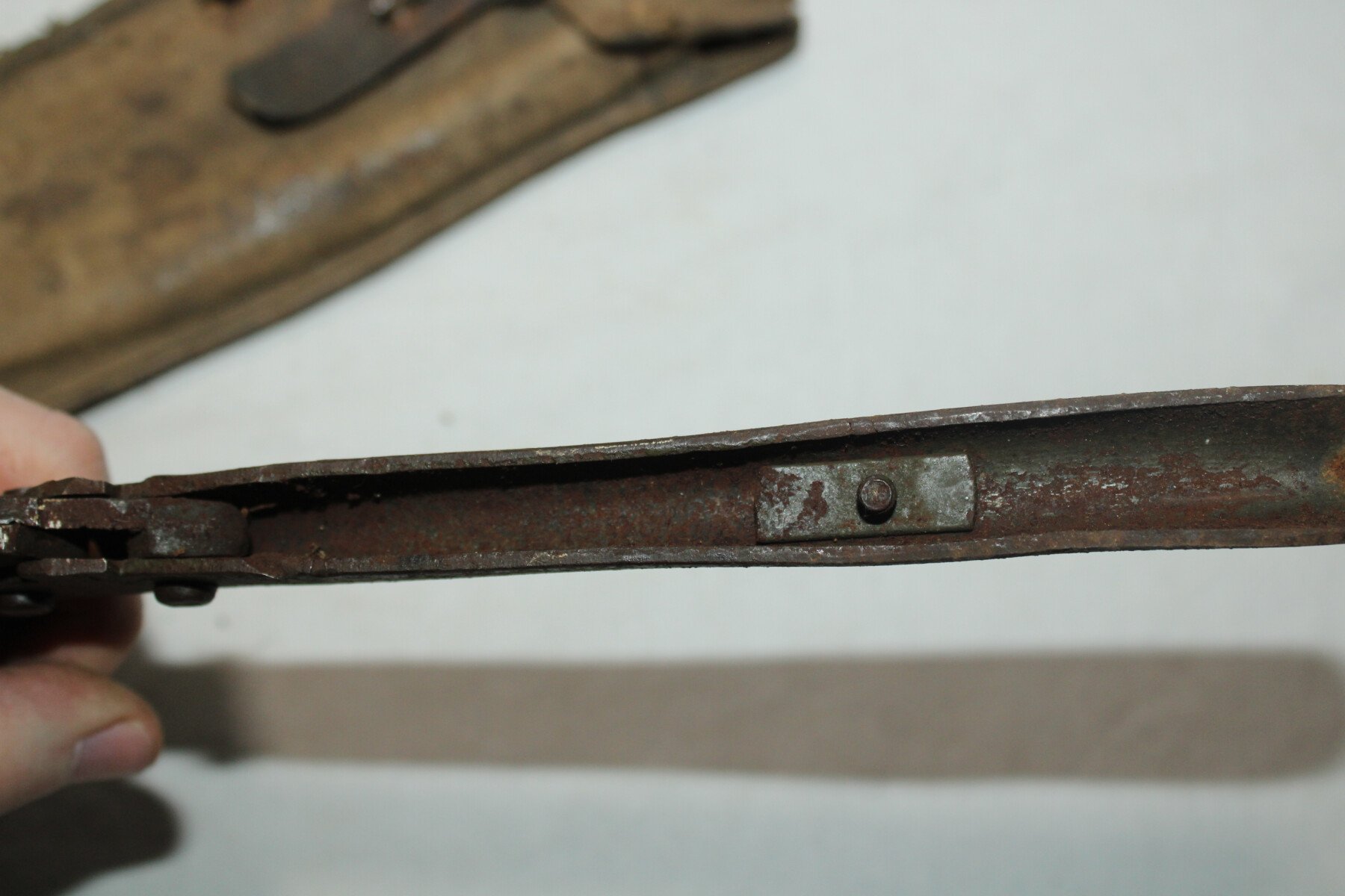 Petite pince coupante dans son étui. Pas de marquages visibles sur la pince. Ressort cassé. Etui en toile et cuir. Plusieurs trous et déchirures. Ensemble homogène trouvé tel que.
