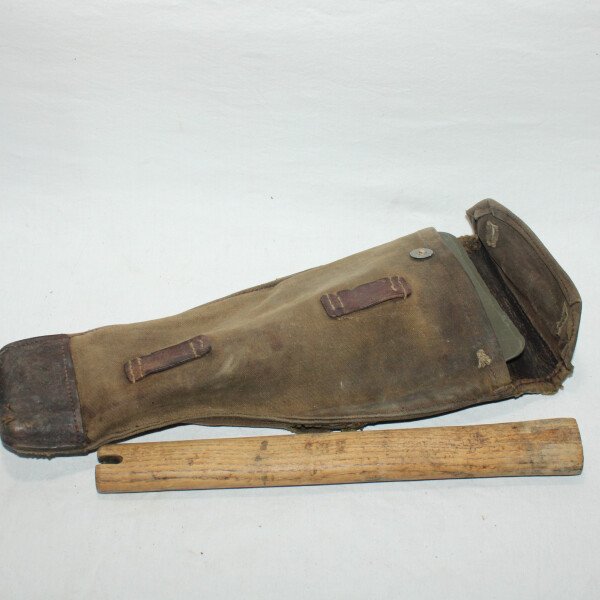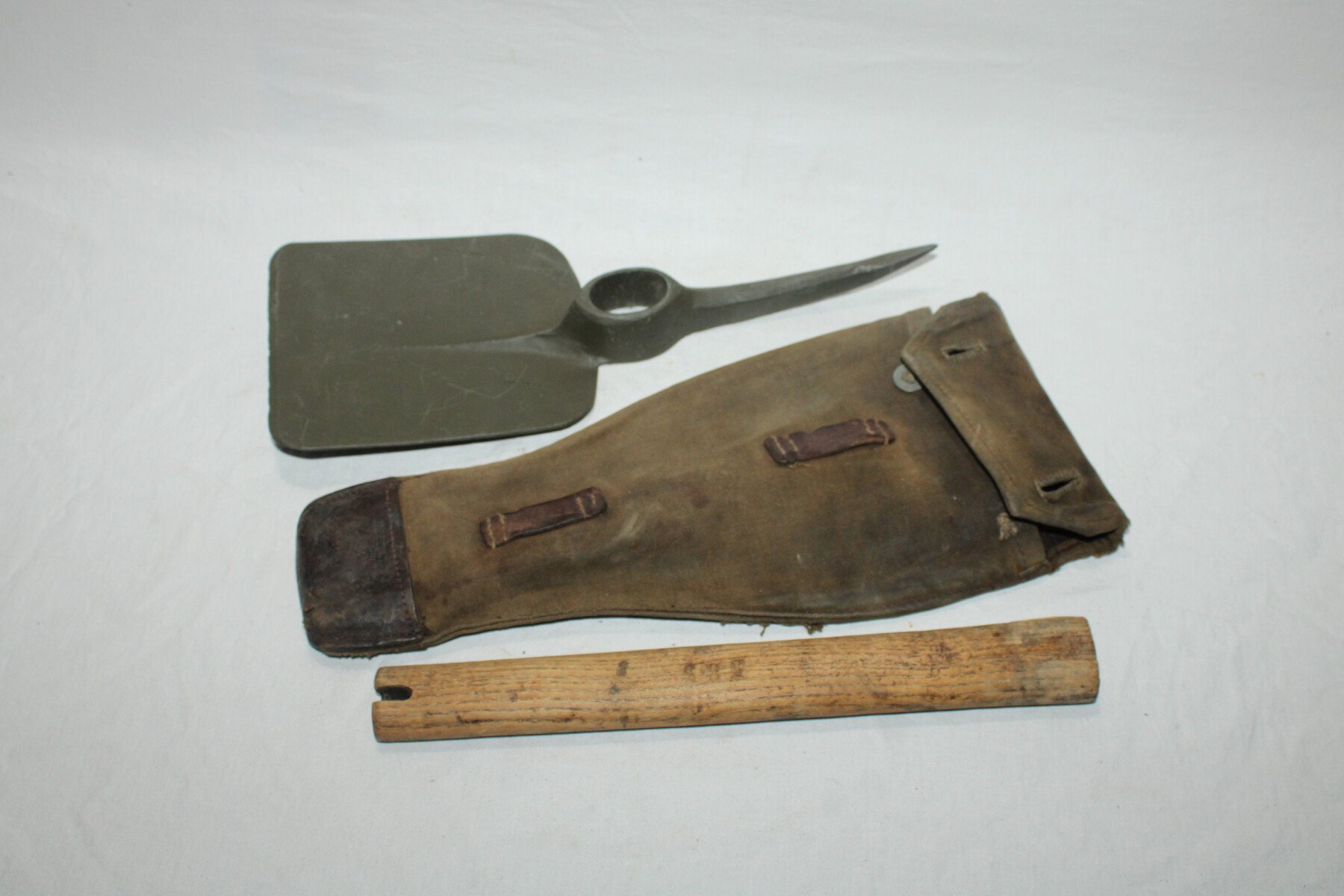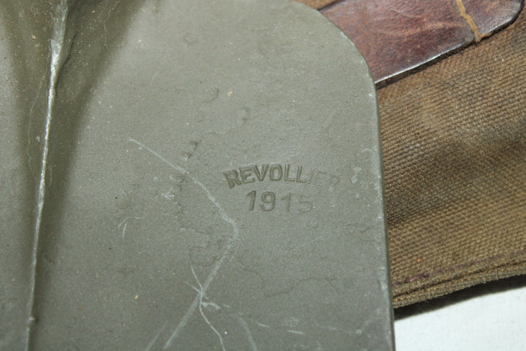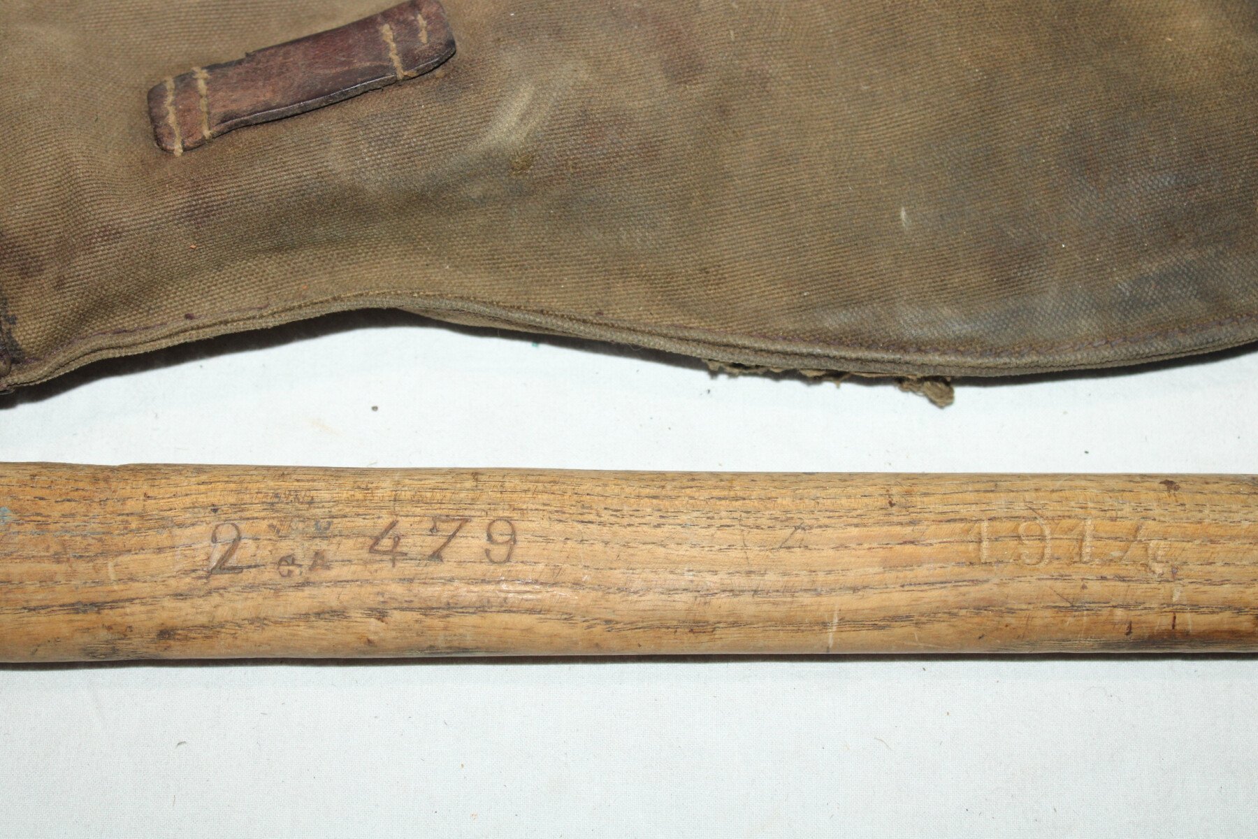 Piochon modèle 1909 dans un étui en toile et cuir des fabrication Ersatz pour palier à l'effort de guerre. Une déchirure sur le coté. Fer repeint en vert daté 1915. Manche marqué 2 GA.