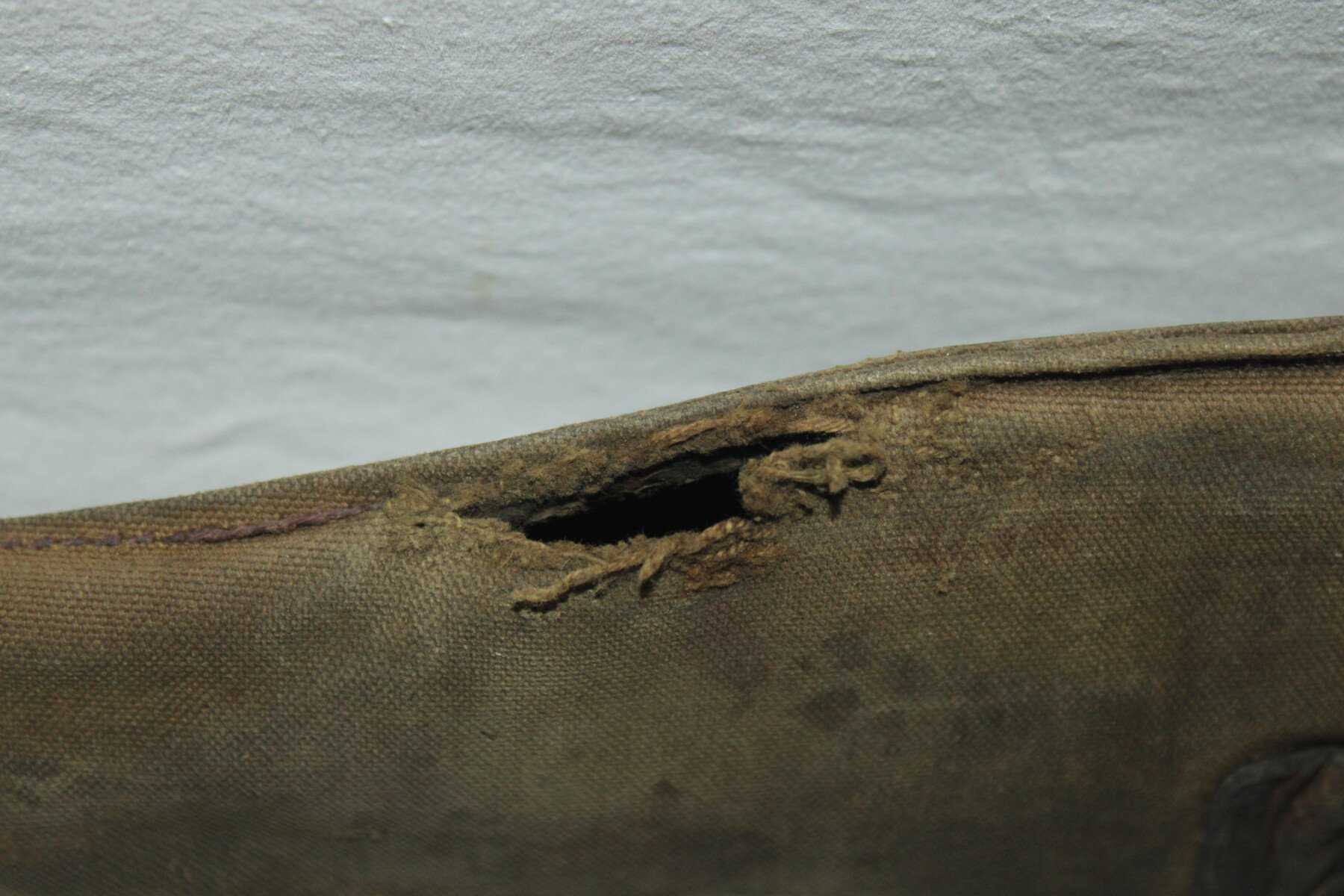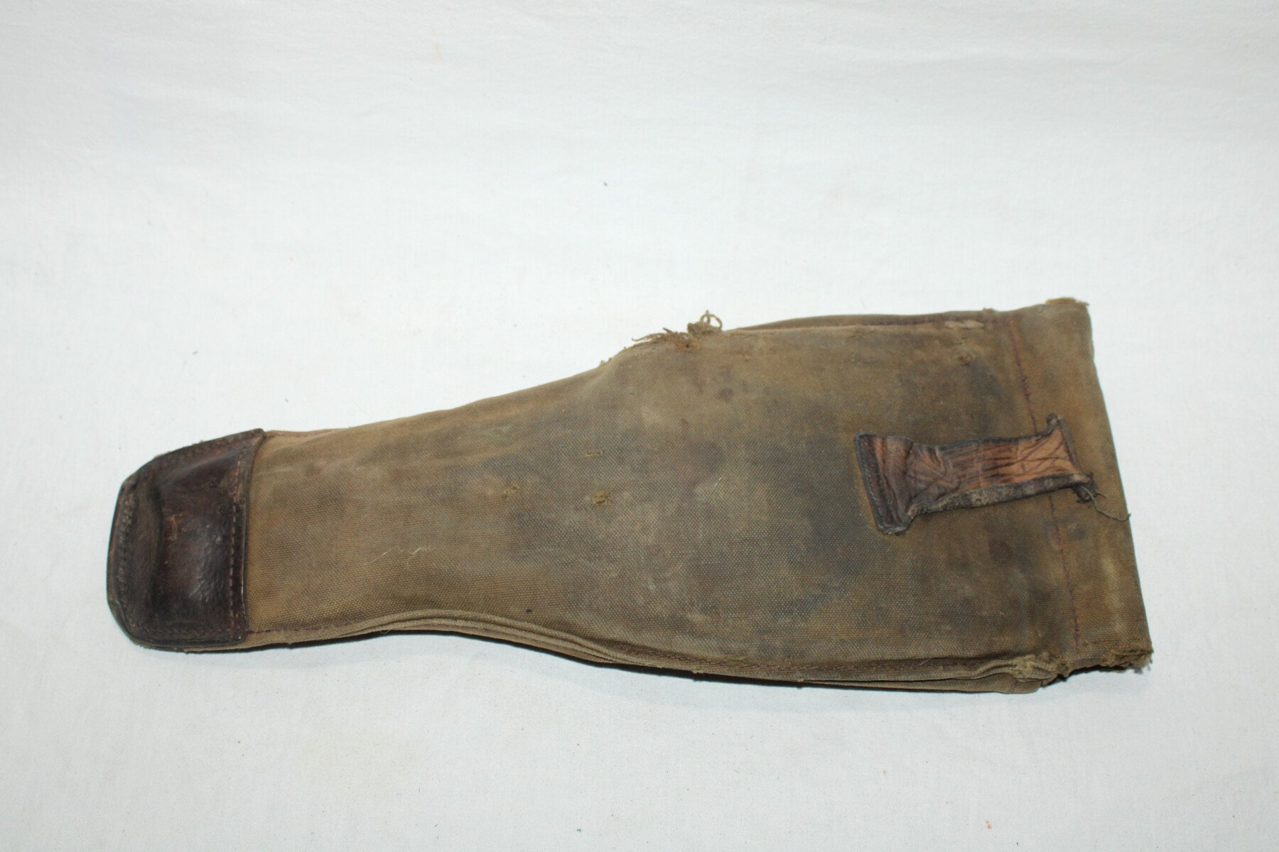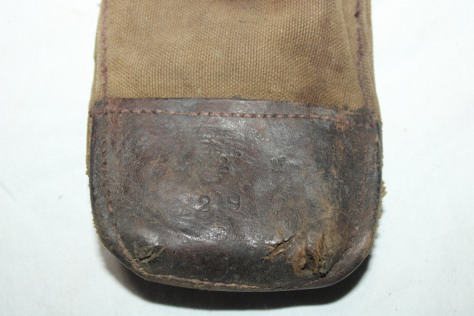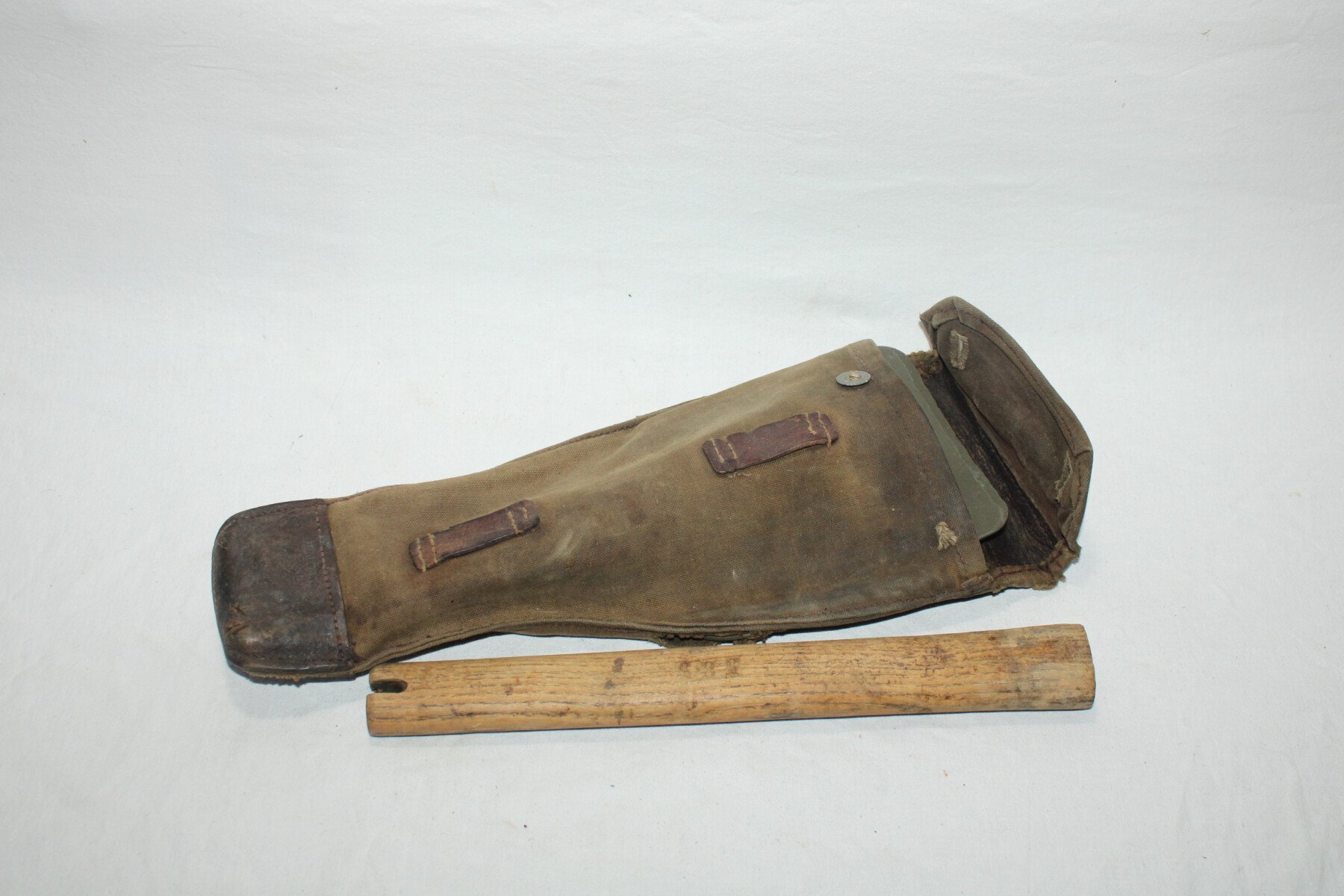 Piochon modèle 1909 dans un étui en toile et cuir des fabrication Ersatz pour palier à l'effort de guerre. Une déchirure sur le coté. Fer repeint en vert daté 1915. Manche marqué 2 GA.