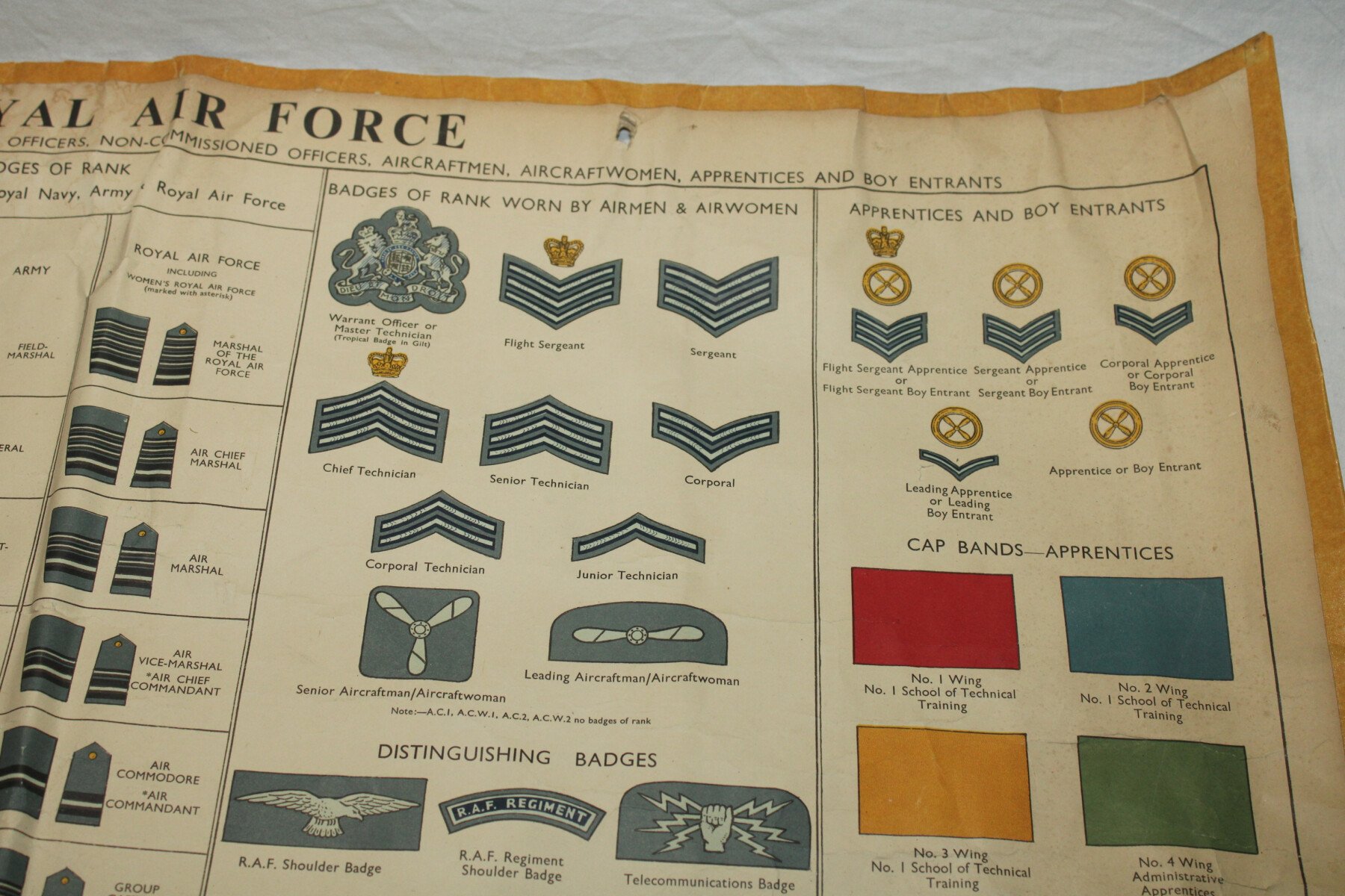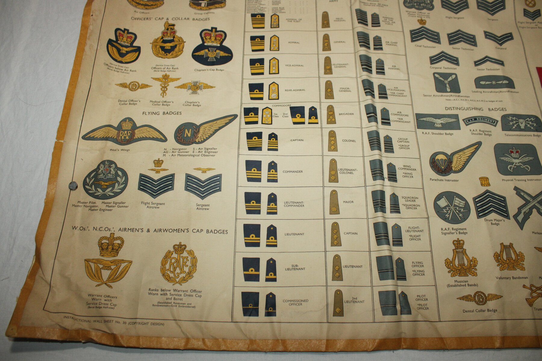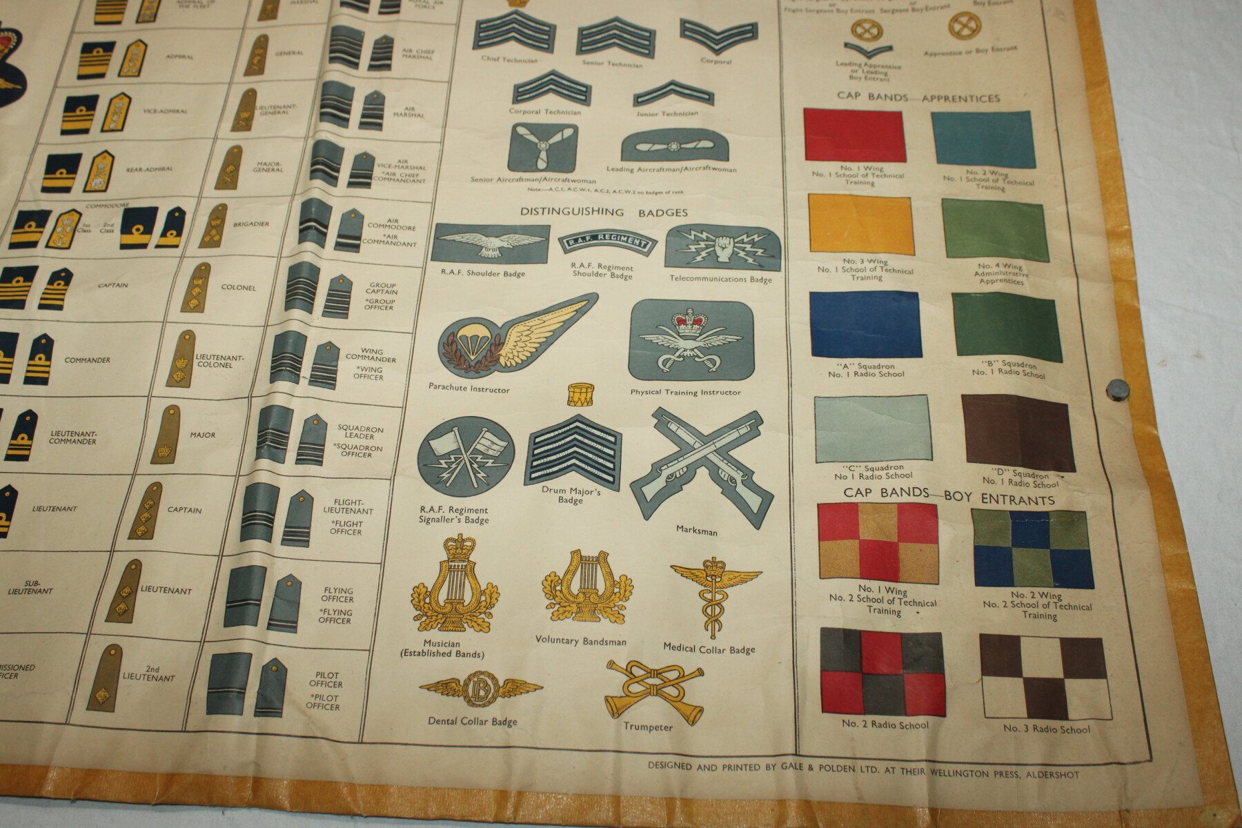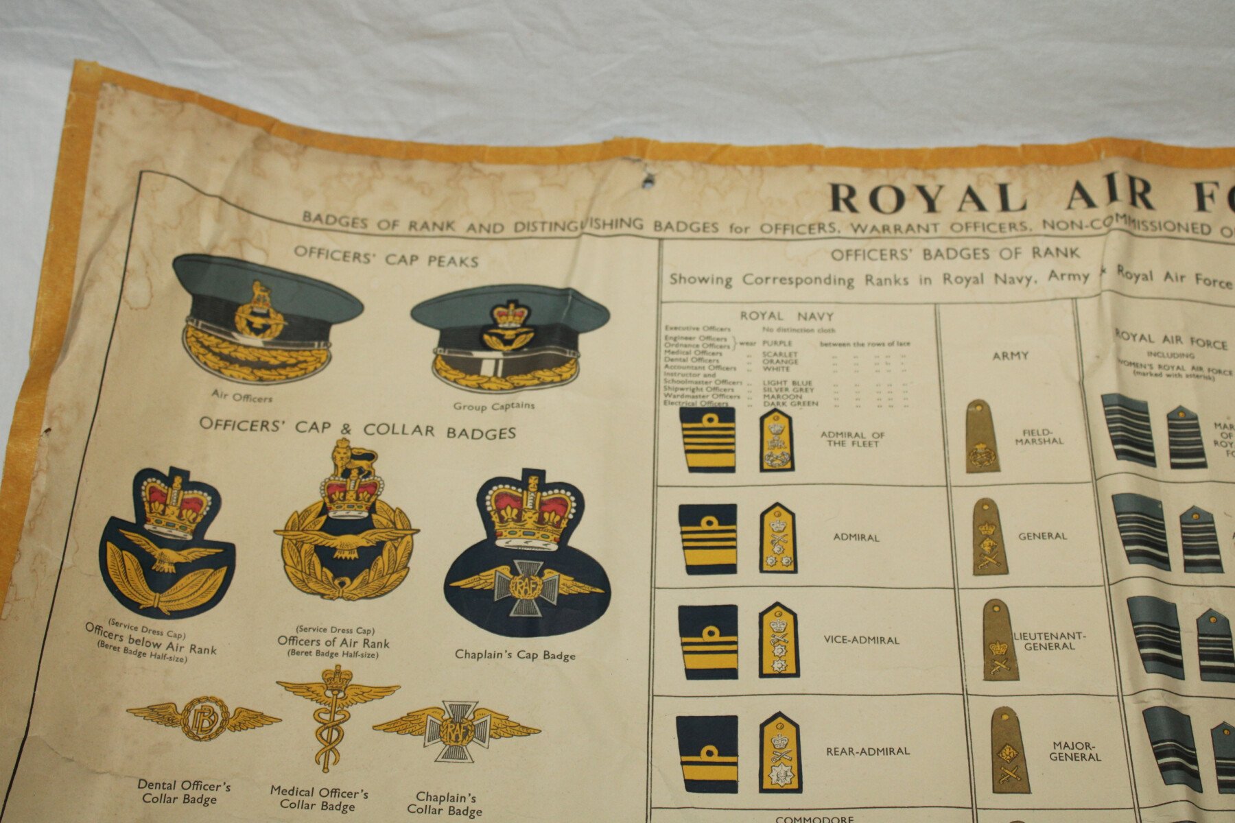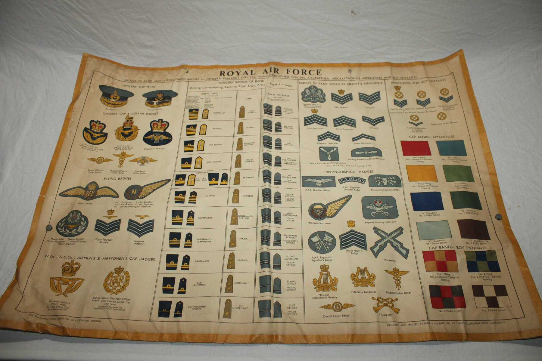 Planche d'instruction en toile sur les différents grades et insignes de la royal air force britannique. Taille 75.5X53 cm. Quelque petite déchirure.