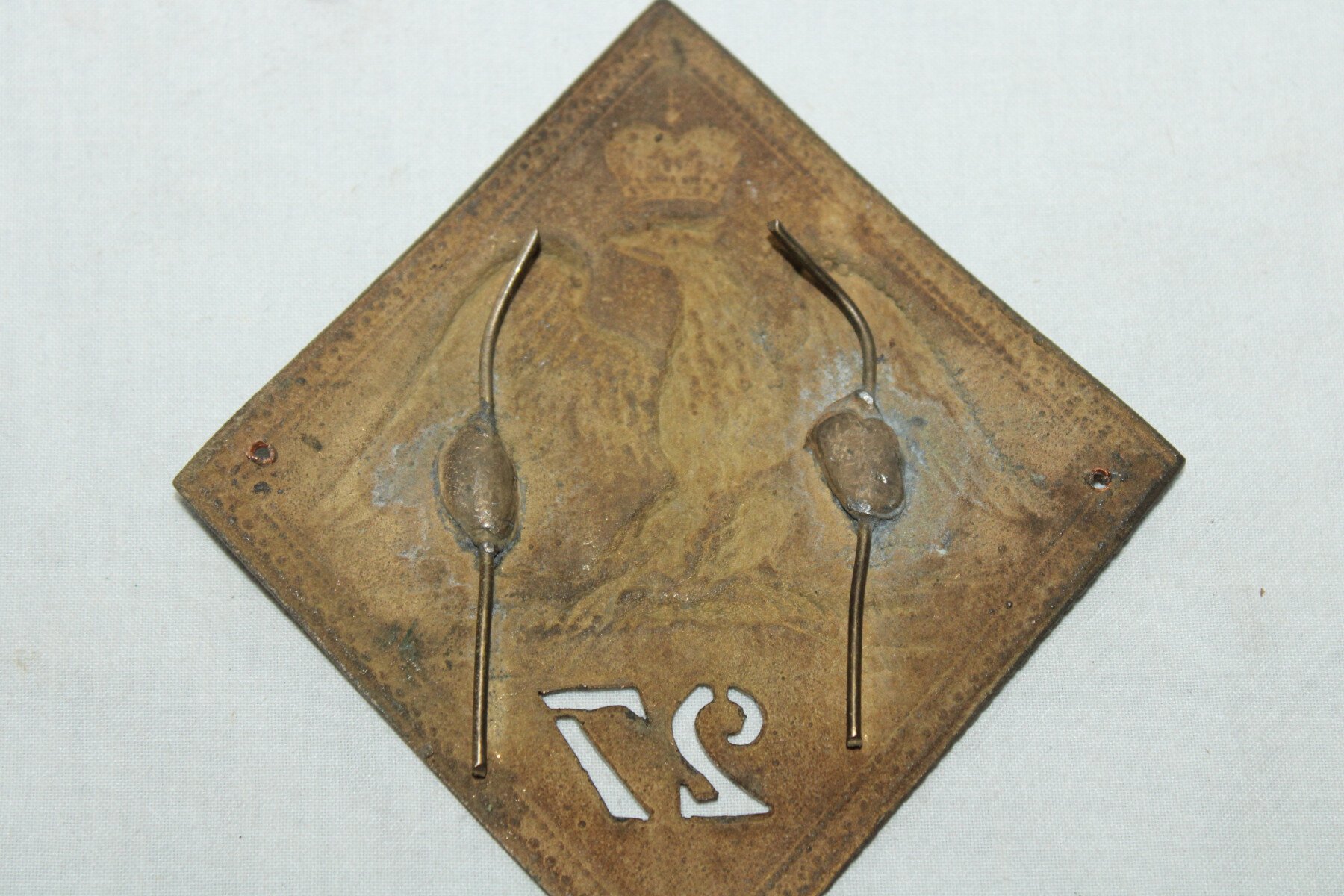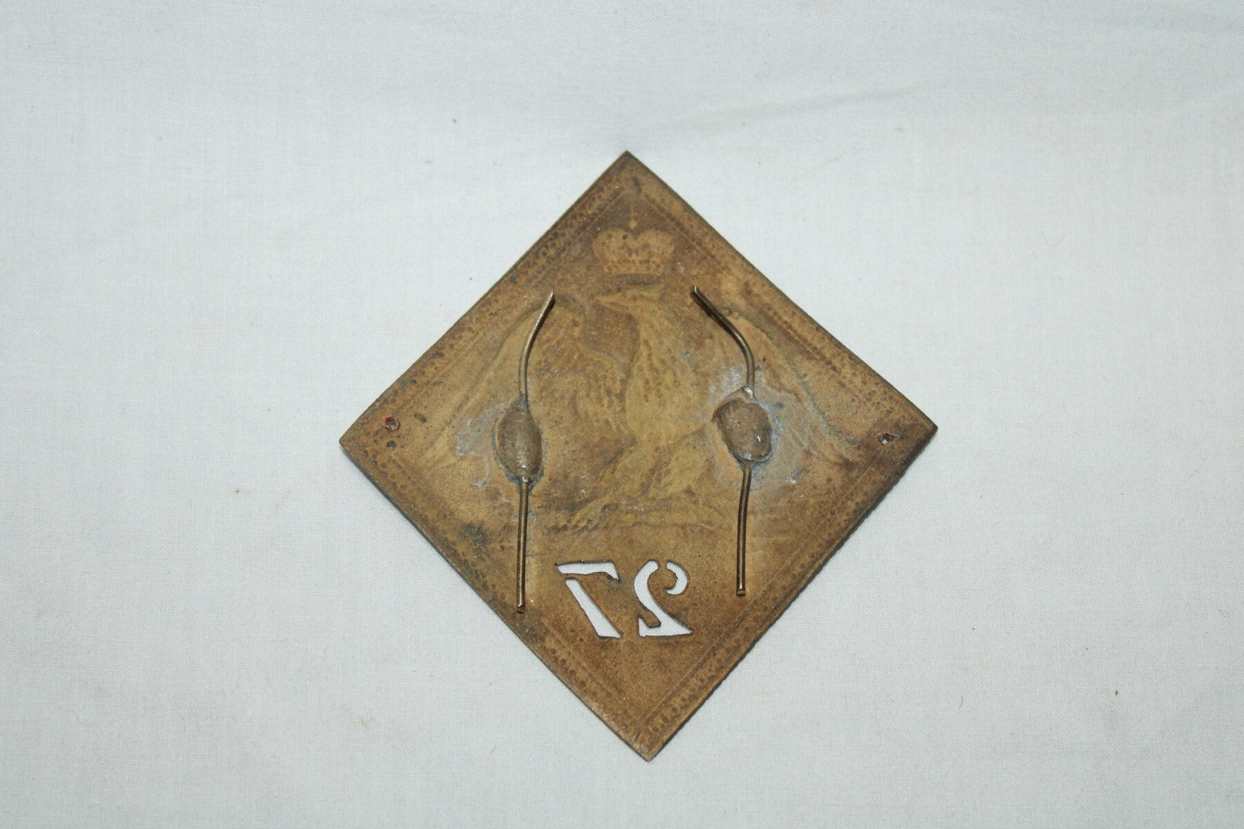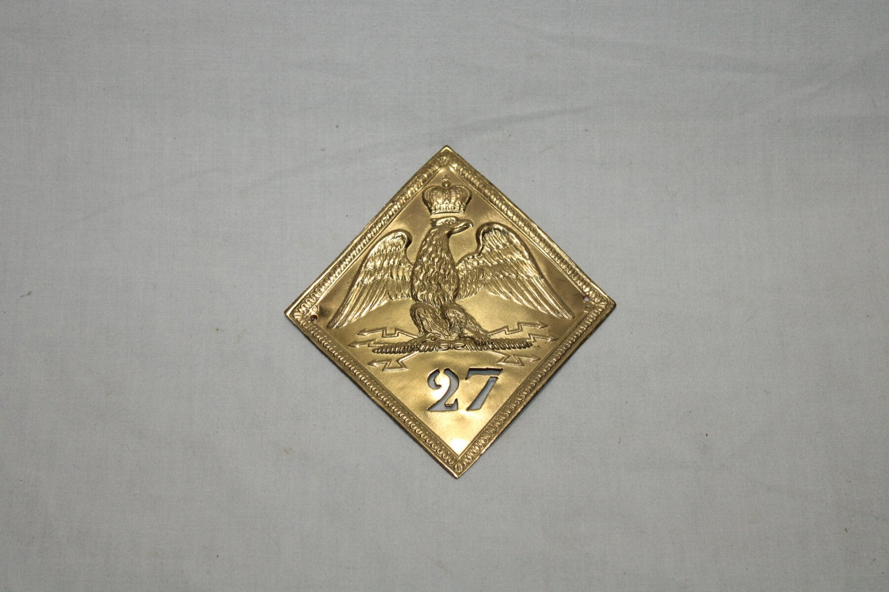 Plaque de shako modèle 1806-1810 du 27é de ligne. Quatre tiges au dos pour fixé a la coiffure.