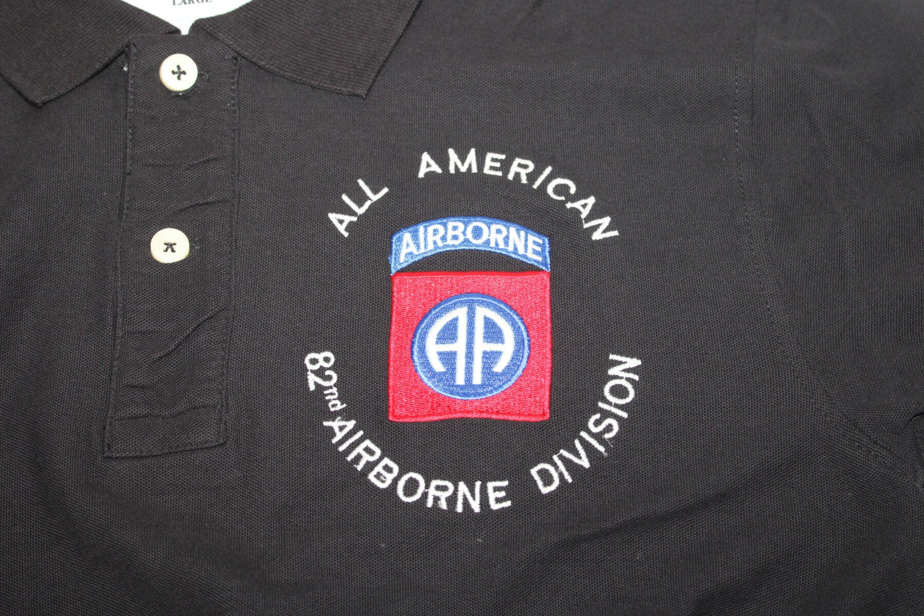 Ce polo est brodé de l'insigne de la 82ème division d'infanterie aéroportée américaine ( la fameuse All American) sur la poitrine.
