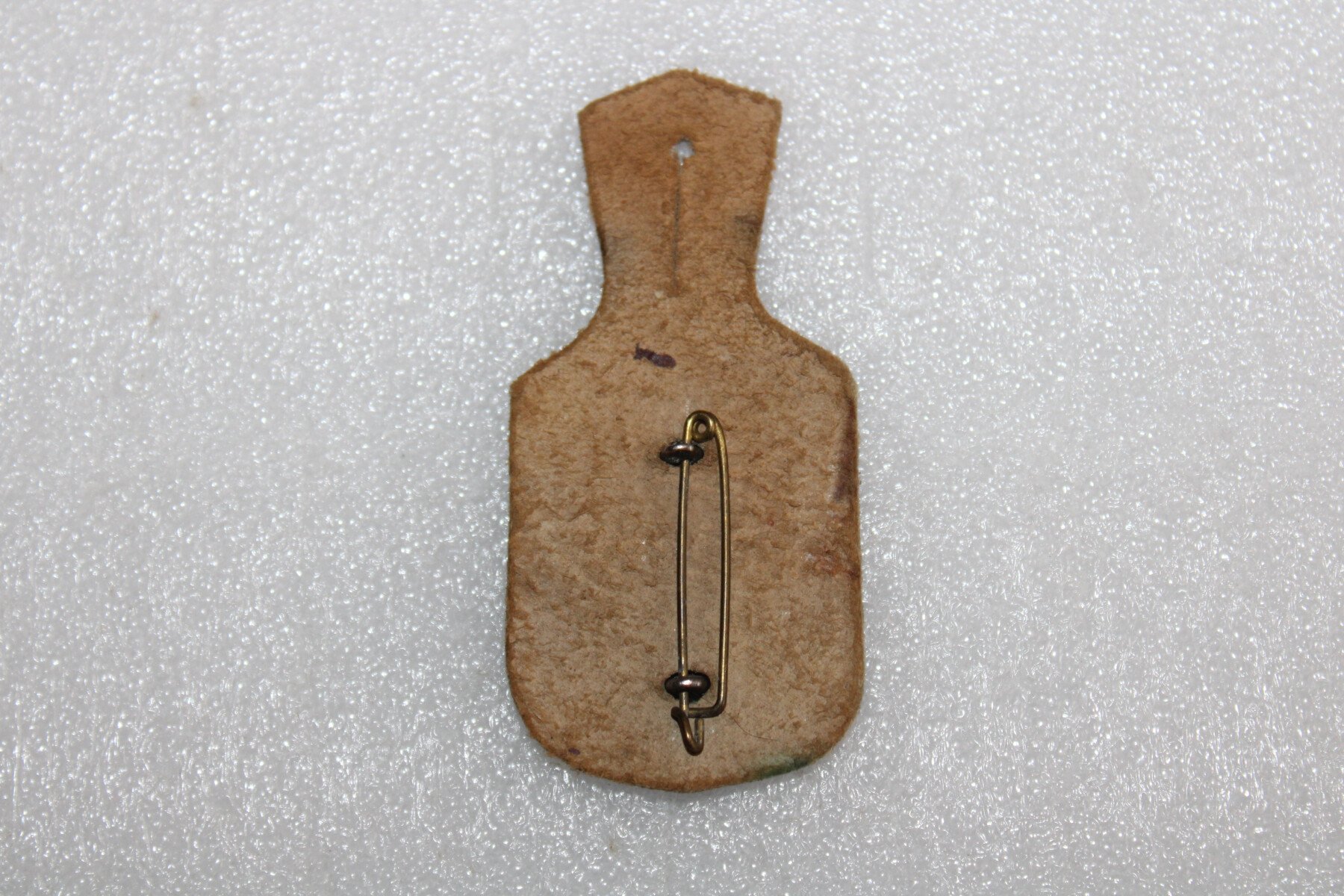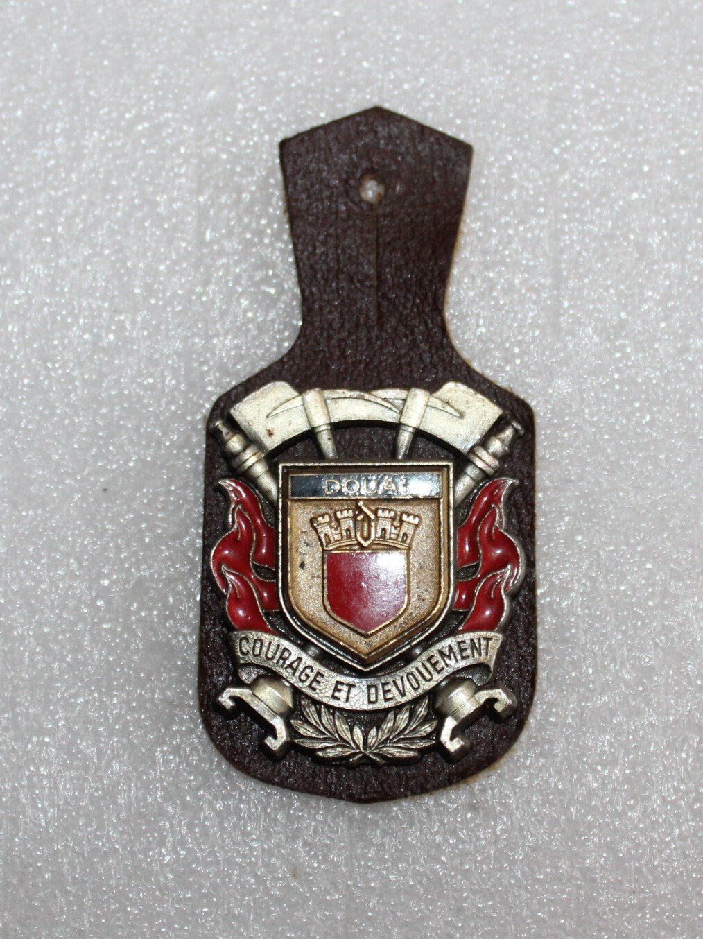 Insigne des Sapeurs pompiers de Douai (59), fabrication Delsart. Avec son cuir d'origine..