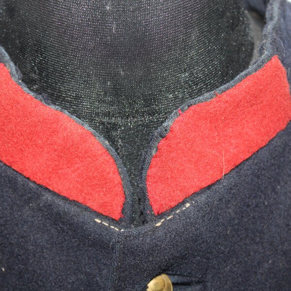 Veste dite “Ras de cul” modèle 1879. Tampon de date 1901, régimenté 135e de Ligne, réception 11e corps. Boutons dorée a grenade. Patte de col rouge. Passants de ceinturon présent et cousu. présence d'un tampon costumier. Légères usures, veste en bon état général. Insigne de cycliste postérieur. Taille: largeur d'épaules 47 cm à plat. Longueur de manche: 60 cm. Hauteur totale: 55 cm.