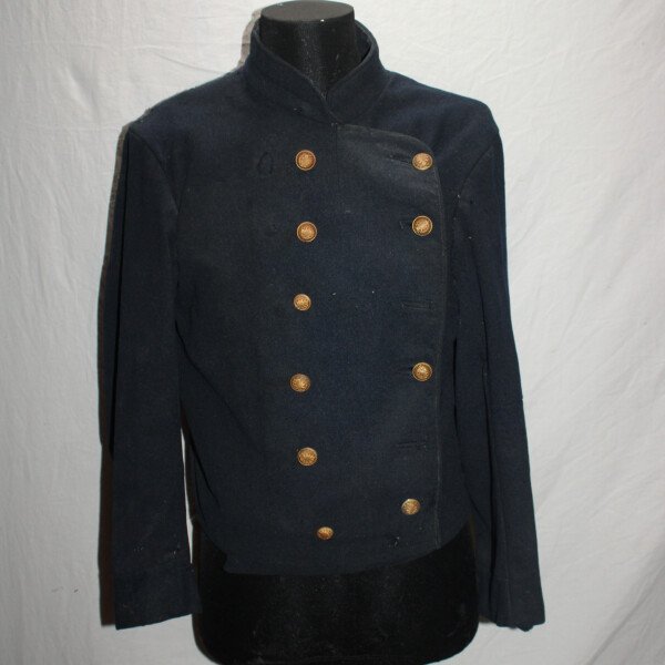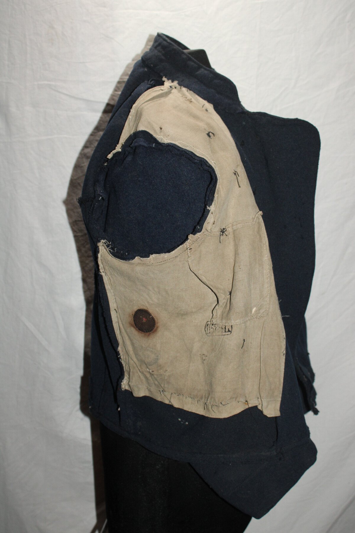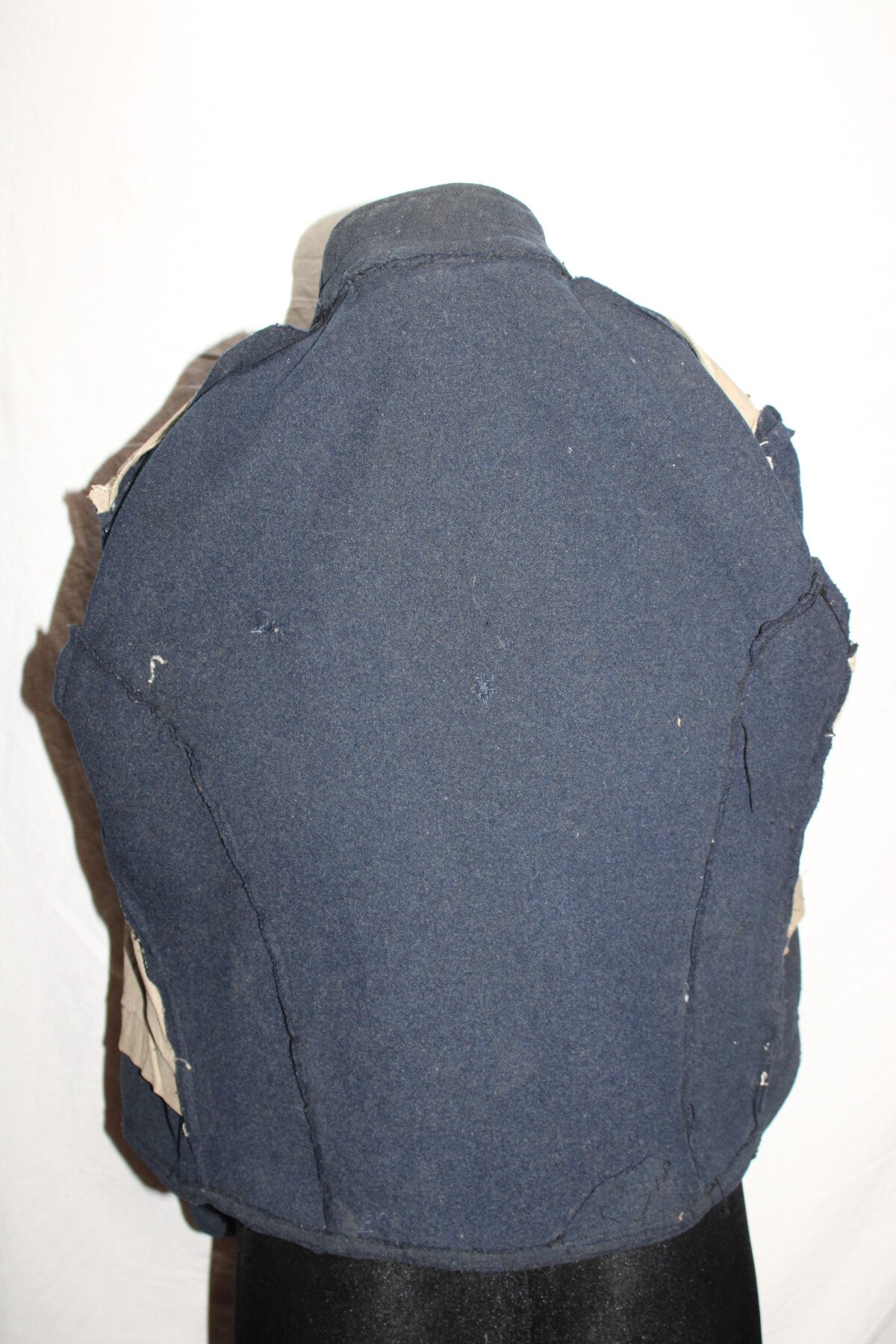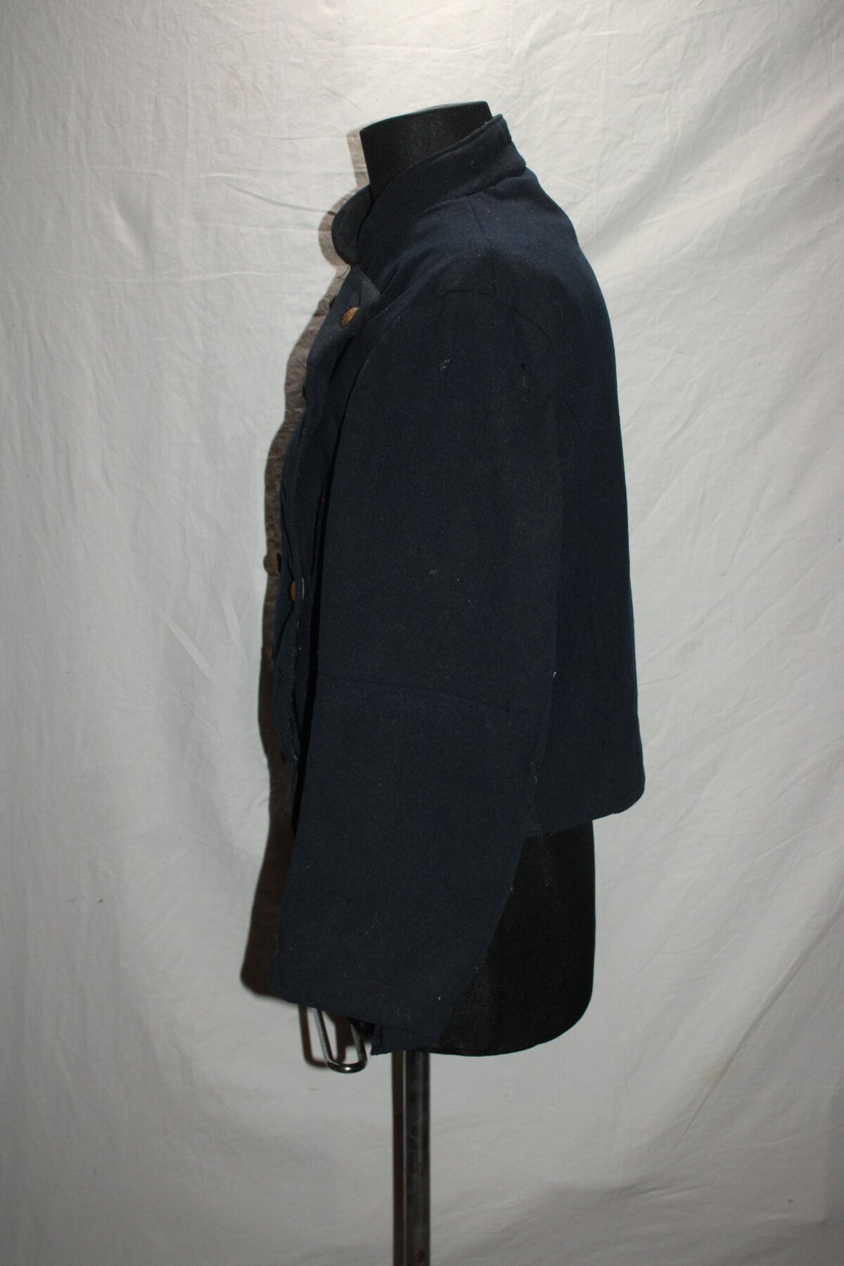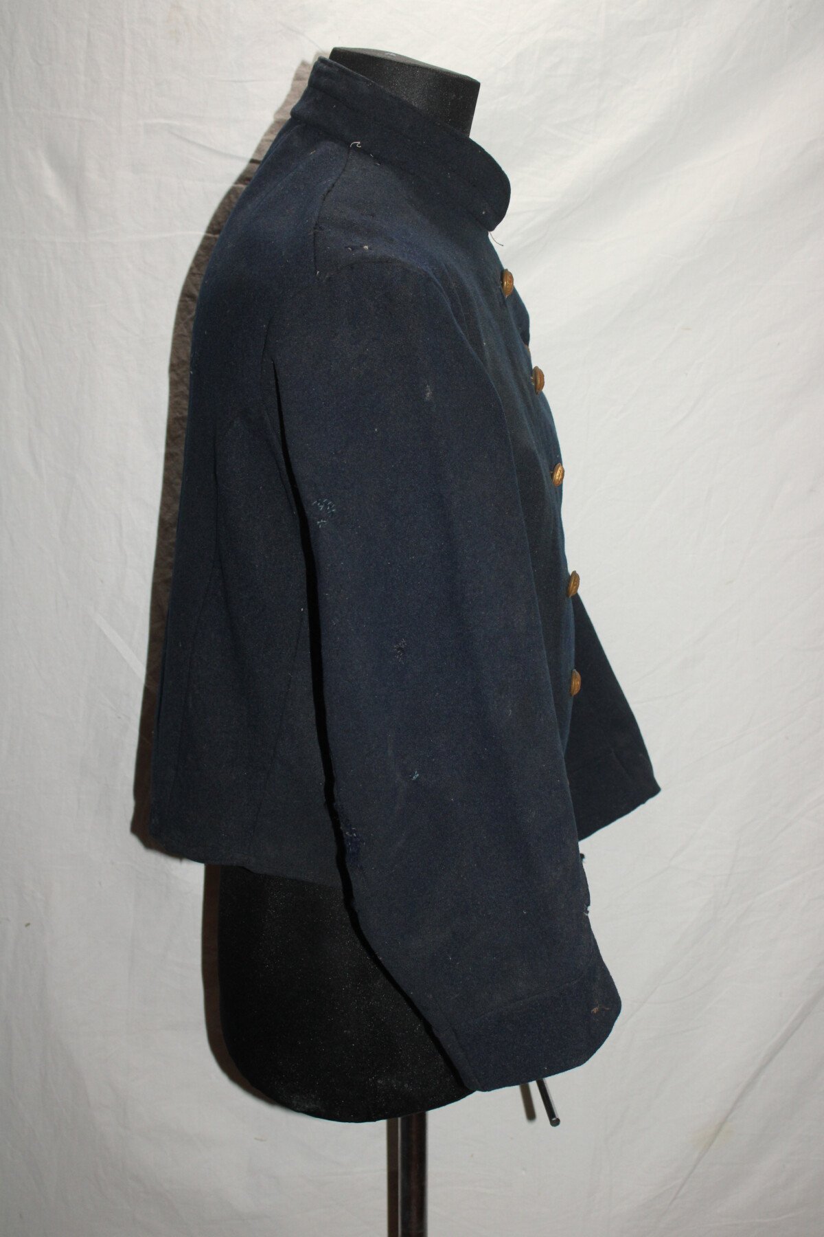 Veste dite “Ras de cul” croisé. Tampon de date peu lisible, régimenté 115e de Ligne. Boutons dorée. Nombreux réparation et léchures de mite. Passants de ceinturon démonté. Taille: largeur d'épaules 47 cm à plat. Longueur de manche: 56 cm. Hauteur totale: 55 cm.