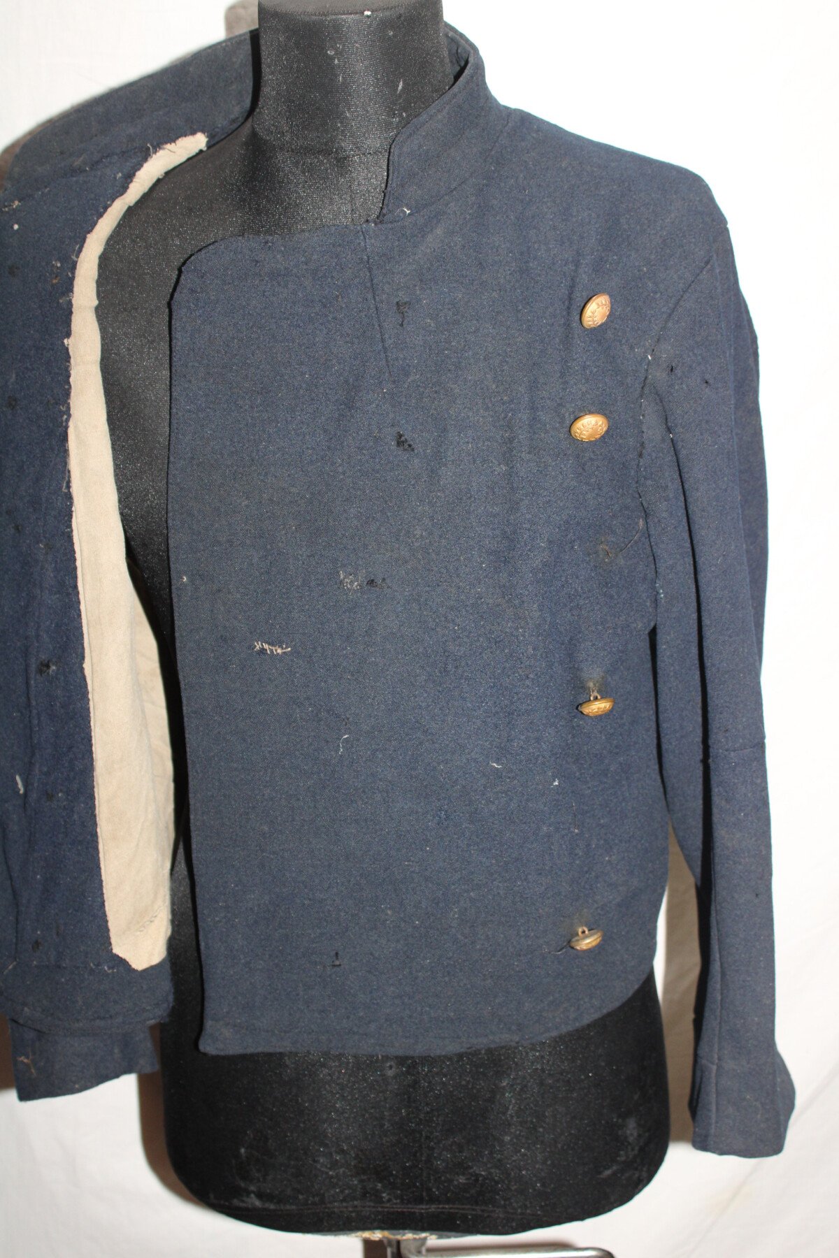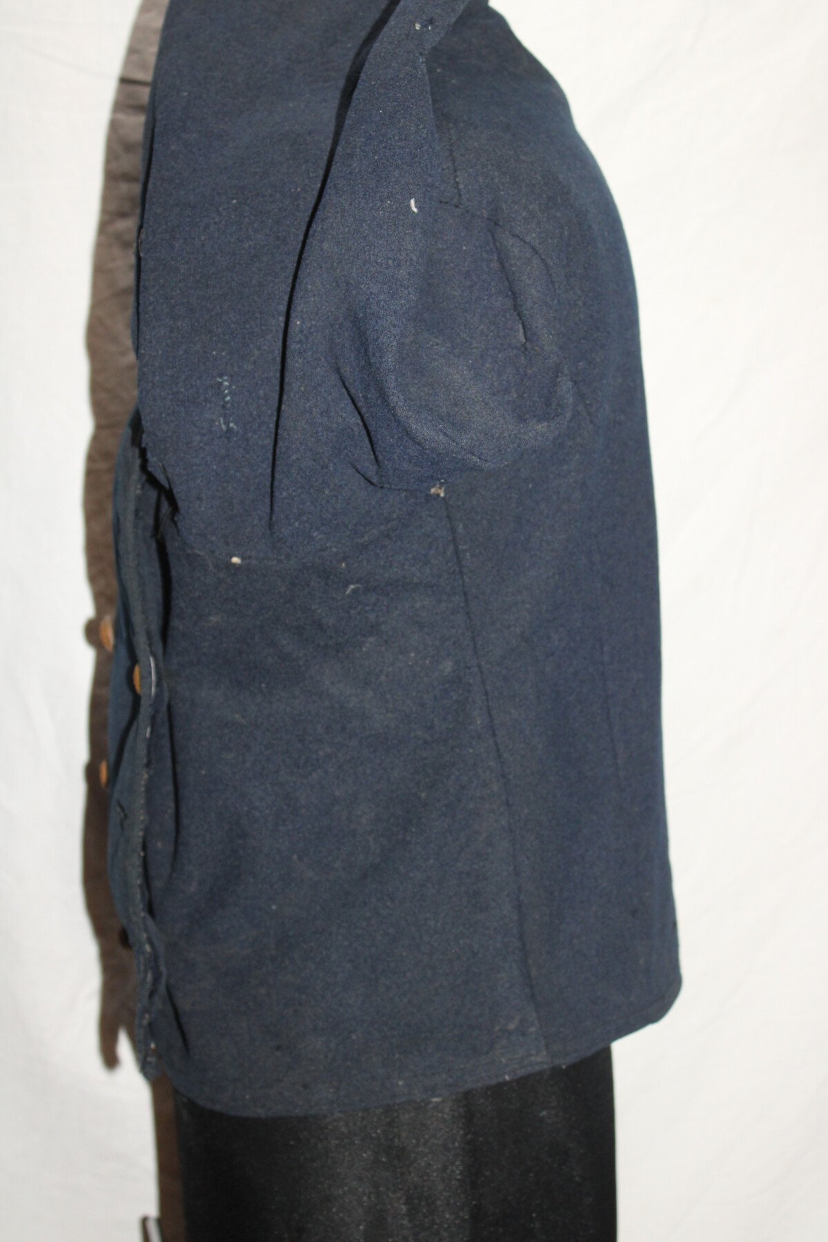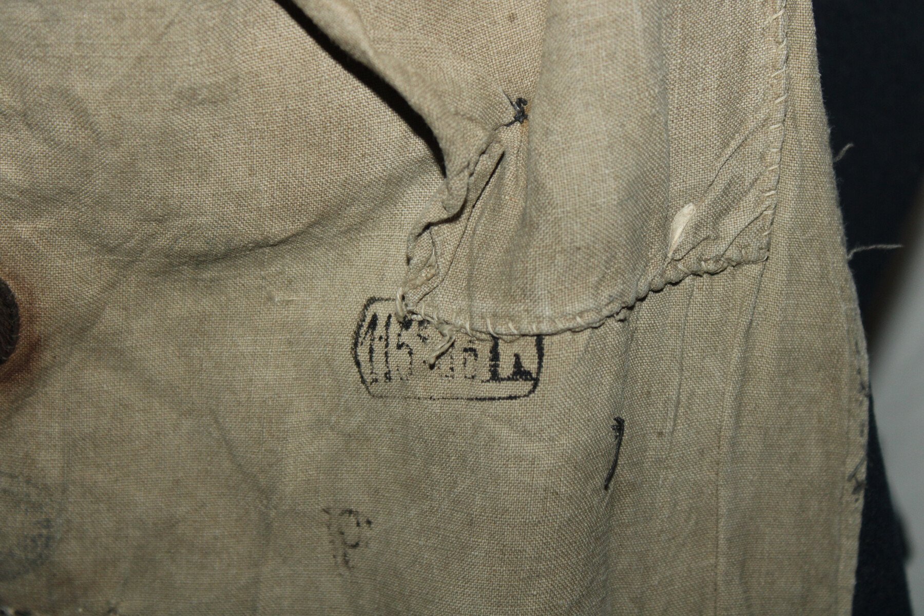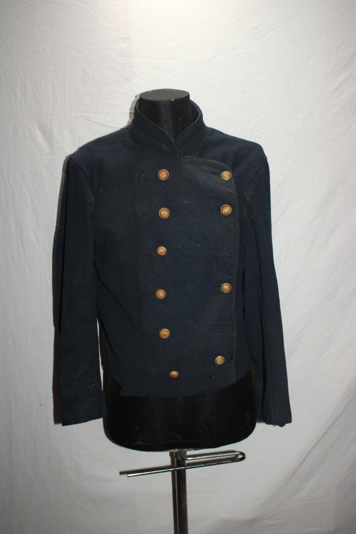 Veste dite “Ras de cul” croisé. Tampon de date peu lisible, régimenté 115e de Ligne. Boutons dorée. Nombreux réparation et léchures de mite. Passants de ceinturon démonté. Taille: largeur...