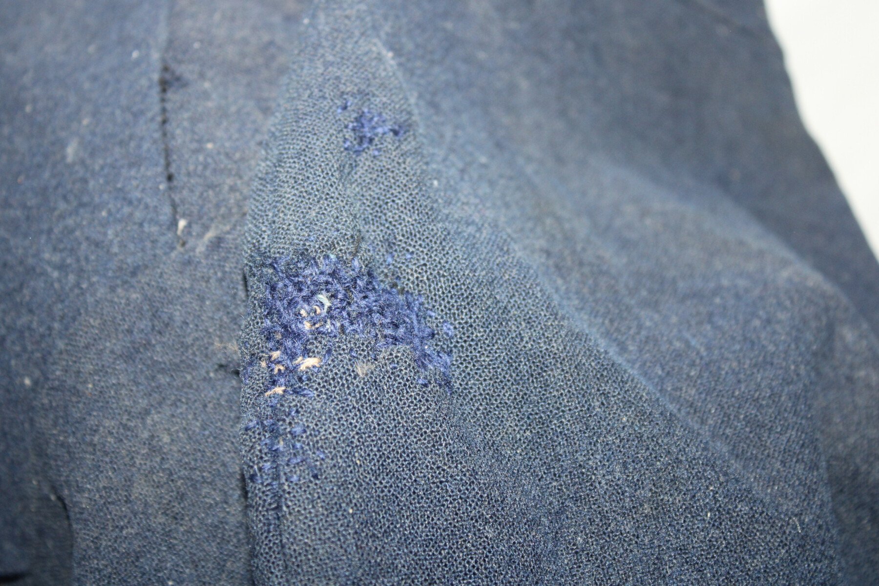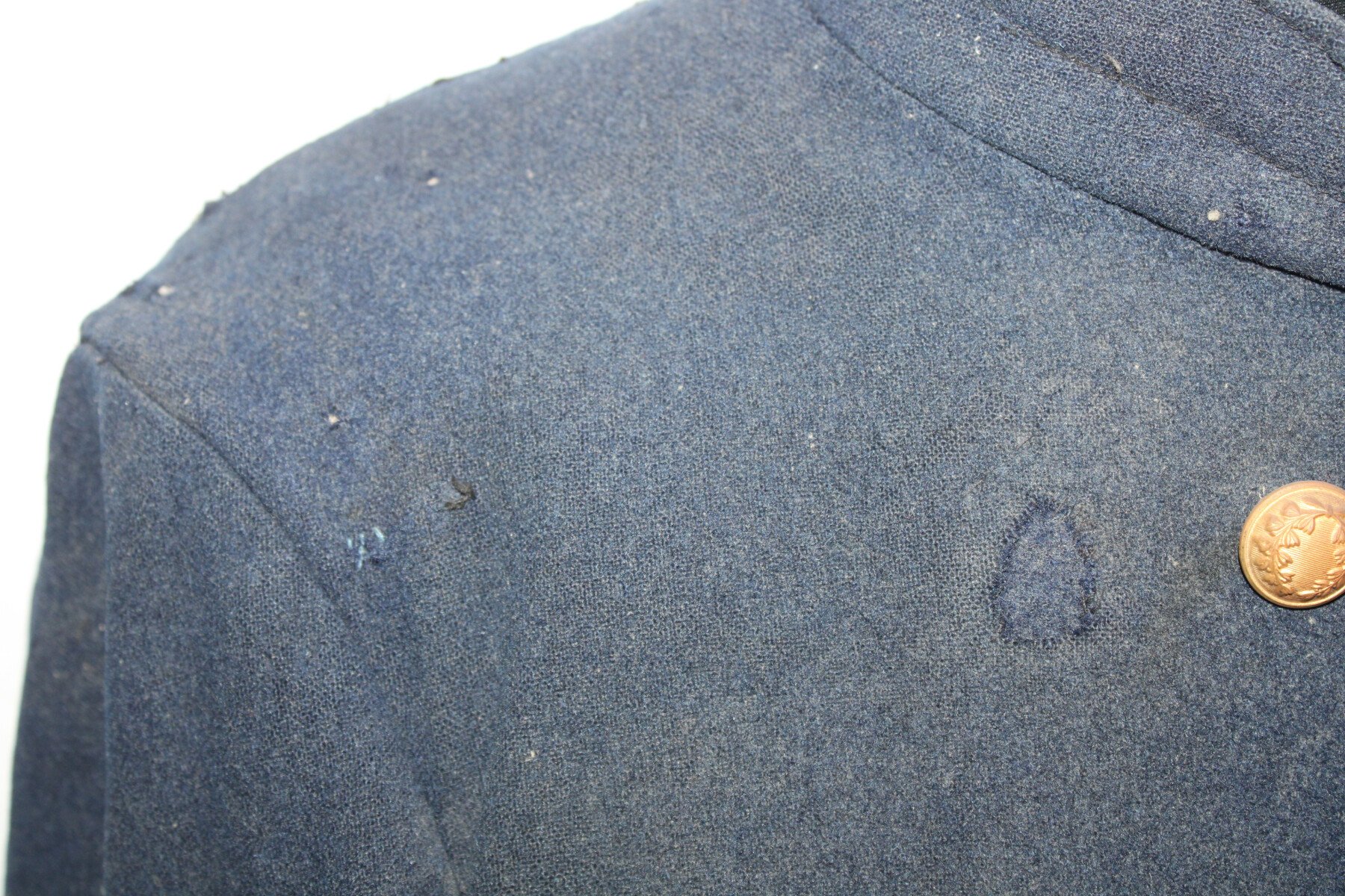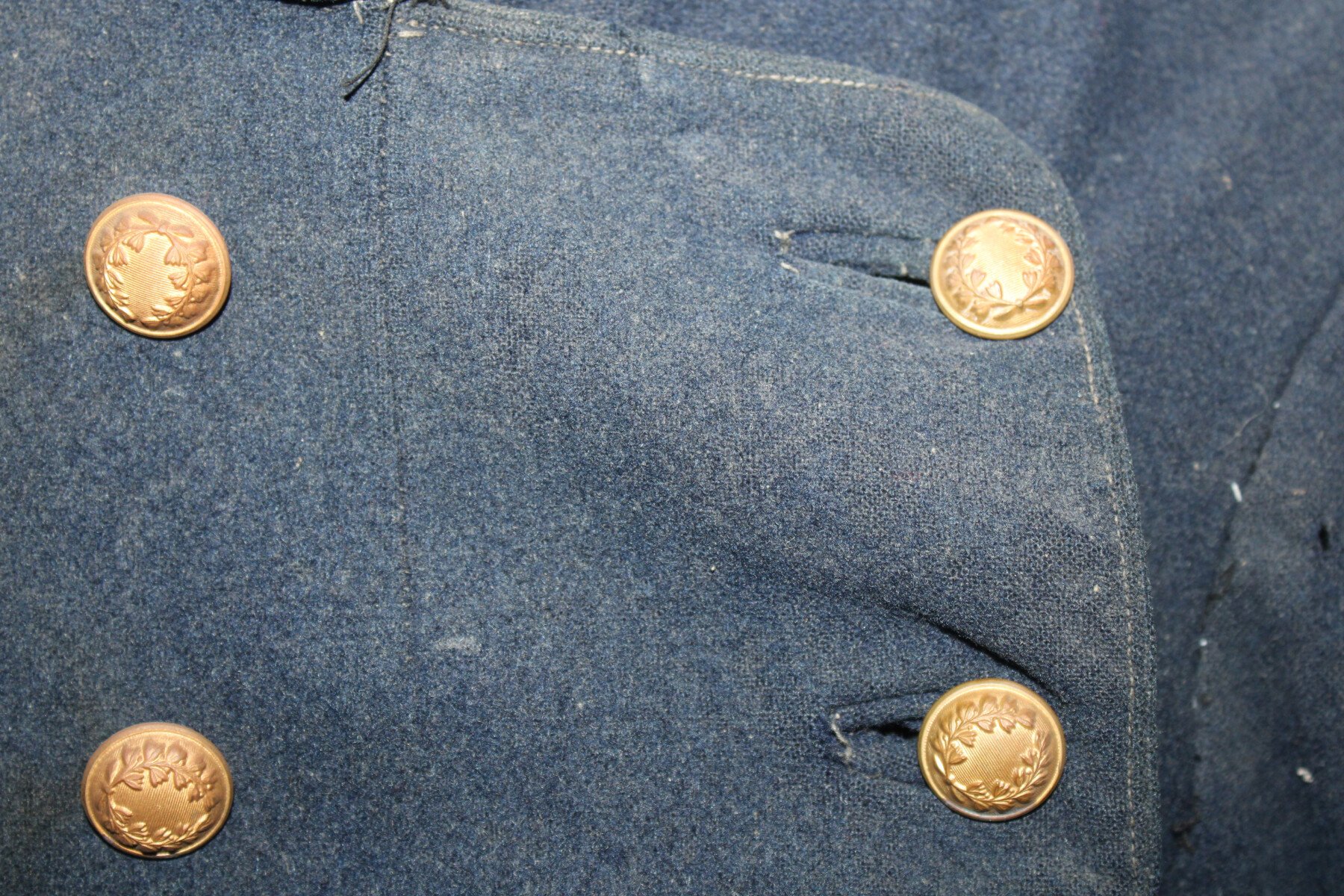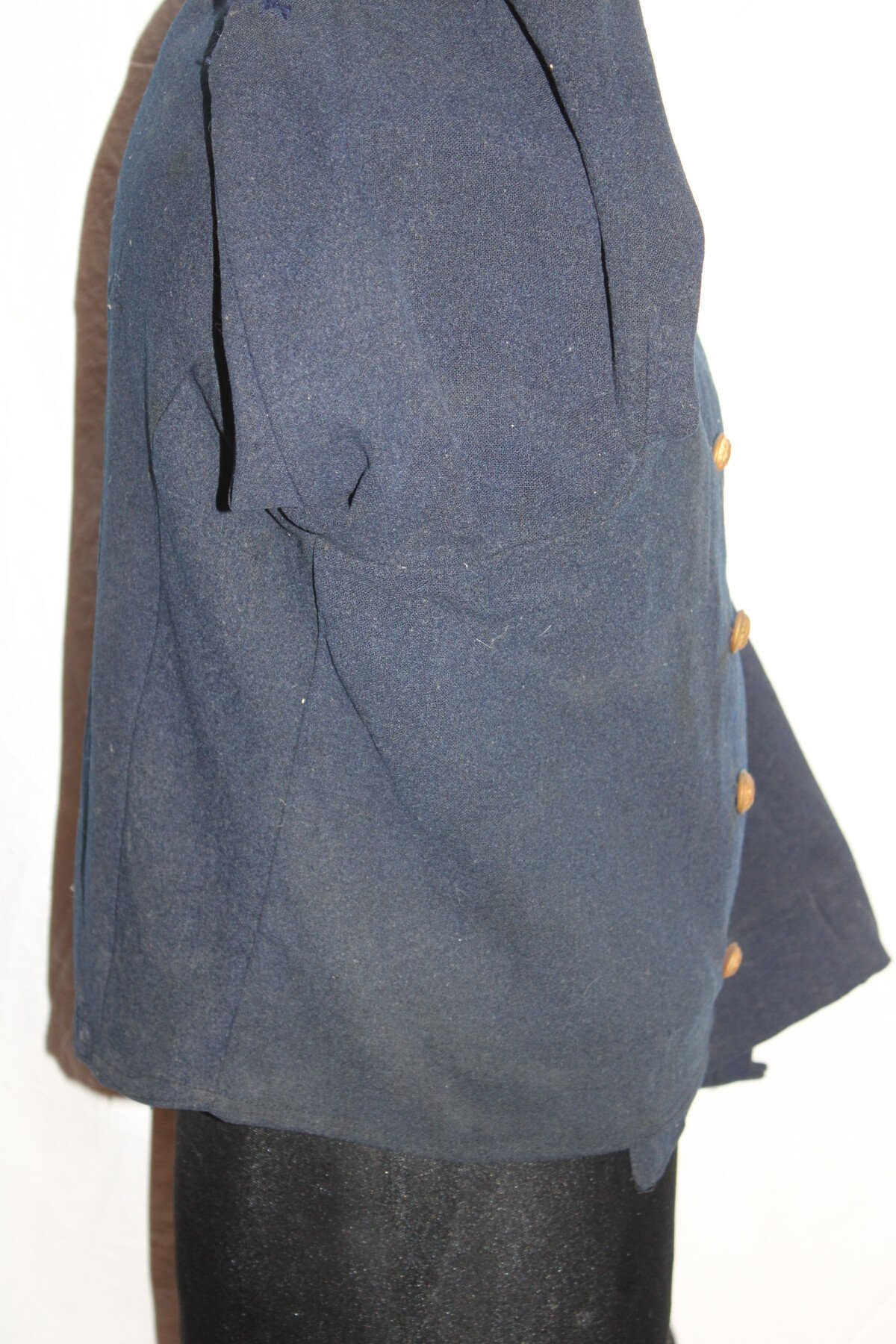Veste dite “Ras de cul” croisé. Tampon de date peu lisible, régimenté 115e de Ligne. Boutons dorée. Nombreux réparation et léchures de mite. Passants de ceinturon démonté. Taille: largeur...