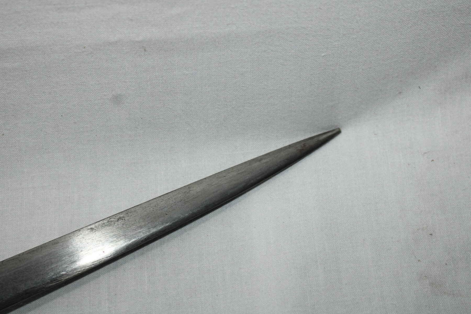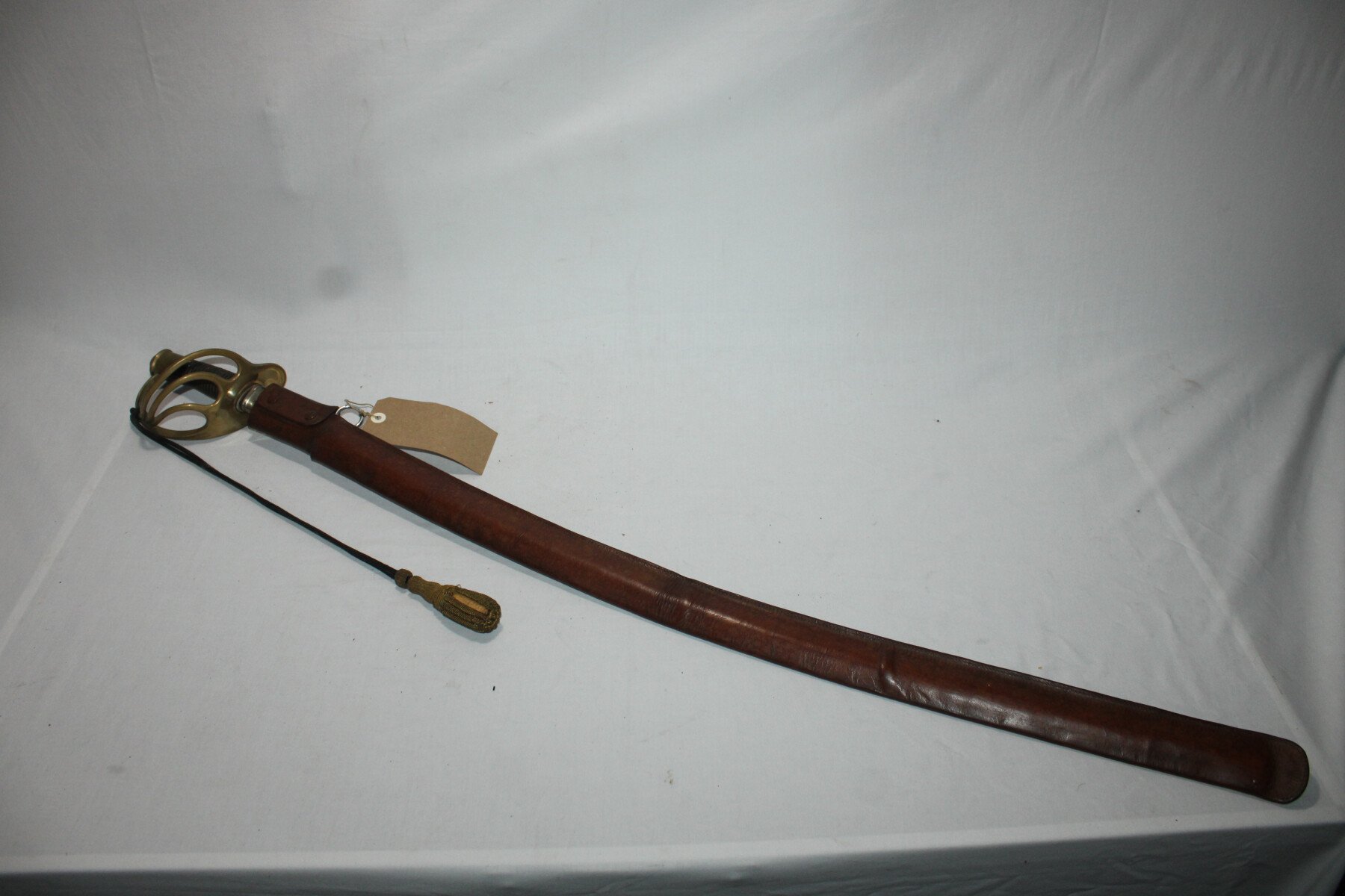 Sabre de cavalerie modèle 1822. Fourreau en métal a un anneaux avec sa protection en cuir. Lame en bon état, 90cm. Filigrane de la poignée complet. Marqué RF sur la lame. Un manque sur la bélière.