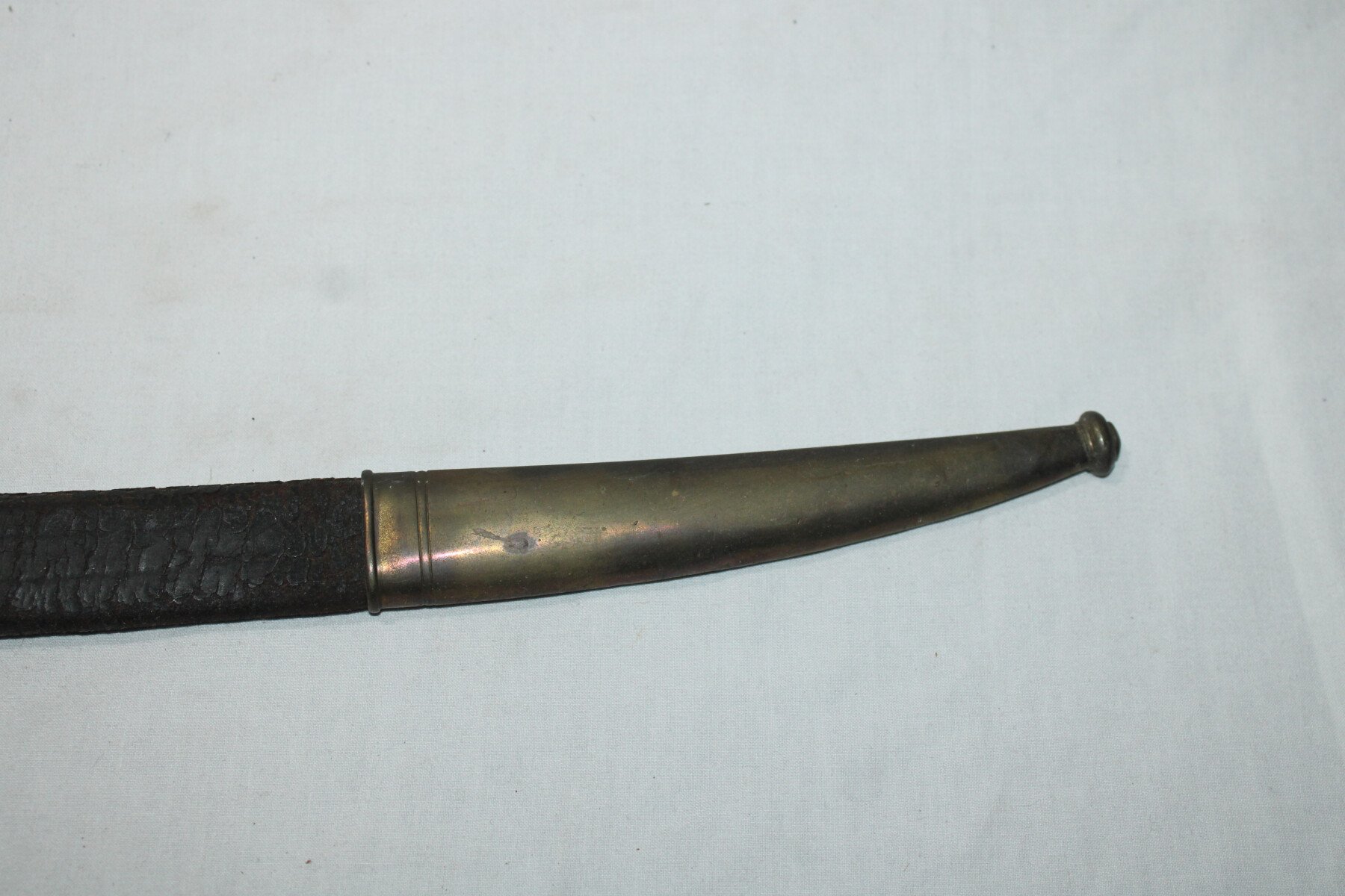 Sabre d'officier d'infanterie modèle 1821 modifié 1854. Fourreau en cuir a deux anneaux. Lame abimée à plusieurs endroits. Marquage sur le dessus de la lame peut lisible.