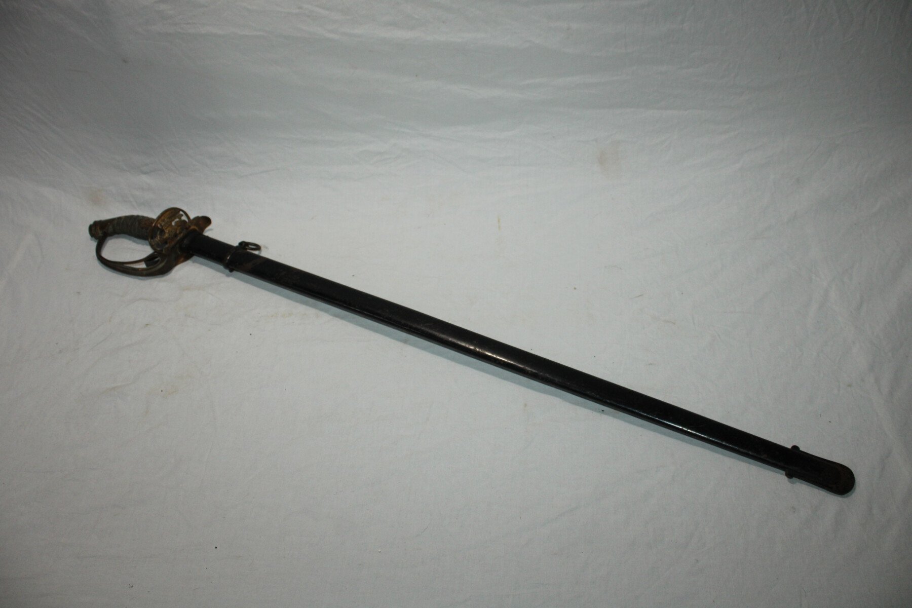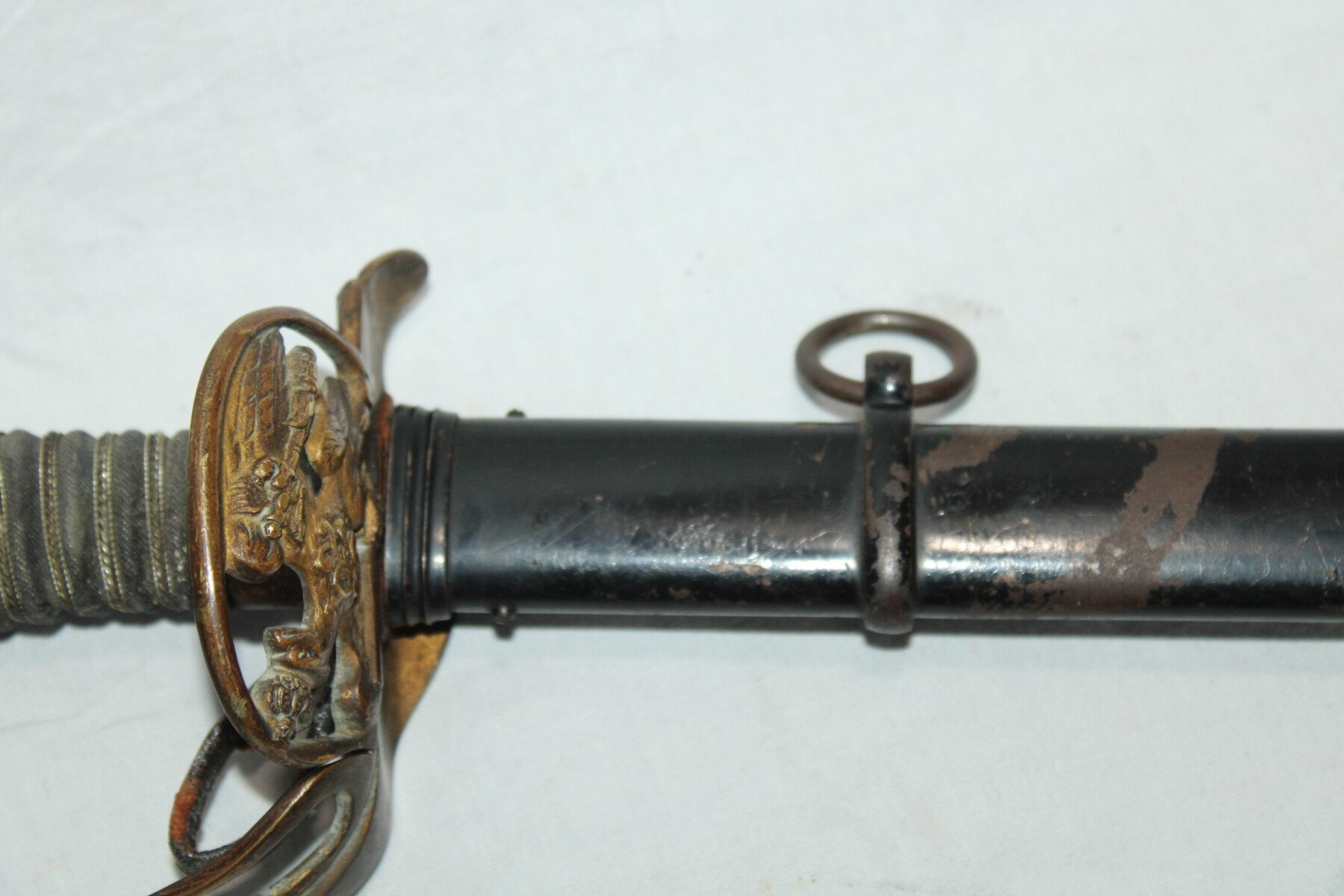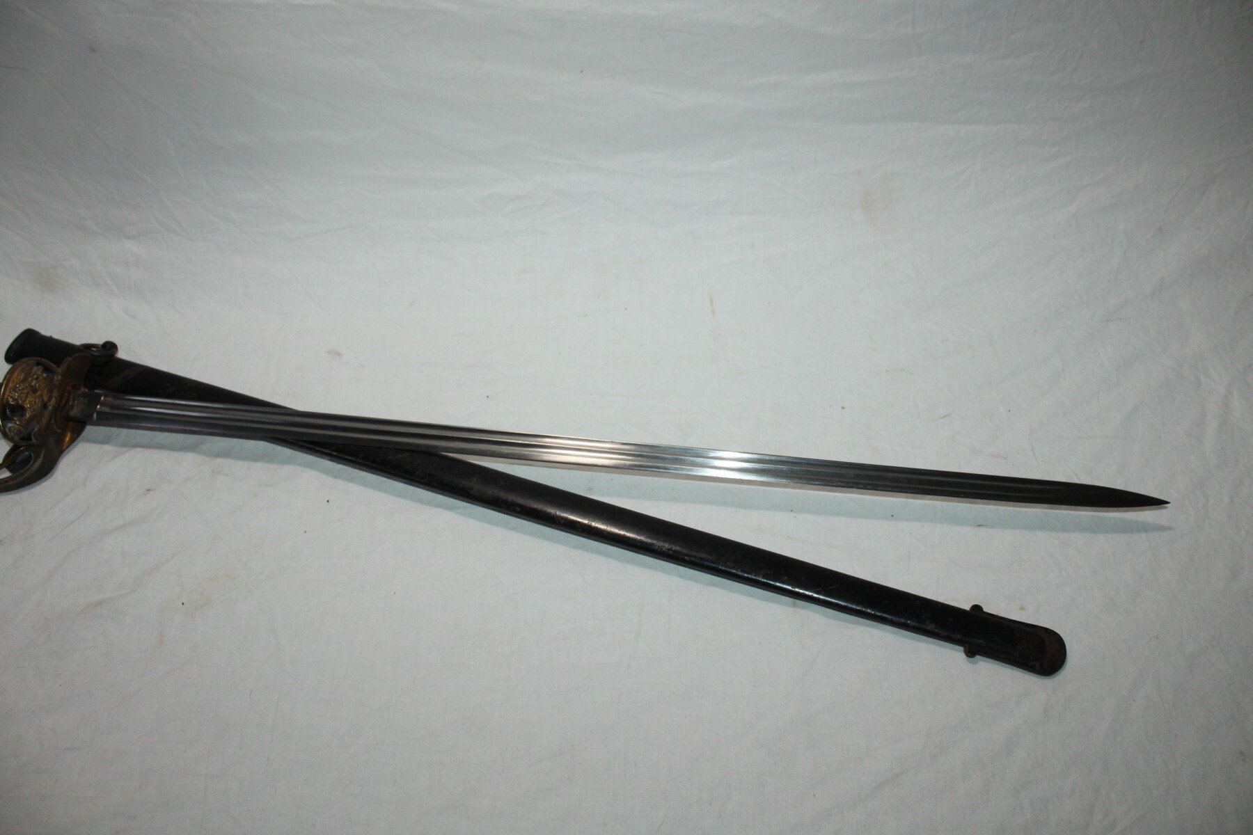 Sabre d'officier prussien modèle 1889. Bon état général. Poignée avec monogramme de Guillaume 2. Clapet fonctionnel. Marqué sur la lame. Peinture noir sur le fourreau. Vente interdite au mineurs.