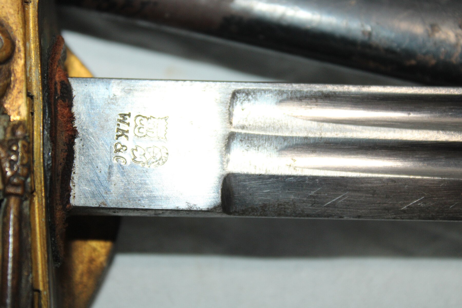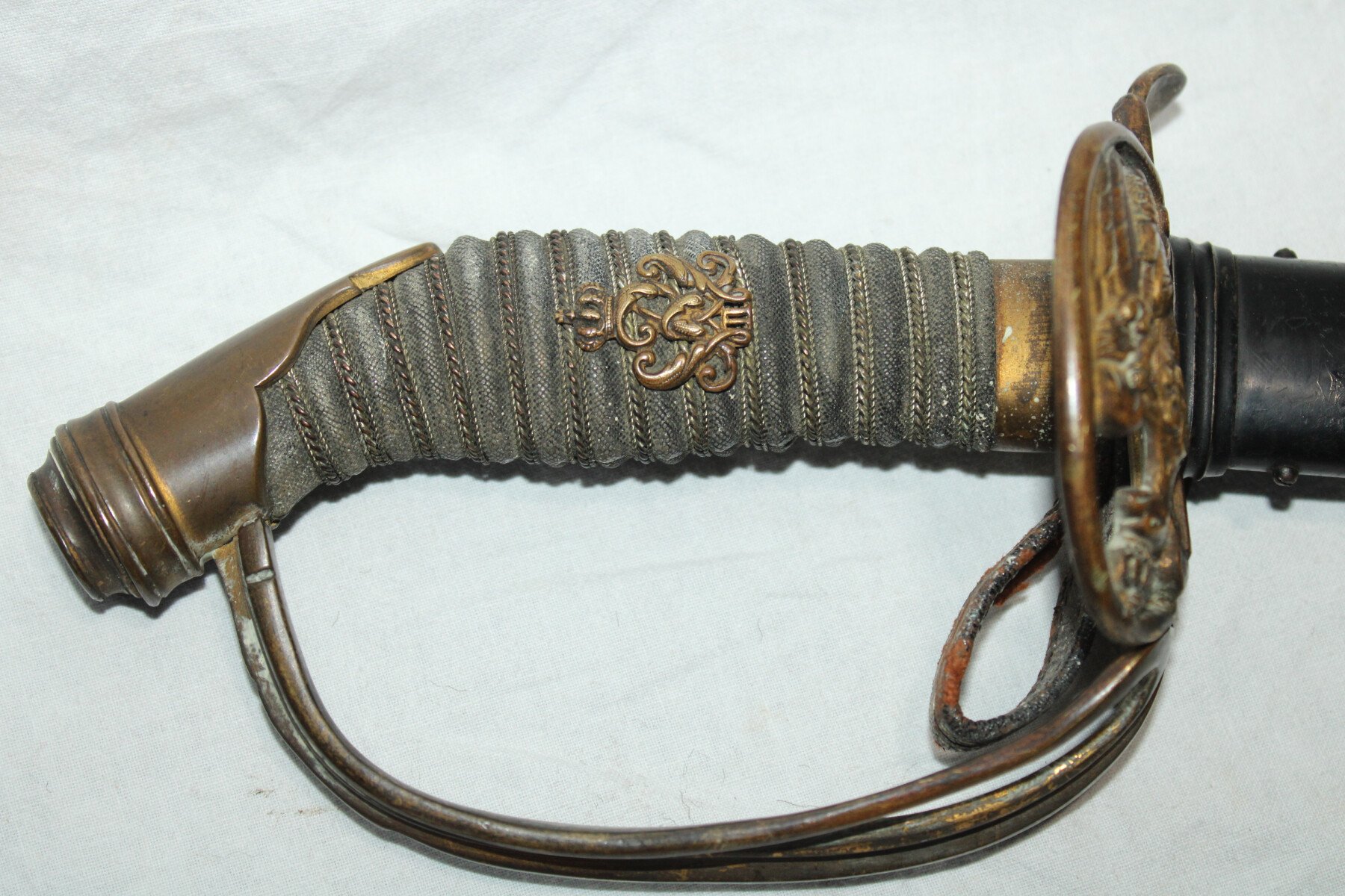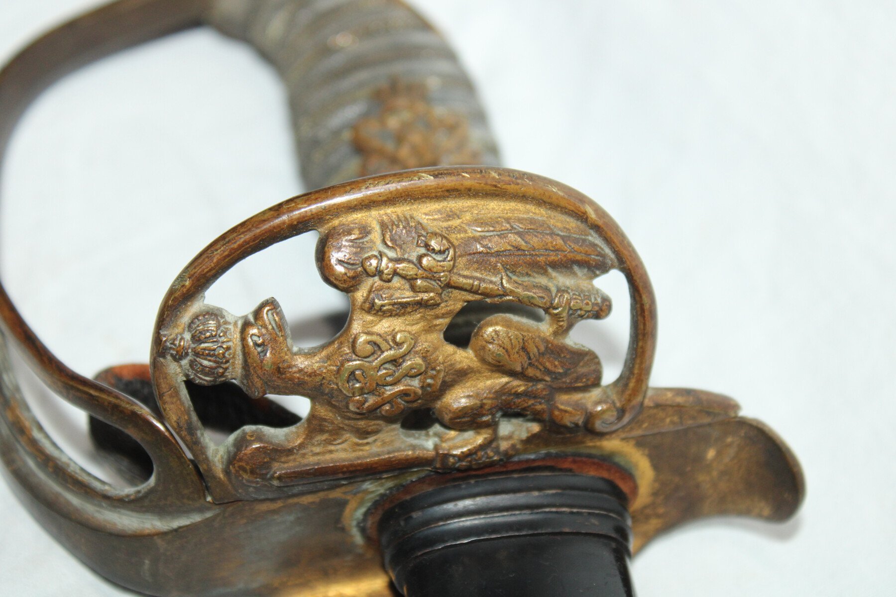 Sabre d'officier prussien modèle 1889. Bon état général. Poignée avec monogramme de Guillaume 2. Clapet fonctionnel. Marqué sur la lame. Peinture noir sur le fourreau. Vente interdite au...