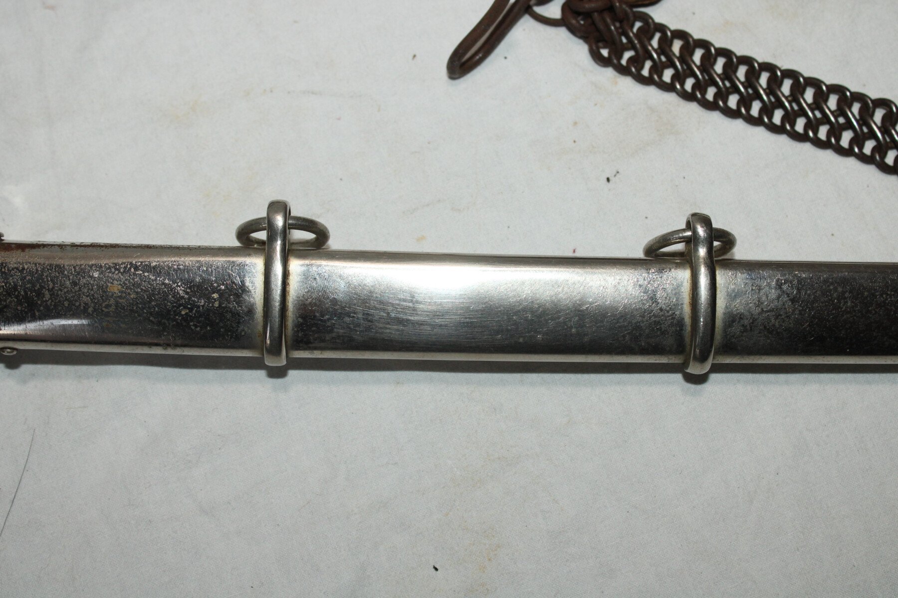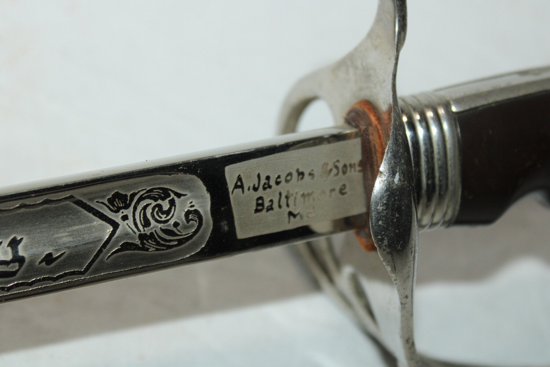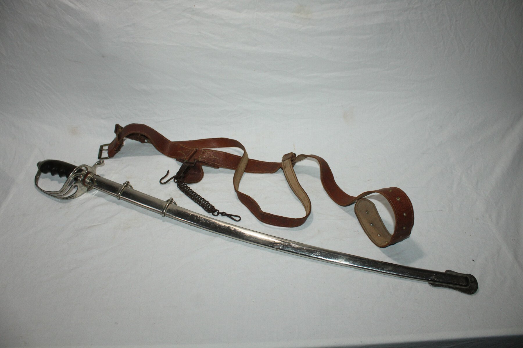 Sabre d'officier Américain avec sont ceinturon et porte sabre. Lame marqué du fabricant A.jacobs & Son Baltimore. Fourreau à deux anneaux, quelques manque de chrome. Pas de date visible. Ceinturon avec baudrier et porte sabre. Vente interdite au mineurs.