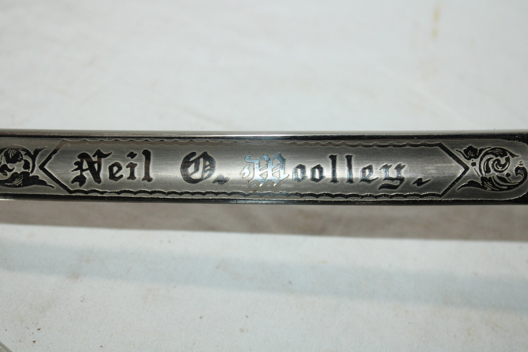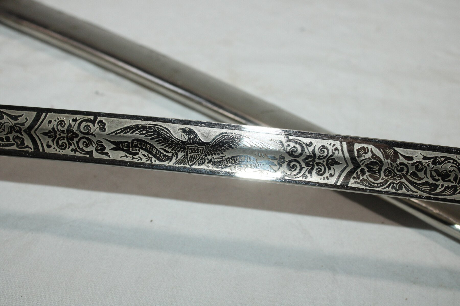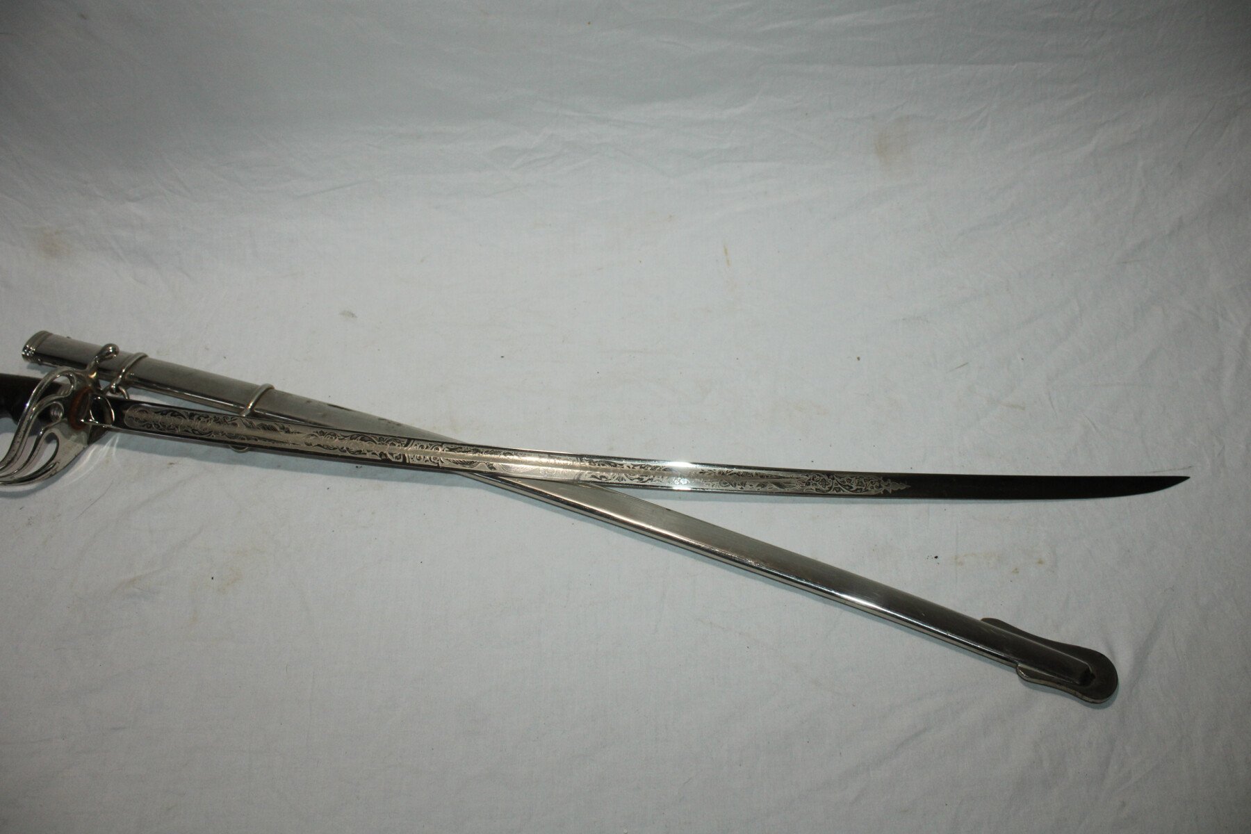Sabre d'officier Américain avec sont ceinturon et porte sabre. Lame marqué du fabricant A.jacobs & Son Baltimore. Fourreau à deux anneaux, quelques manque de chrome. Pas de date visible. Ceinturon avec baudrier et porte sabre. Vente interdite au mineurs.
