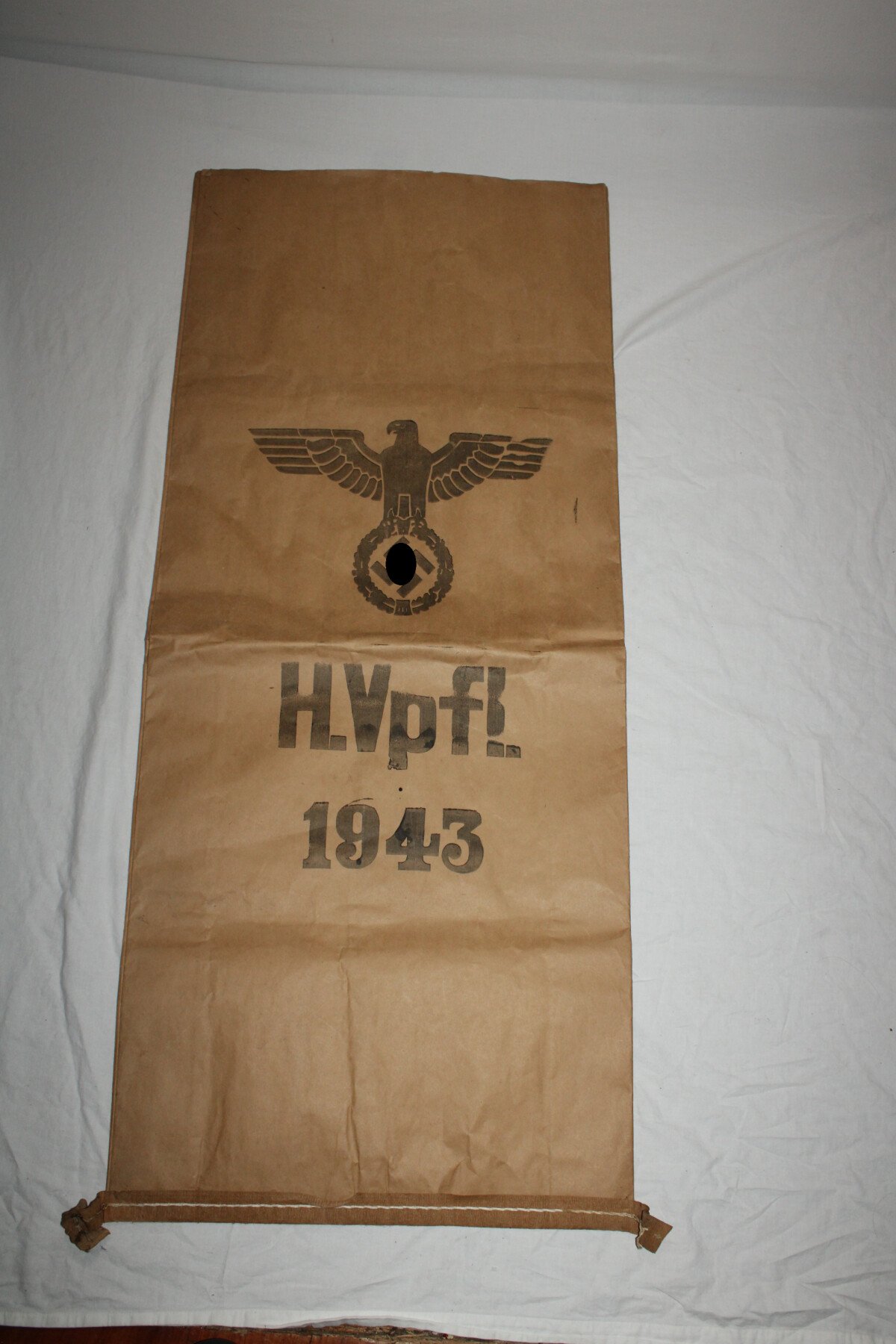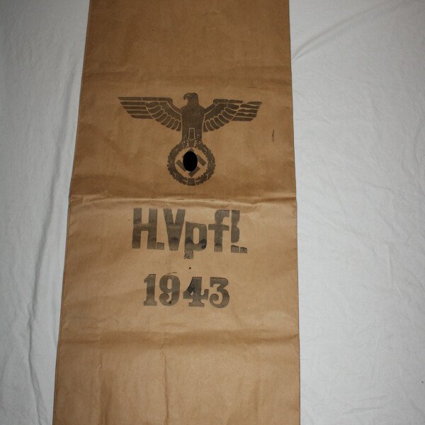 Fabrication en papier du sac à farine et/ ou ravitaillement pour l'armée allemande. Les marquages et l'aigle sont bien visibles, daté 1943. Pas de trous.