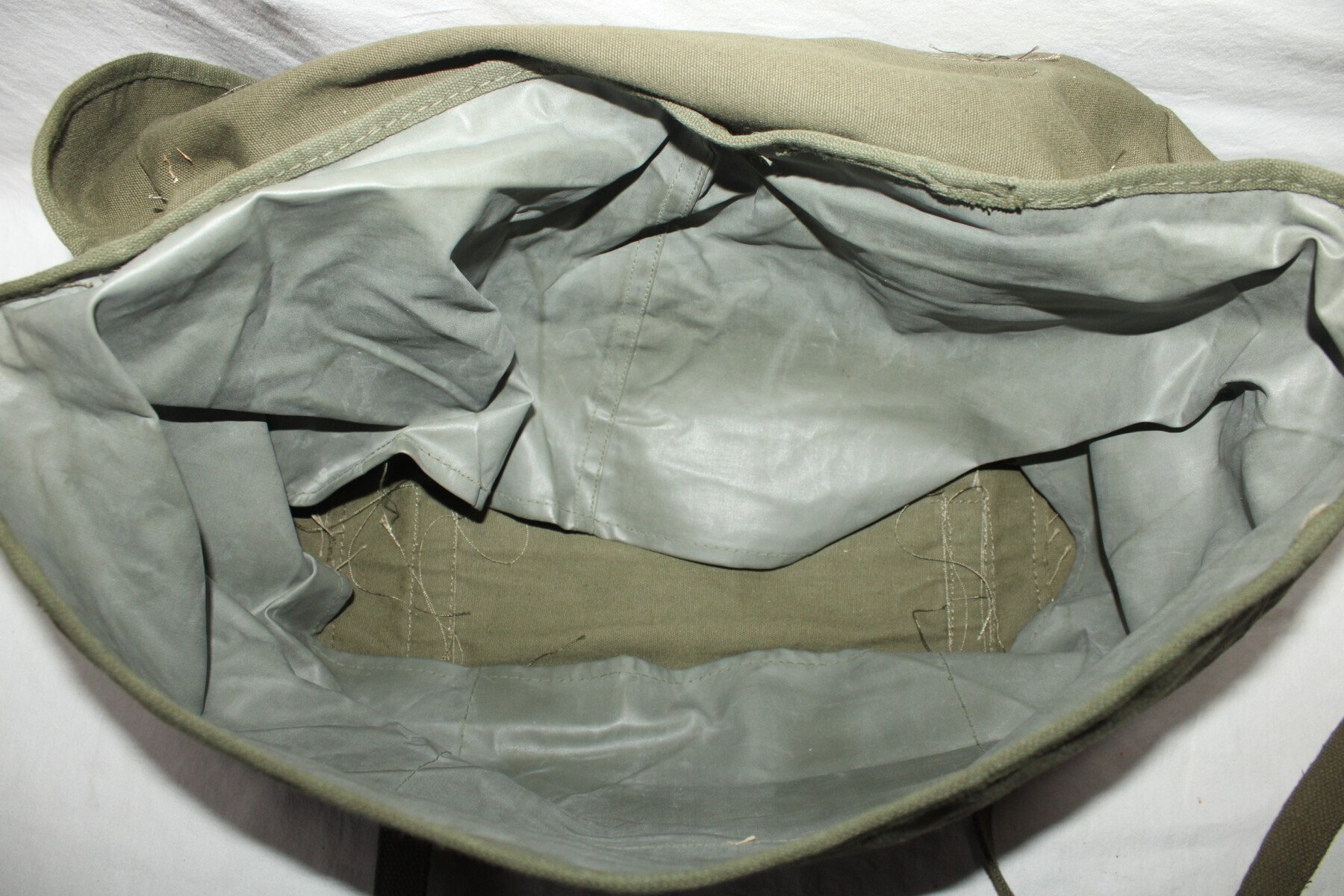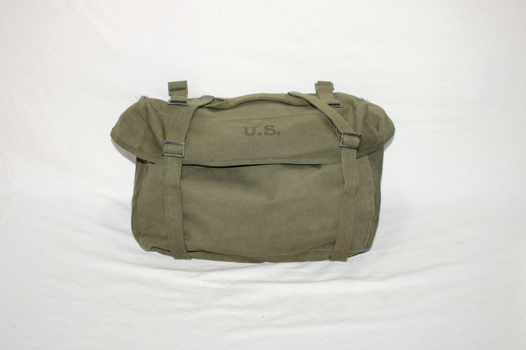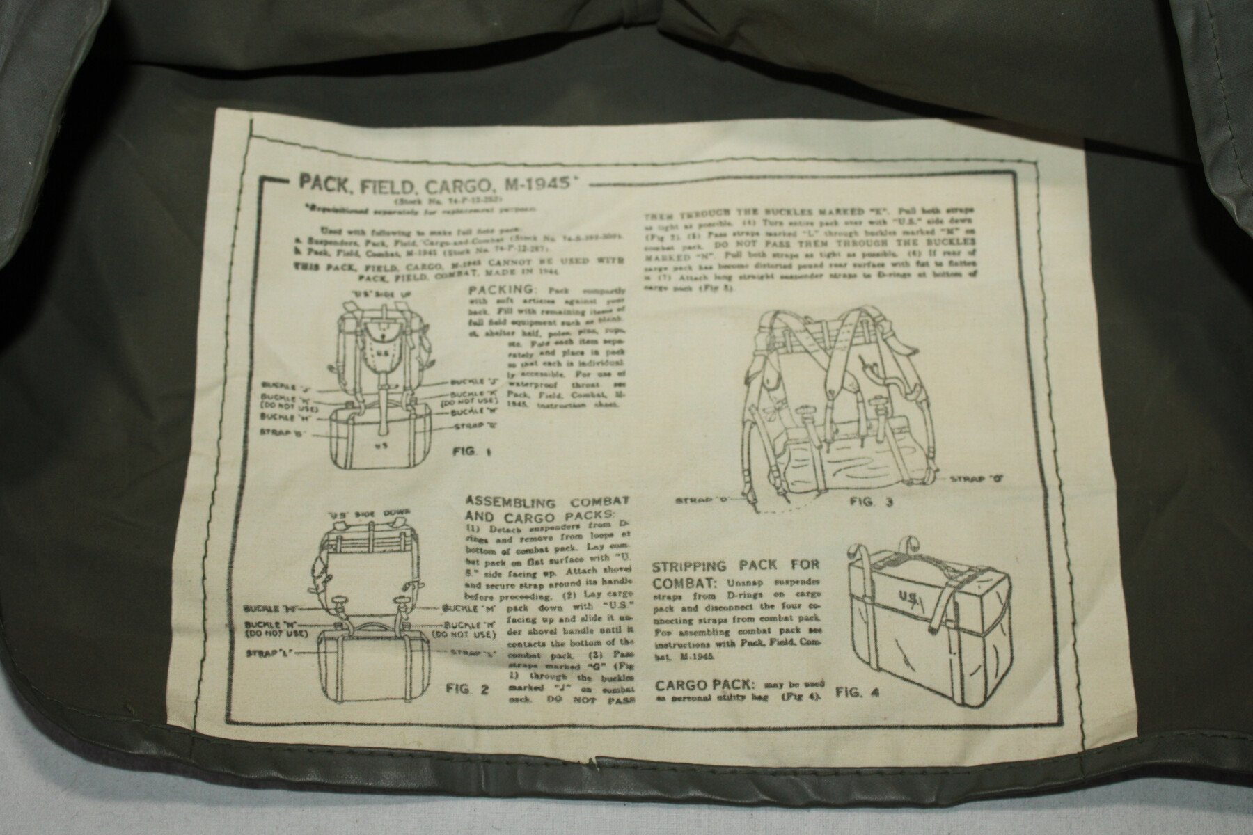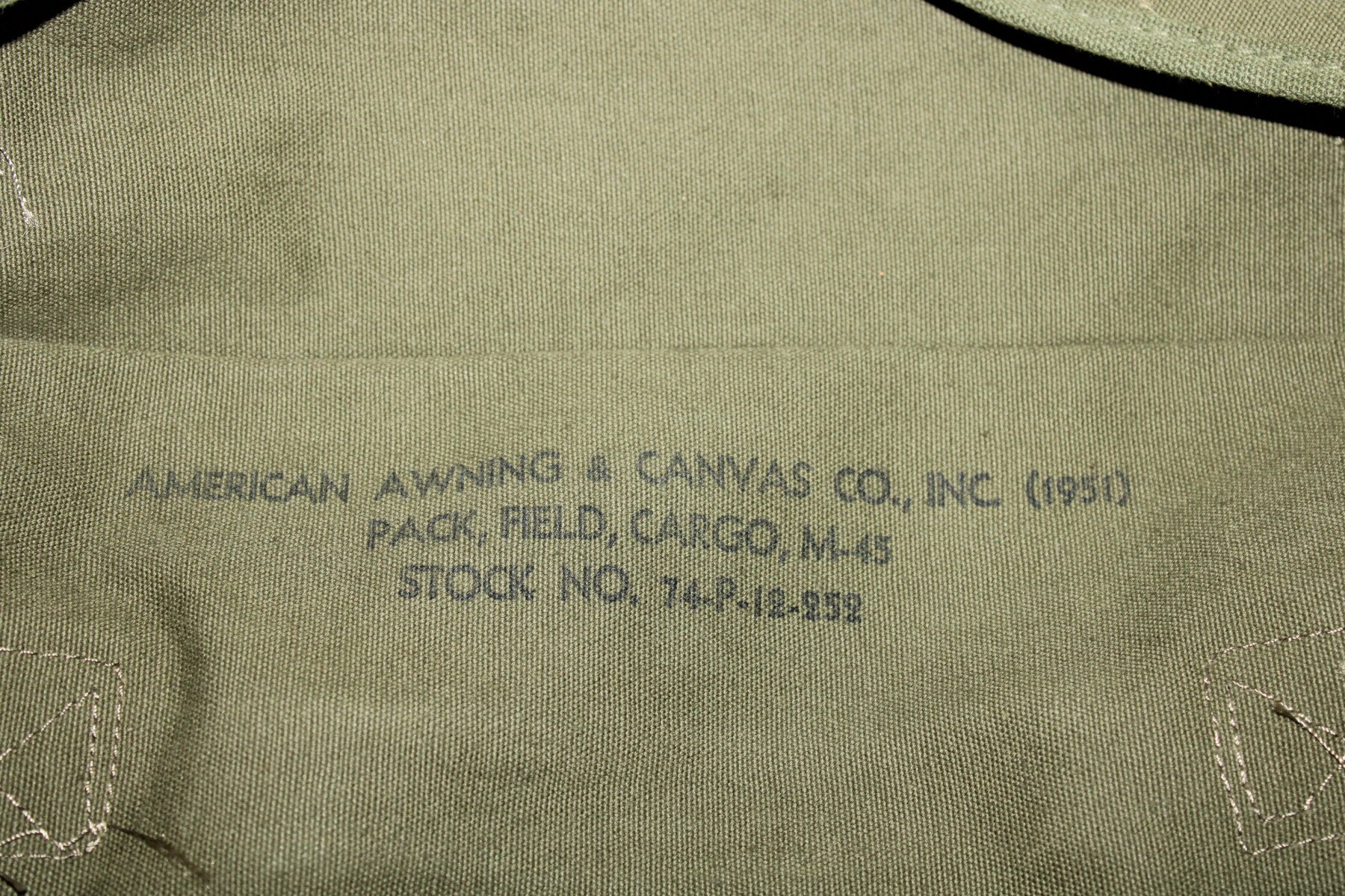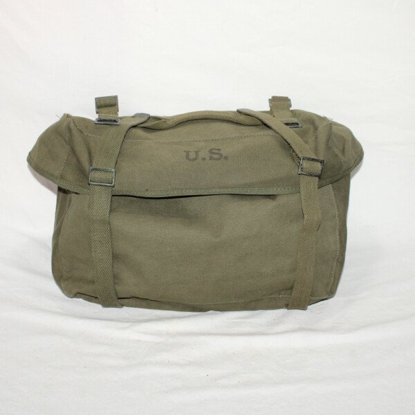 Pack field cargo, sac inférieur de l'ensemble Modèle 1945. Toute les sangles sont présente. Daté 1951. Toile imperméable présente et souple. Pas percé ni déchiré.