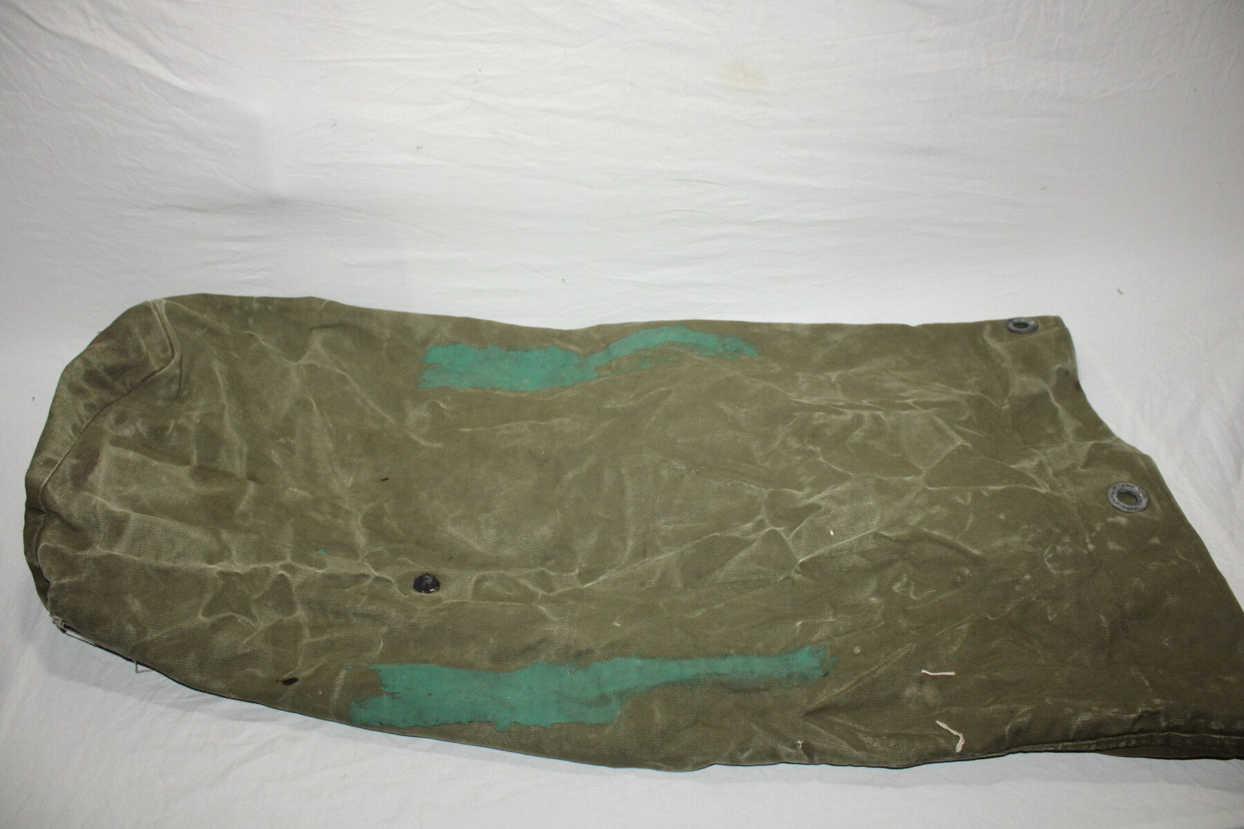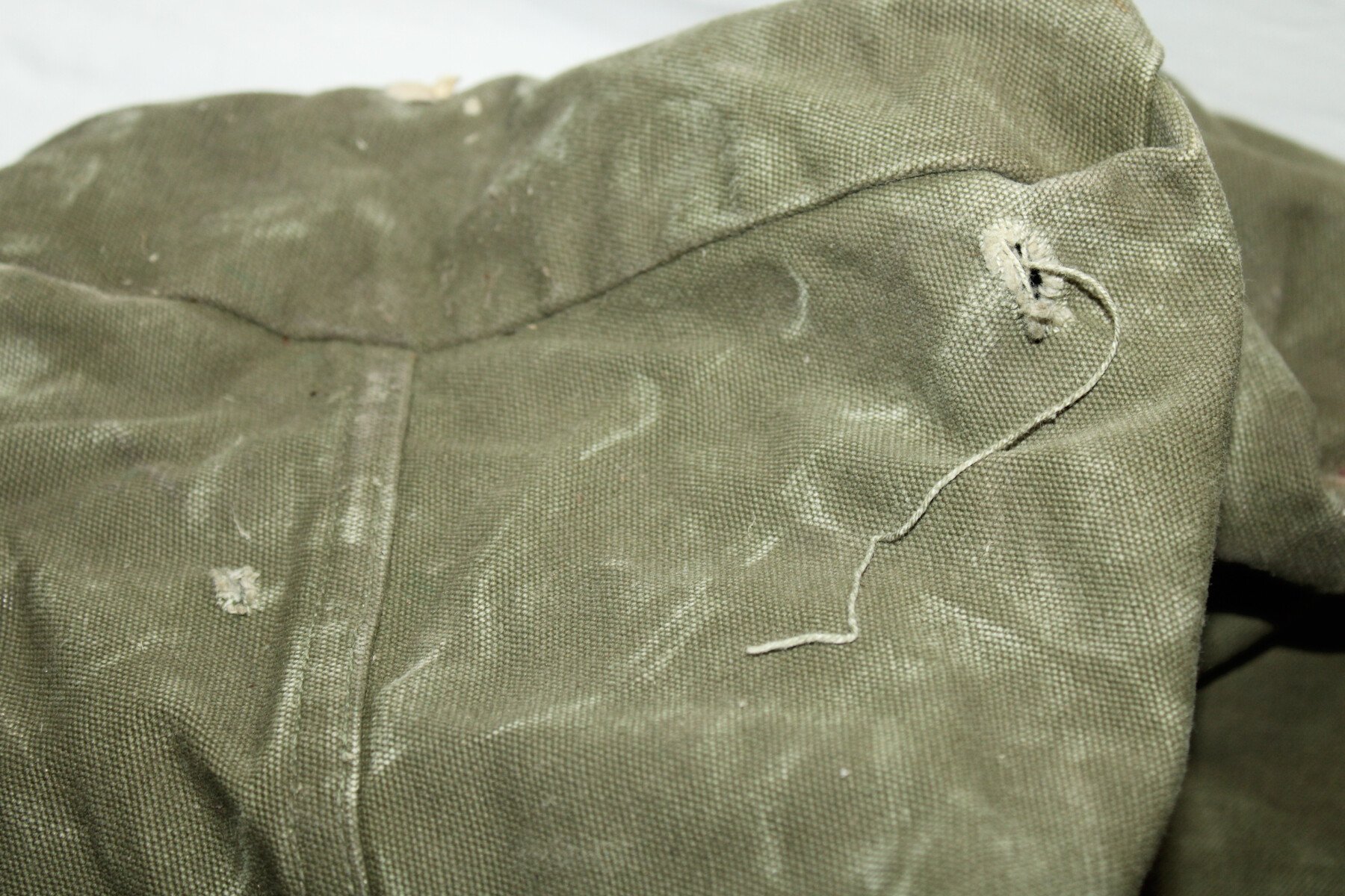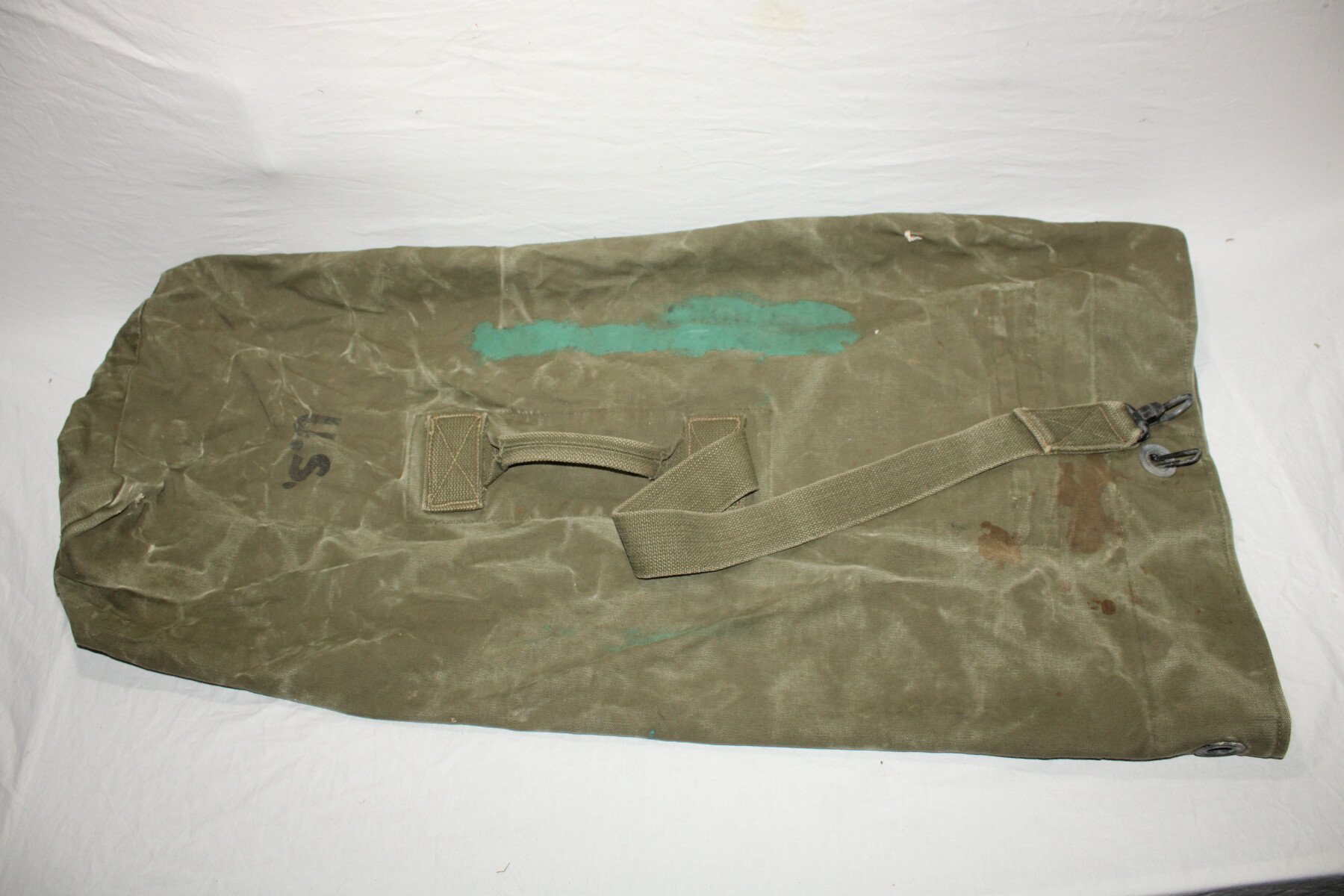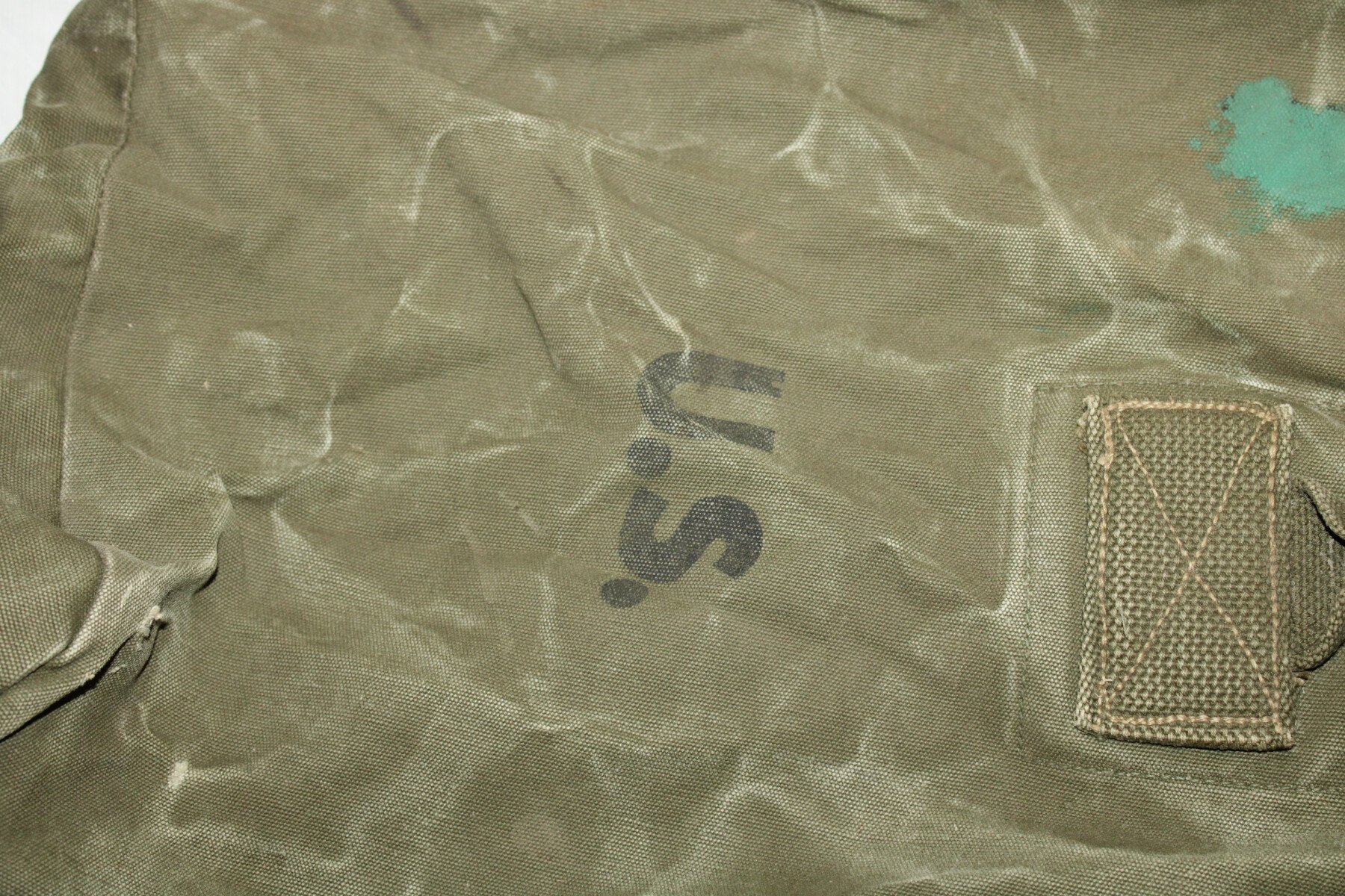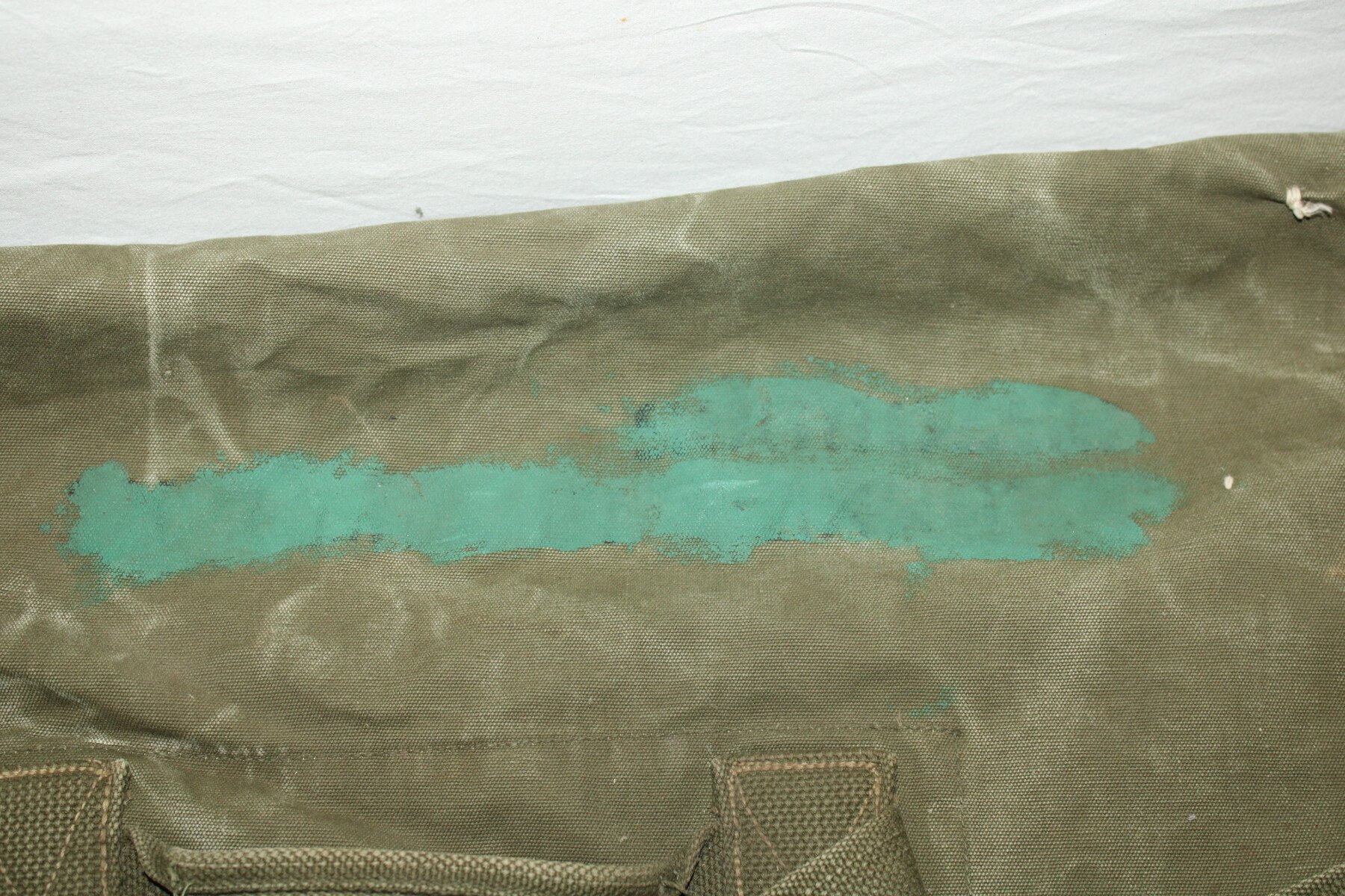 Sac à paquetage complet et bien marqué US avec à l'intérieur le marquage fabricant et la date 1943. Un accroc sur le dessous, nominatif et matriculé, recouvert à la peinture. Provient de camps cigarettes en Seine-Maritime.