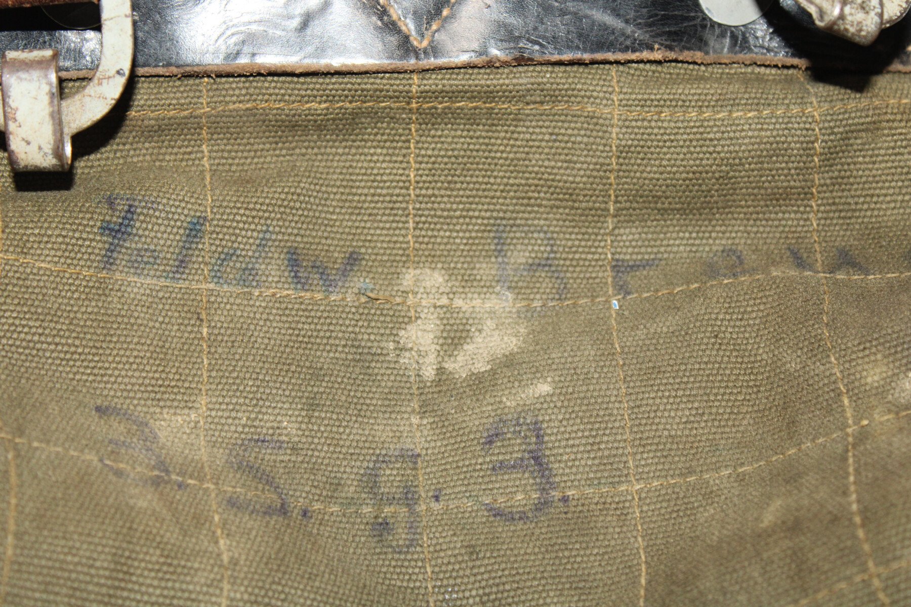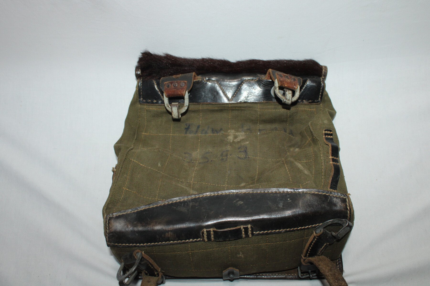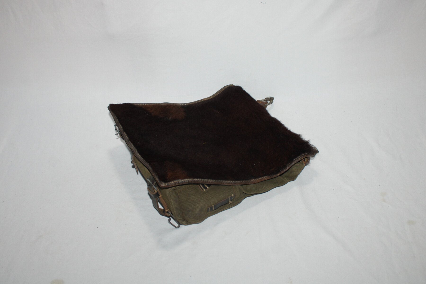 Sac à dos “peau de vache” sans ses bretelles de portage. Datée 1943. Nominatif au dos. Parfait état. Cuirs bien souple. Crochet supérieur présent.