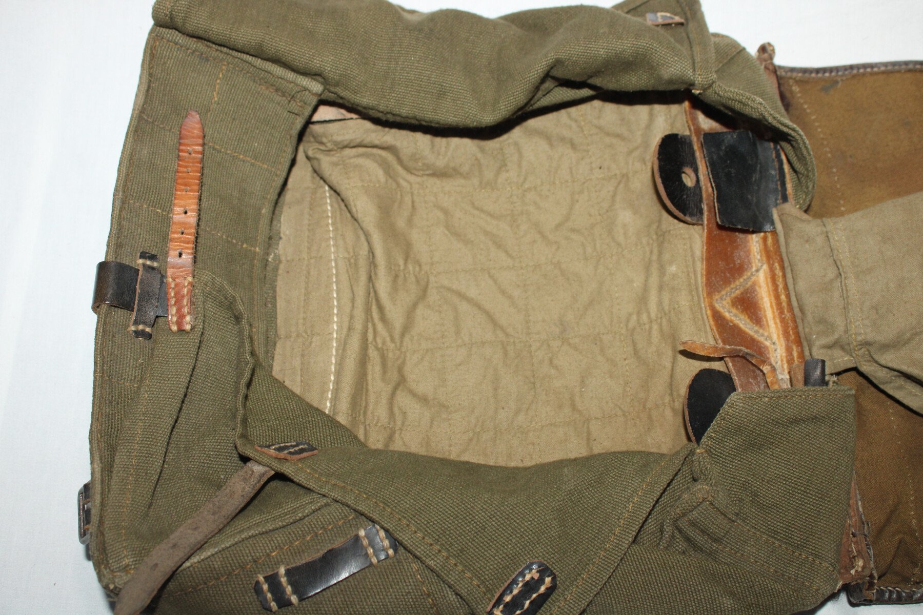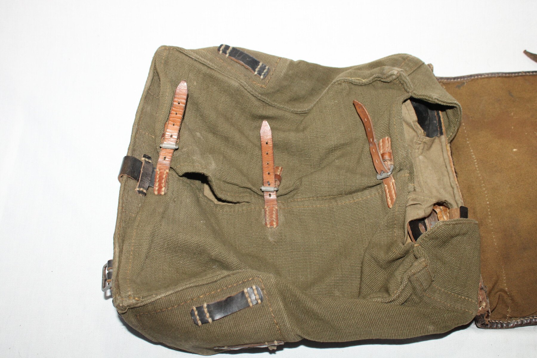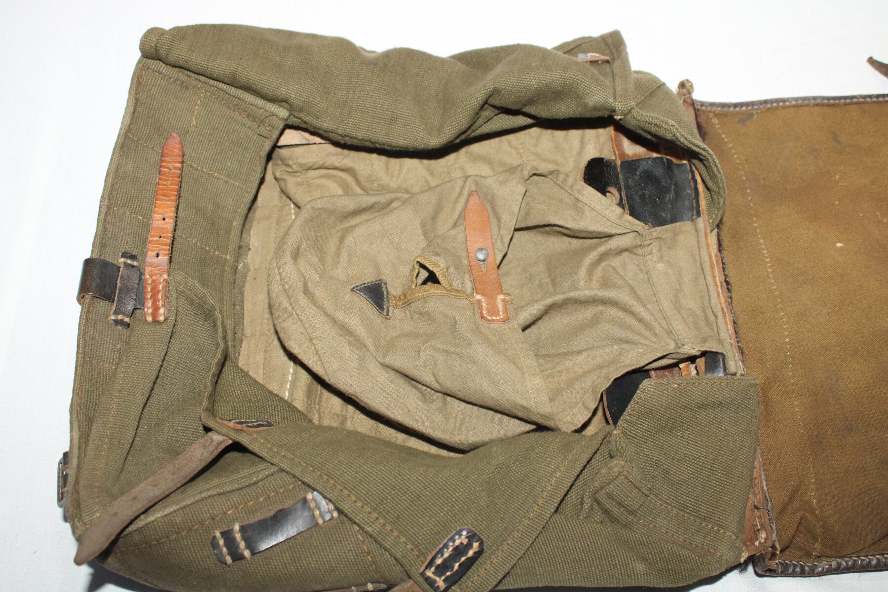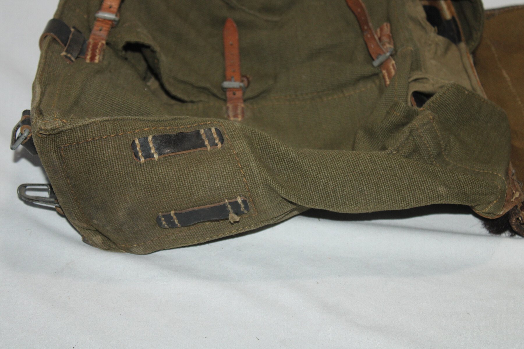 Sac à dos “peau de vache” sans ses bretelles de portage. Datée 1943. Nominatif au dos. Parfait état. Cuirs bien souple. Crochet supérieur présent.