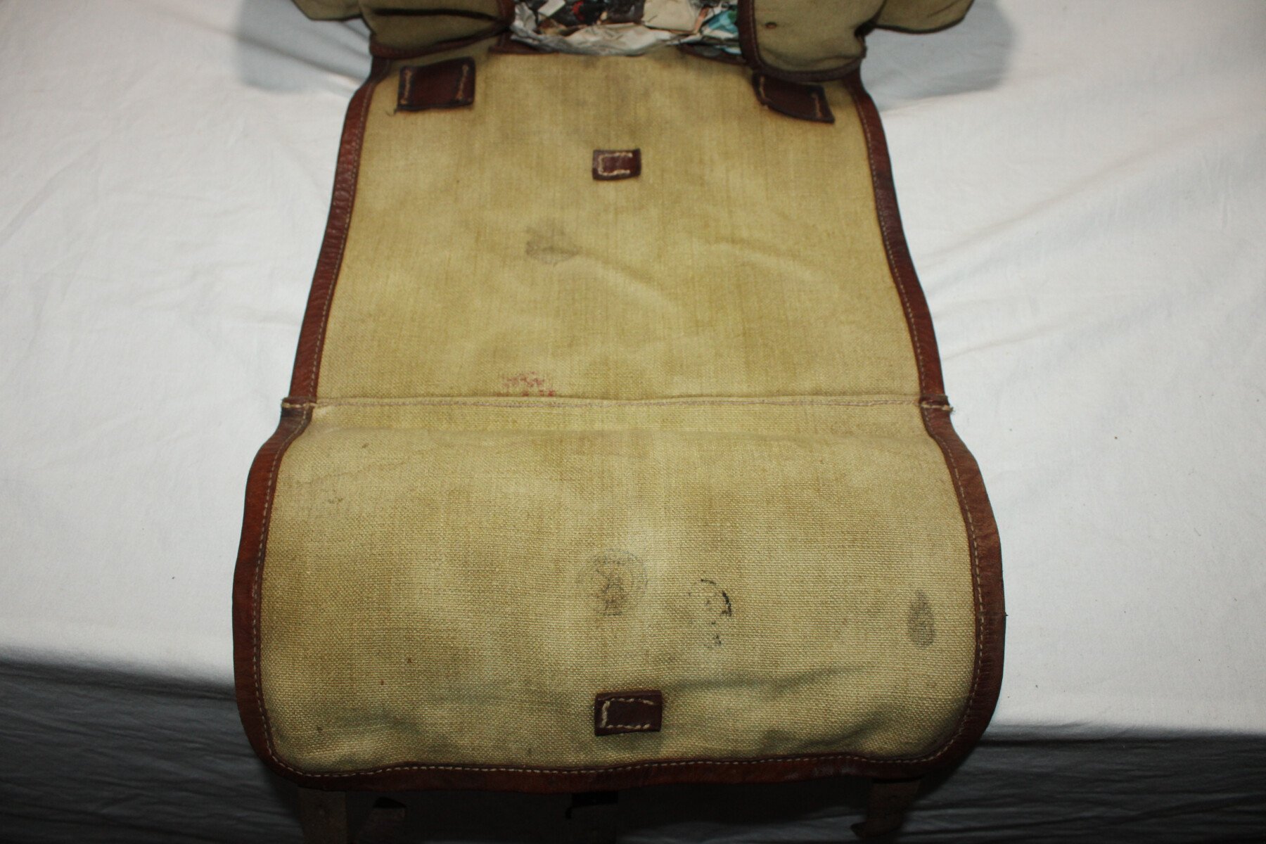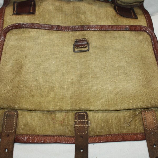 Sac supérieur modèle 1935 modifié 1937. Cuir souple. Tampon de date peu lisible. trace de rouille sur les parties métalliques. Une boucle absente. Bretelles absentes. Bon état général.