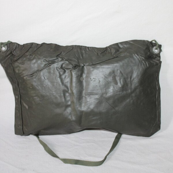 Musette en toile caoutchouté pour tenue anti gaz. Complet avec sa sangle et ses boutons, pas déchiré ni percé.