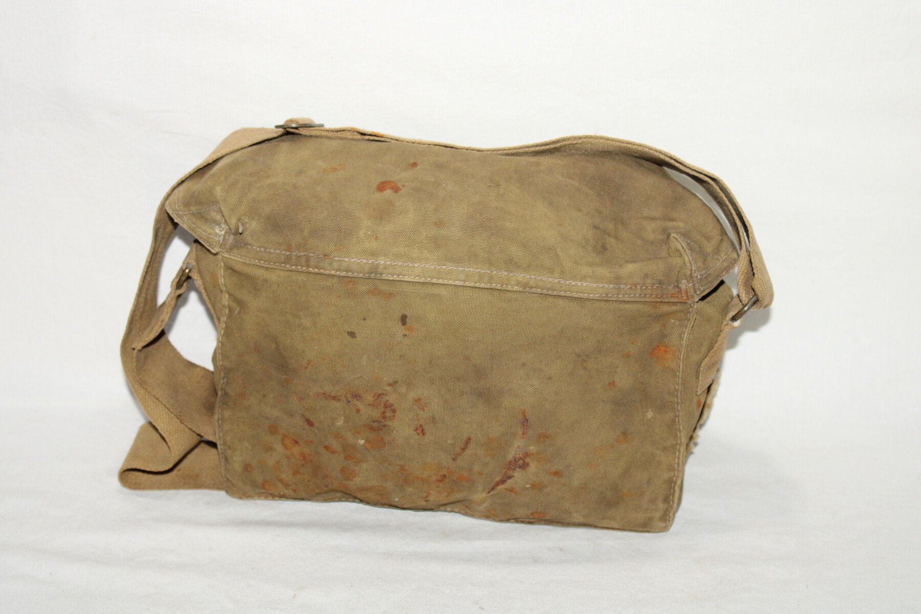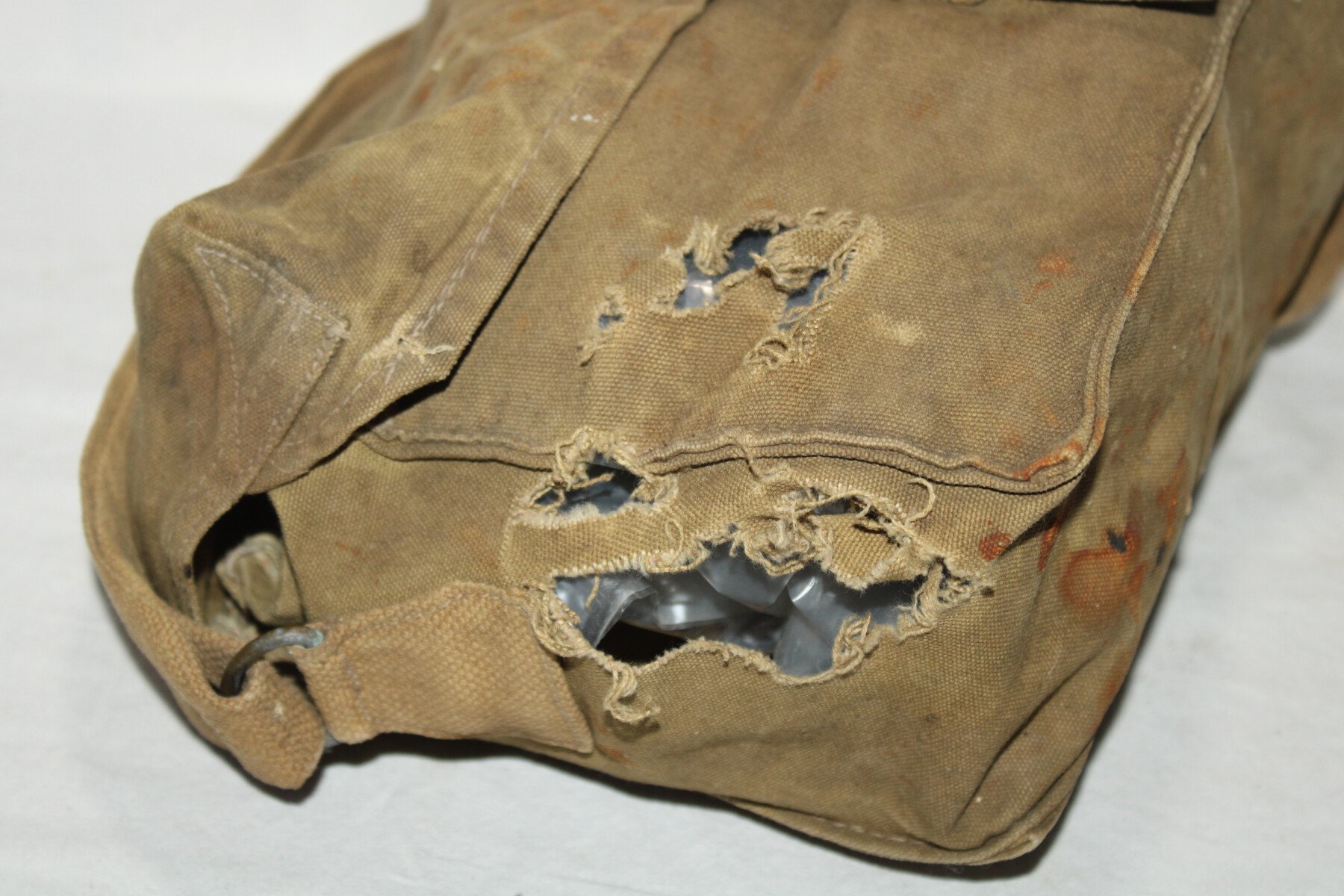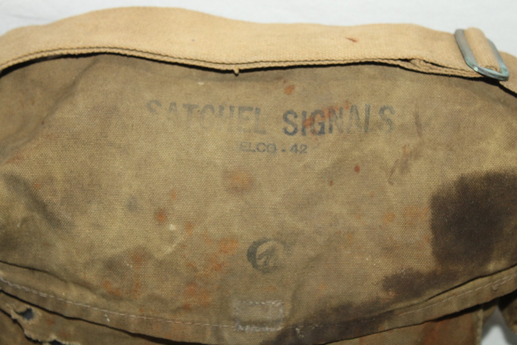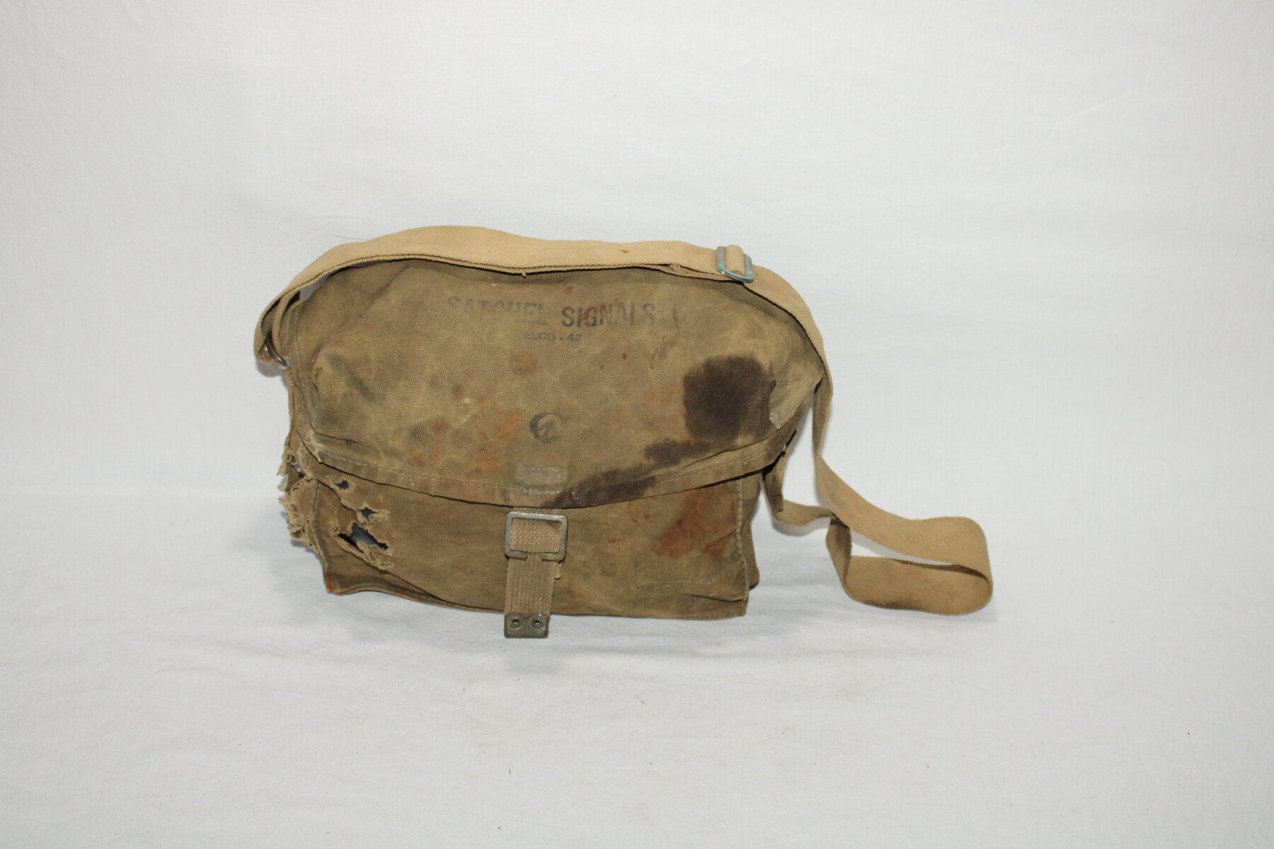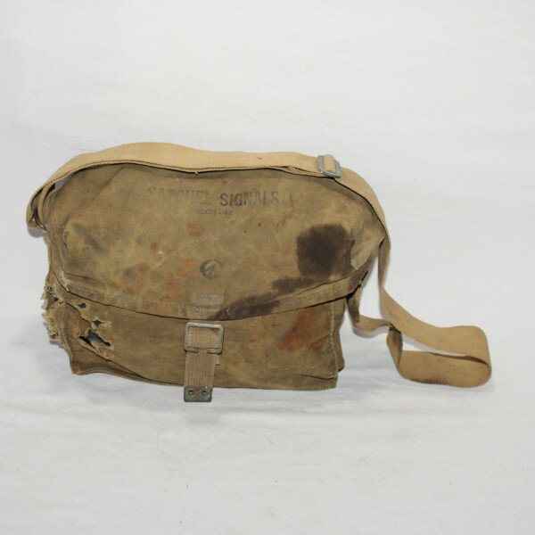 Musette satchel signals pour les équipements radios. Fabrication Canadienne datée 1942 sur le sac. Déchirés sur le coté. Nombreuse tache.