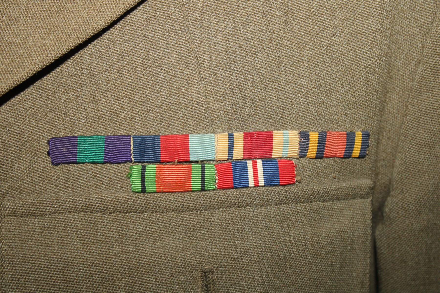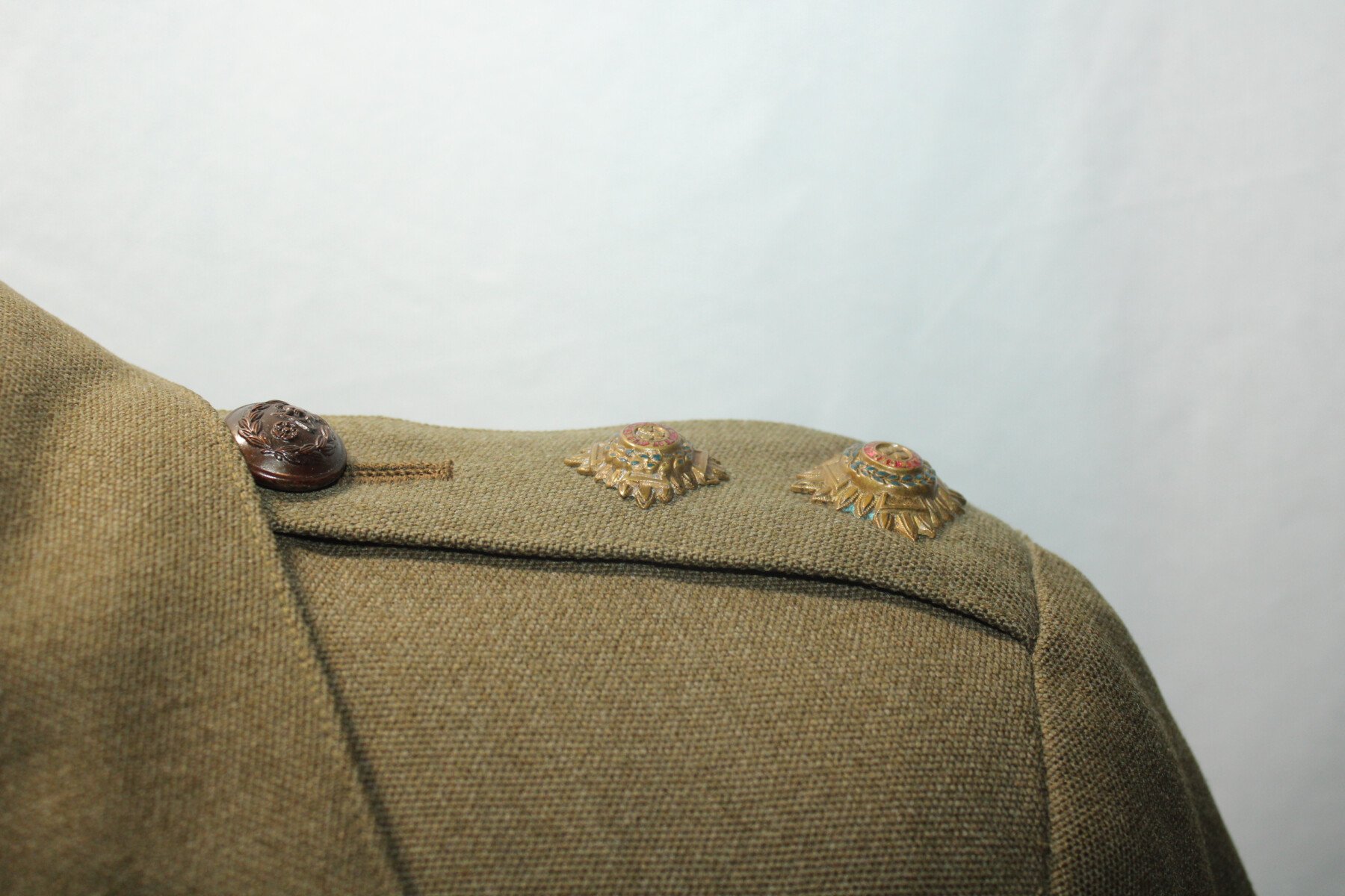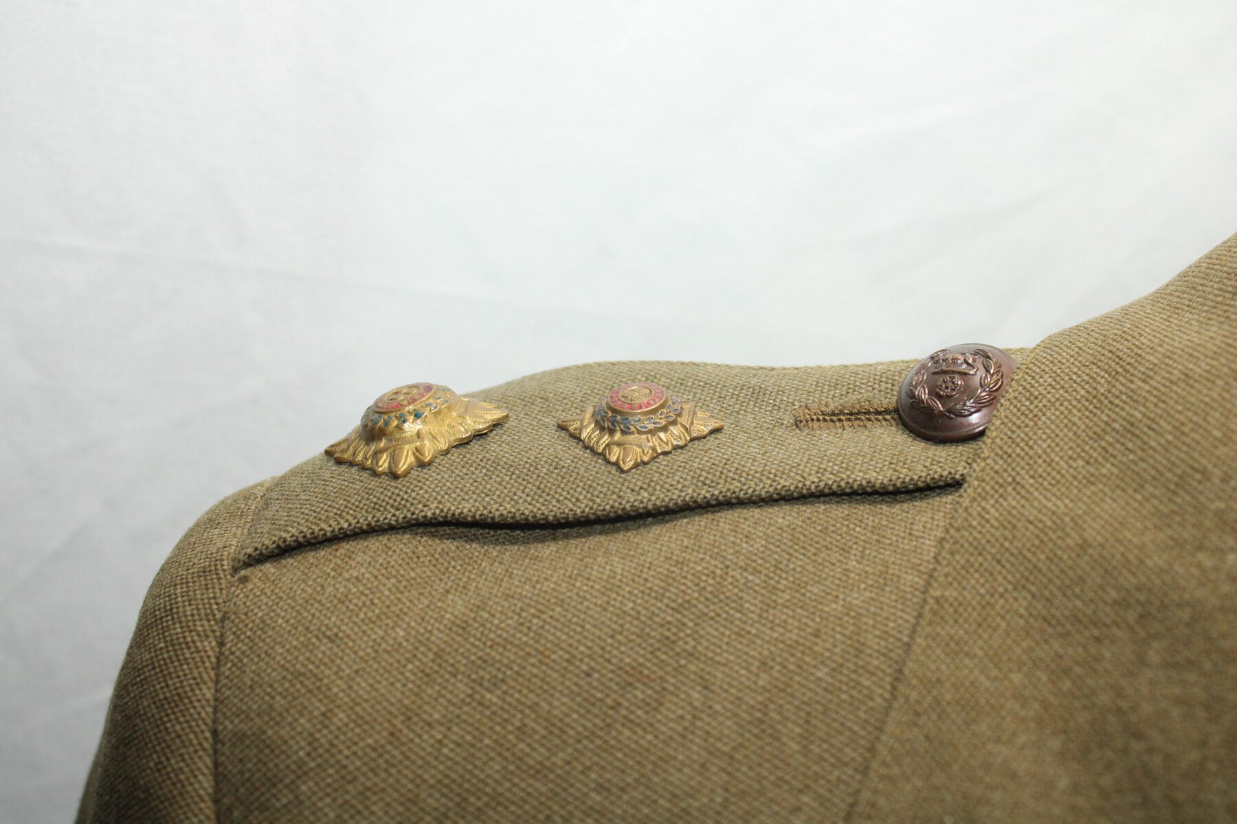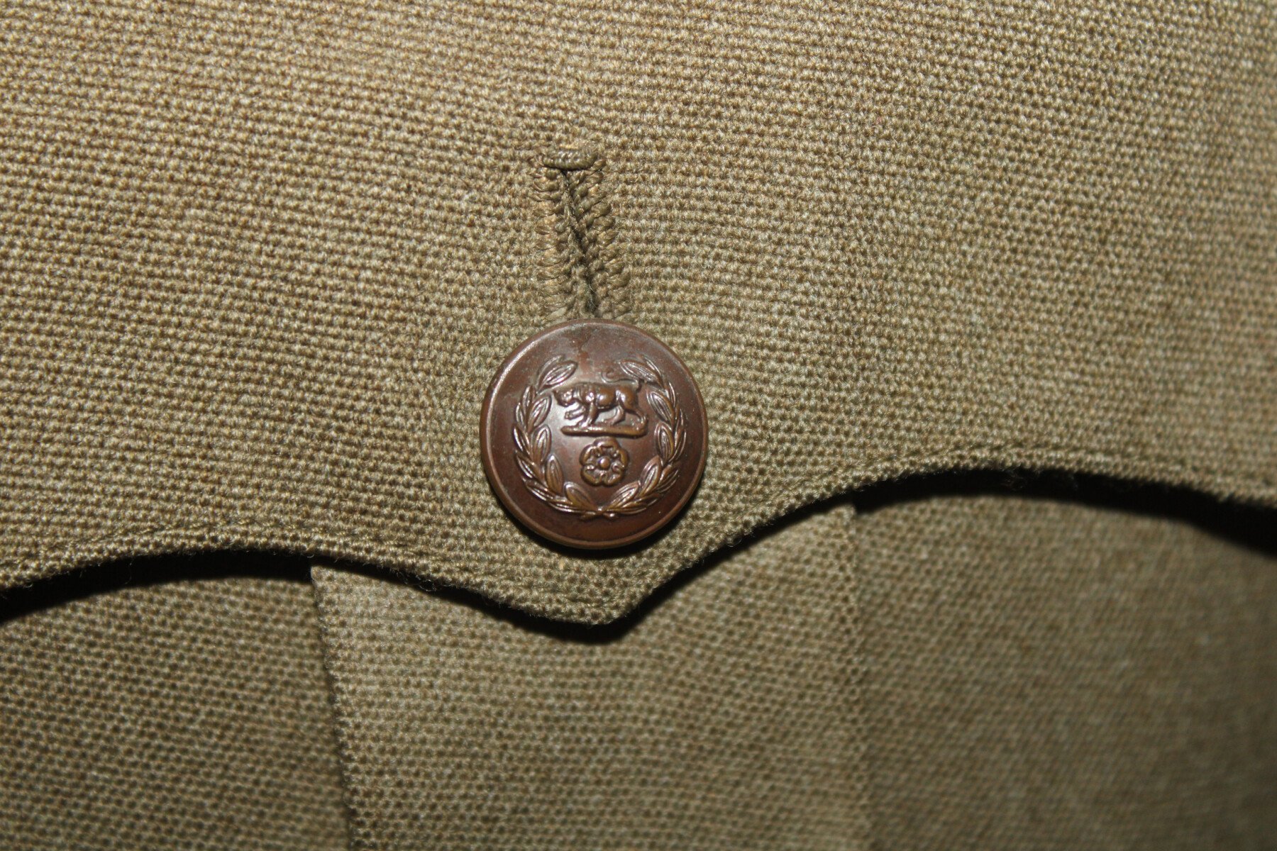 Uniforme service dress de Lieutenant de l'Hampshire régiment, avec boutons laitons du régiment. Les boutons avant sont absent. Ruban de médaille monté d'origine. Trous sur le bas des poches....