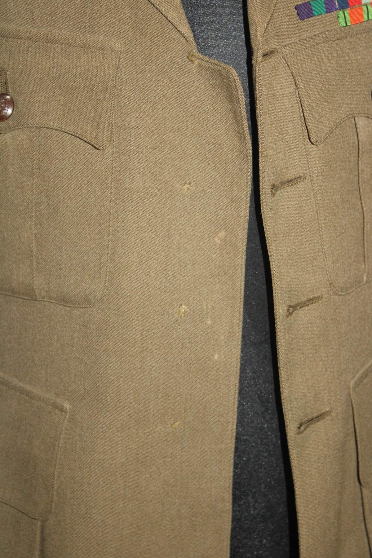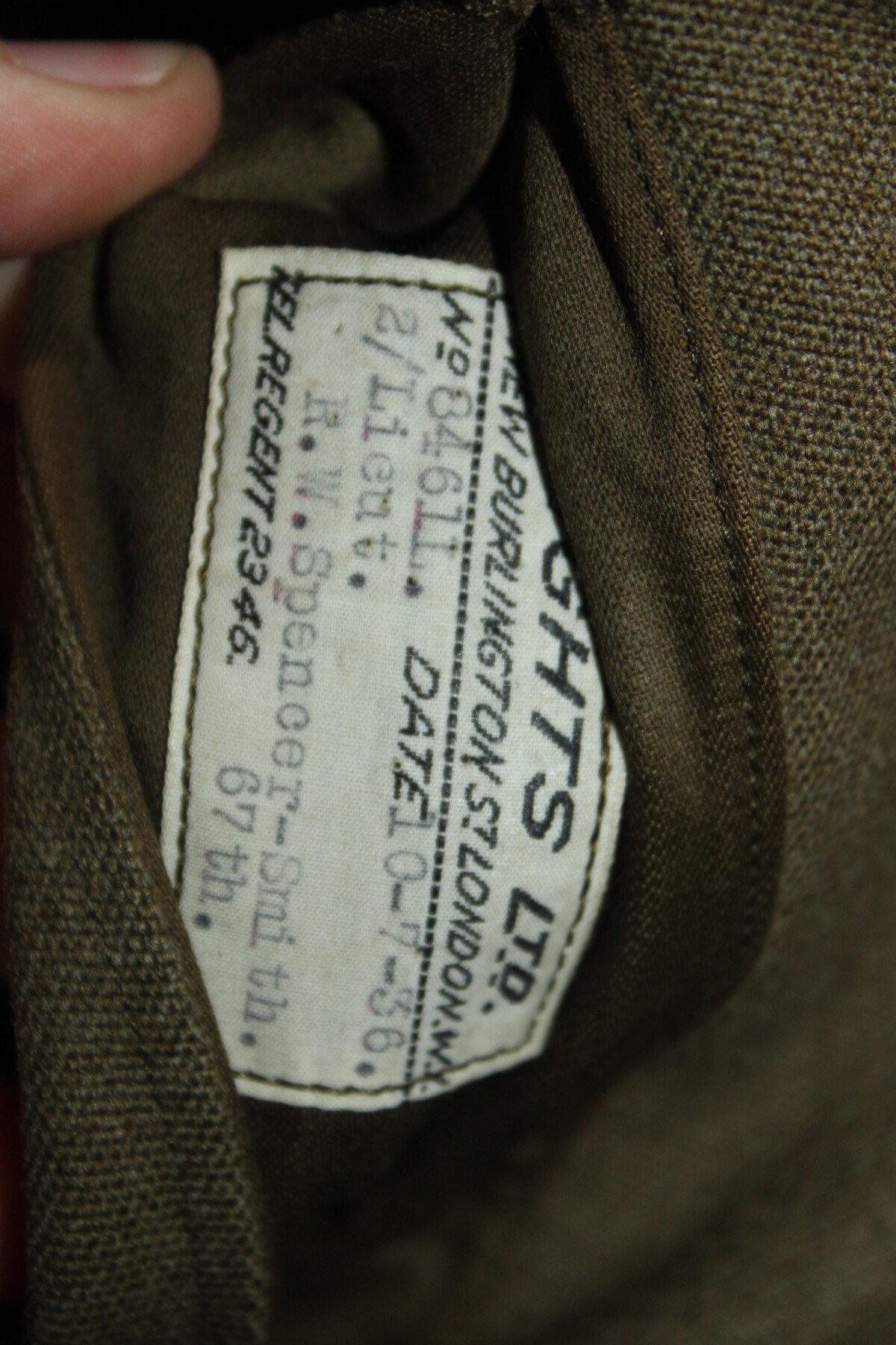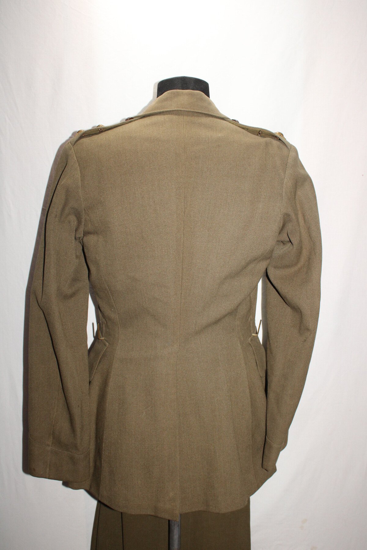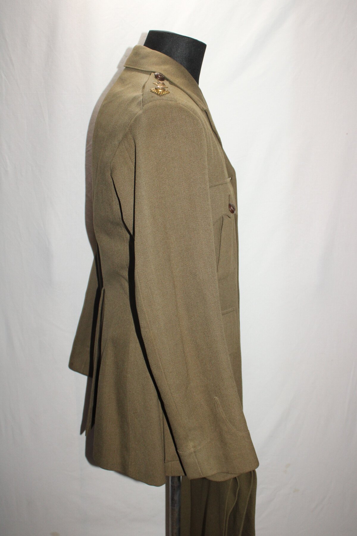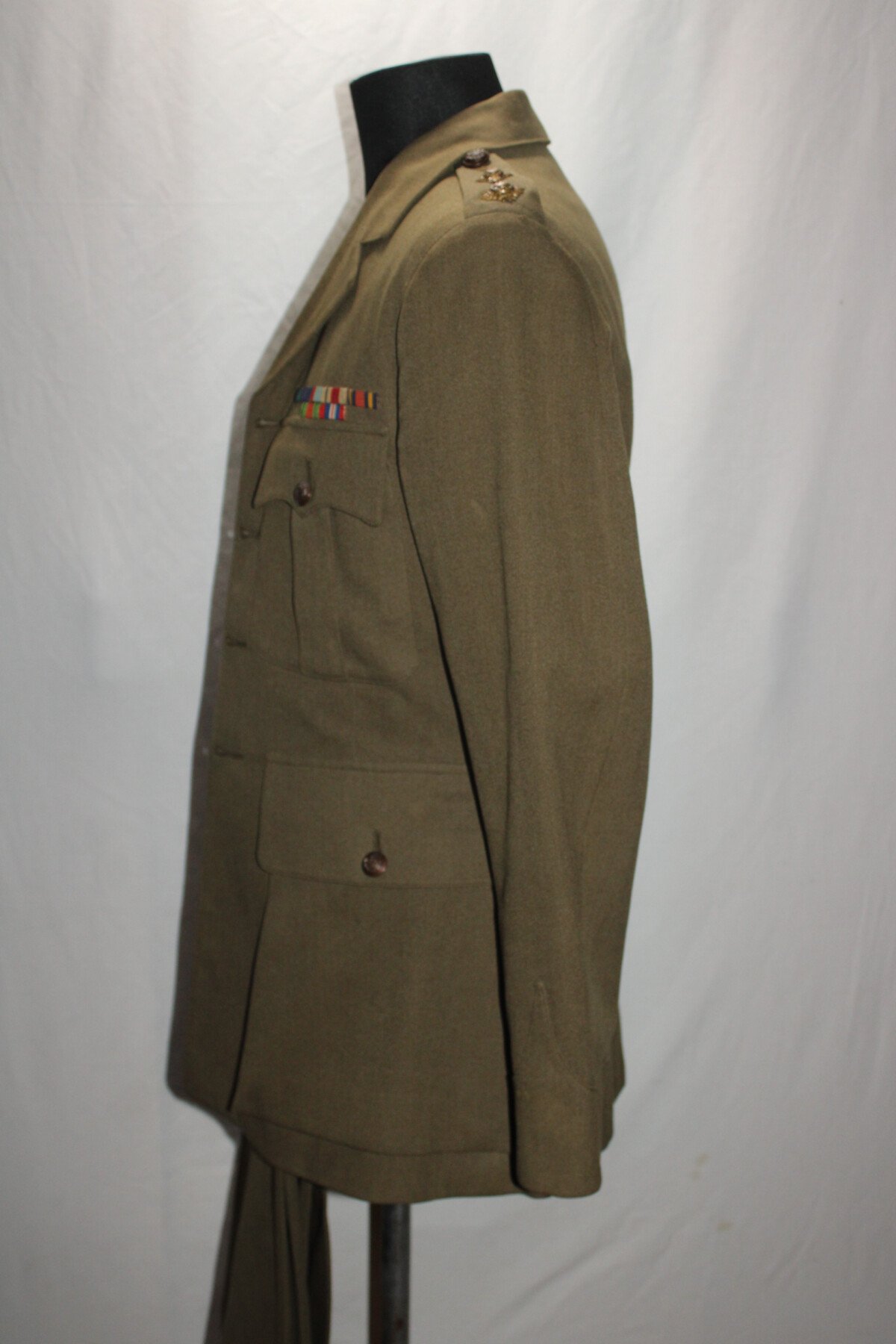 Uniforme service dress de Lieutenant de l'Hampshire régiment, avec boutons laitons du régiment. Les boutons avant sont absent. Ruban de médaille monté d'origine. Trous sur le bas des poches. Etiquette de tailleur dans la poche daté 1936. Largeur d'épaule: 42cm, longueur de manche: 66cm. Pantalon, daté 1940. Taille : Tour de taille à plat 44cm, longueur de jambe 113cm.
