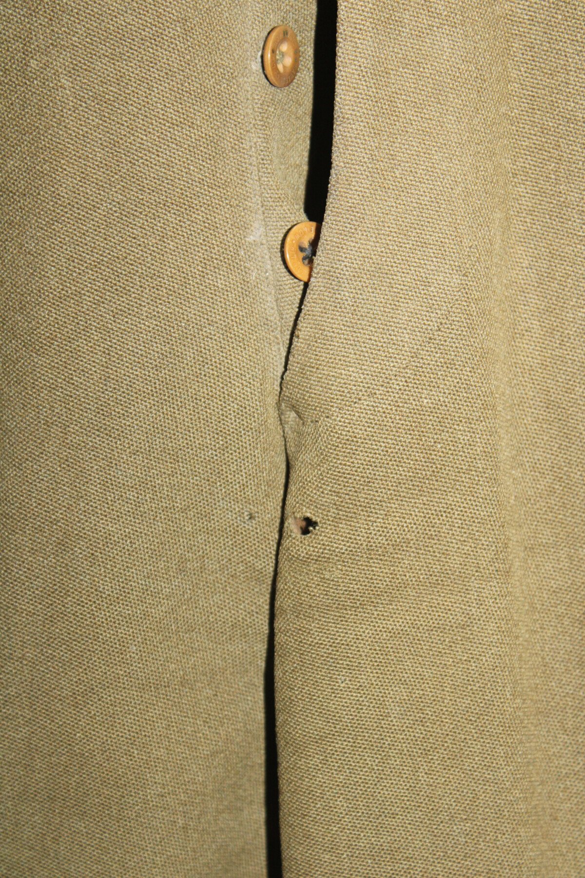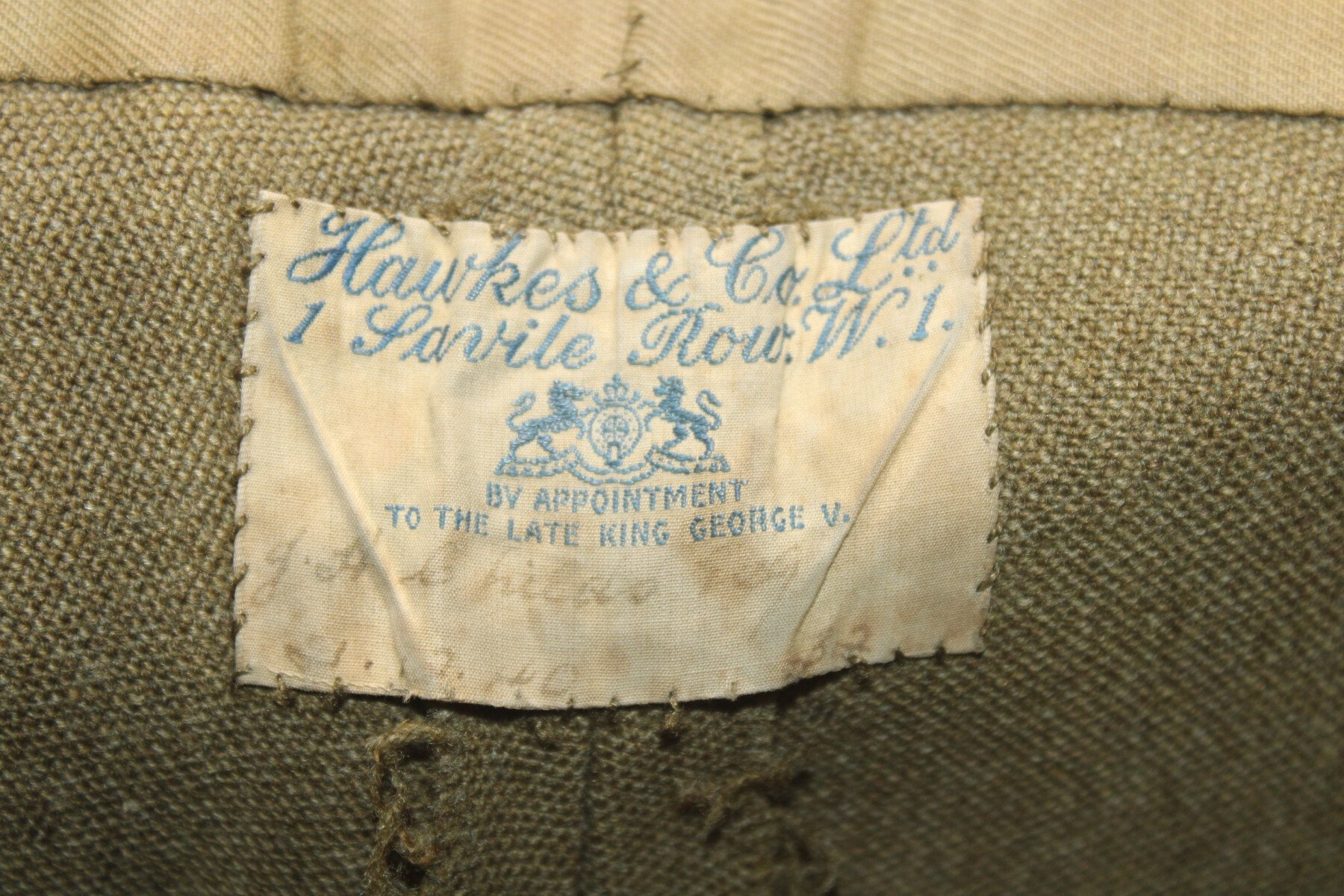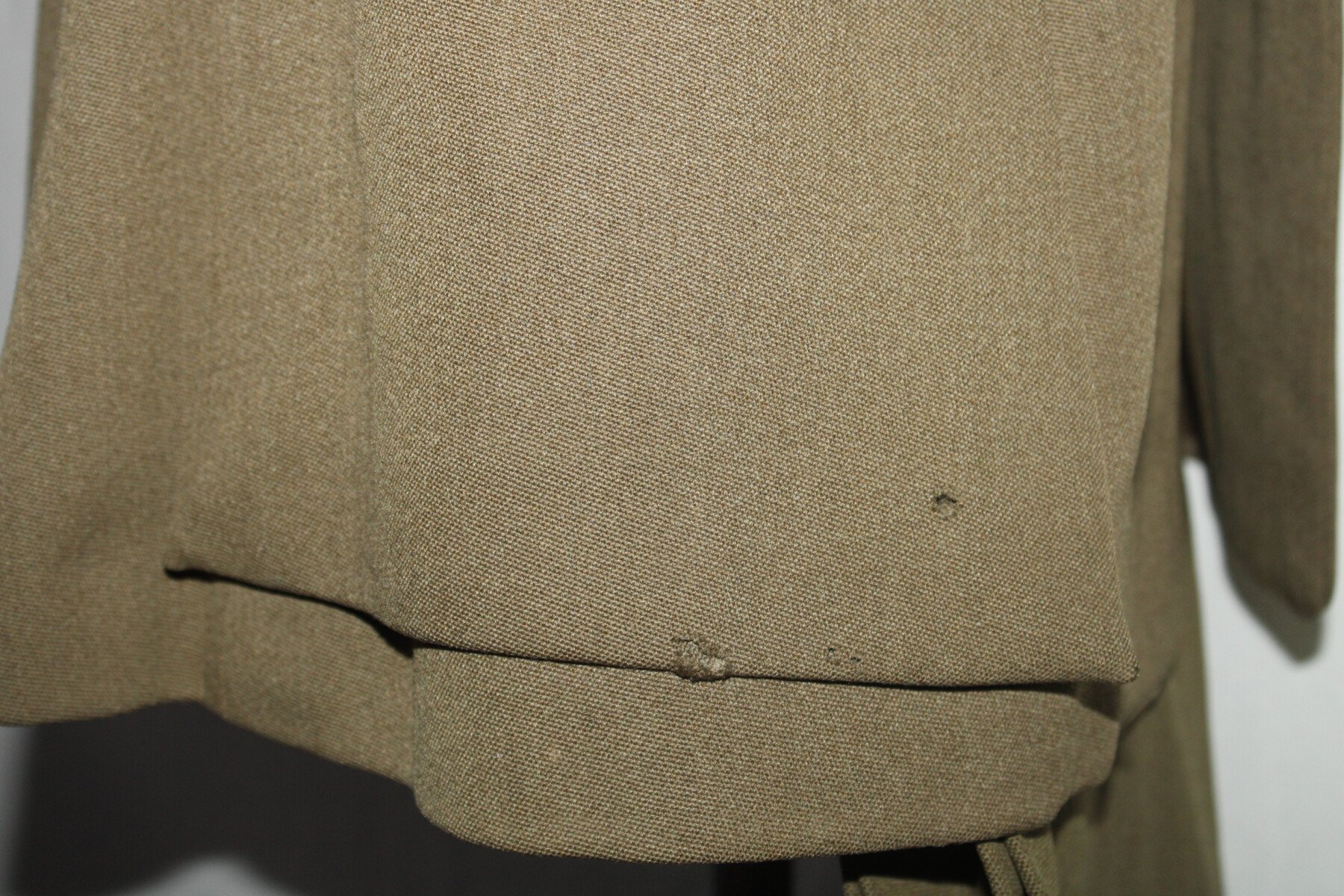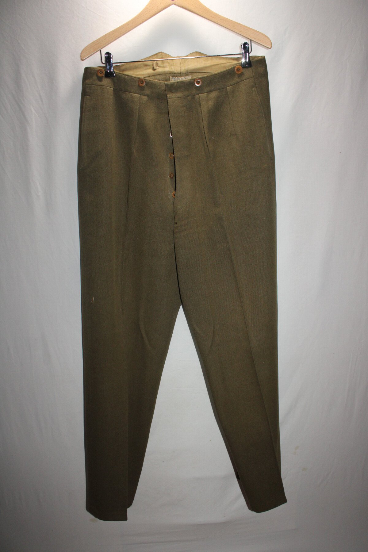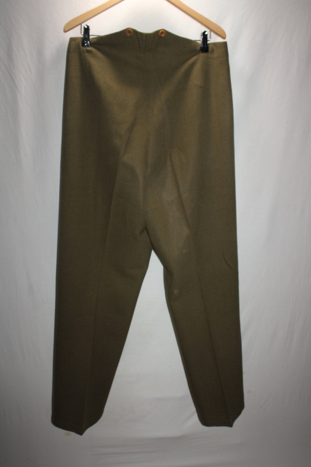Uniforme service dress de Lieutenant de l'Hampshire régiment, avec boutons laitons du régiment. Les boutons avant sont absent. Ruban de médaille monté d'origine. Trous sur le bas des poches. Etiquette de tailleur dans la poche daté 1936. Largeur d'épaule: 42cm, longueur de manche: 66cm. Pantalon, daté 1940. Taille : Tour de taille à plat 44cm, longueur de jambe 113cm.