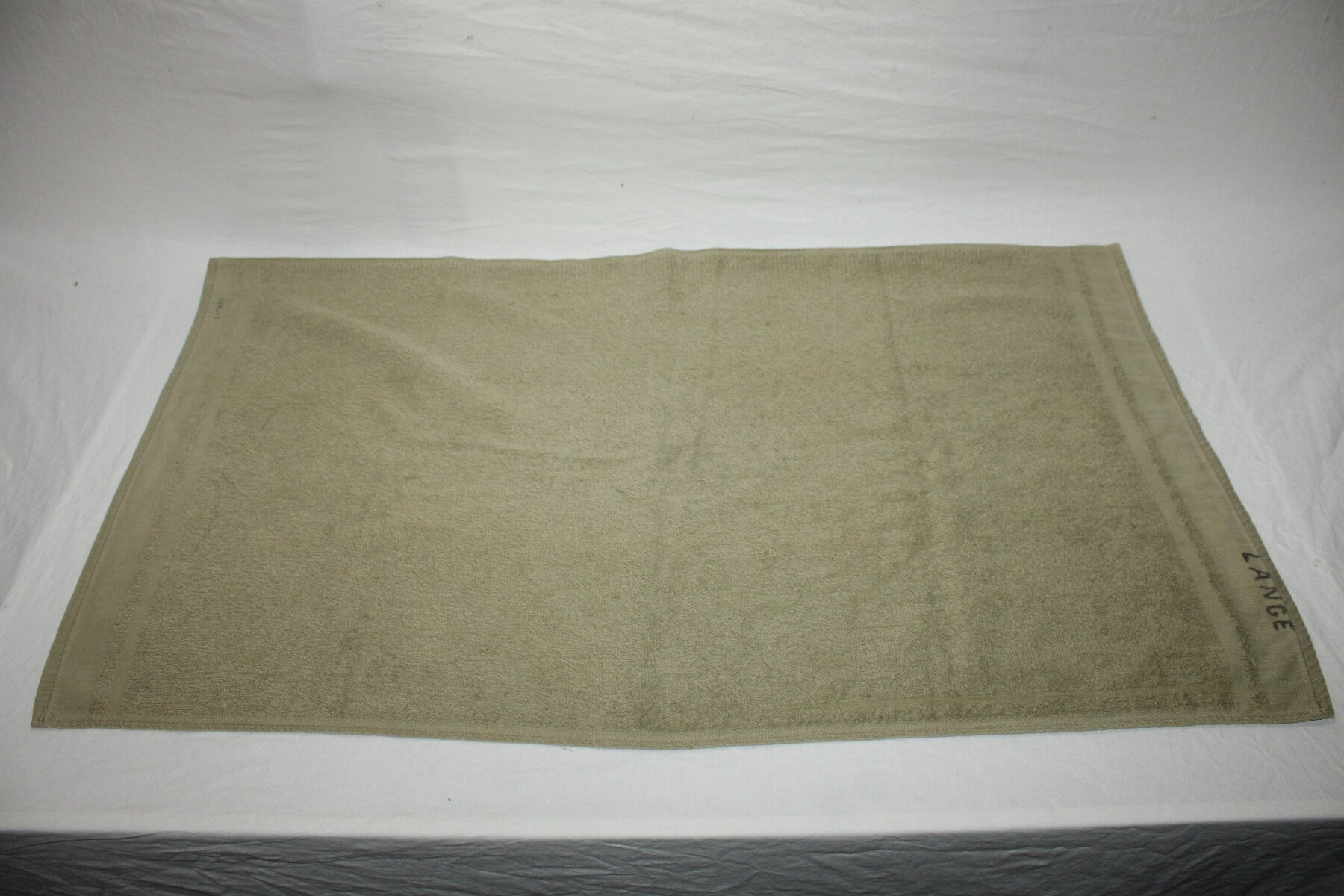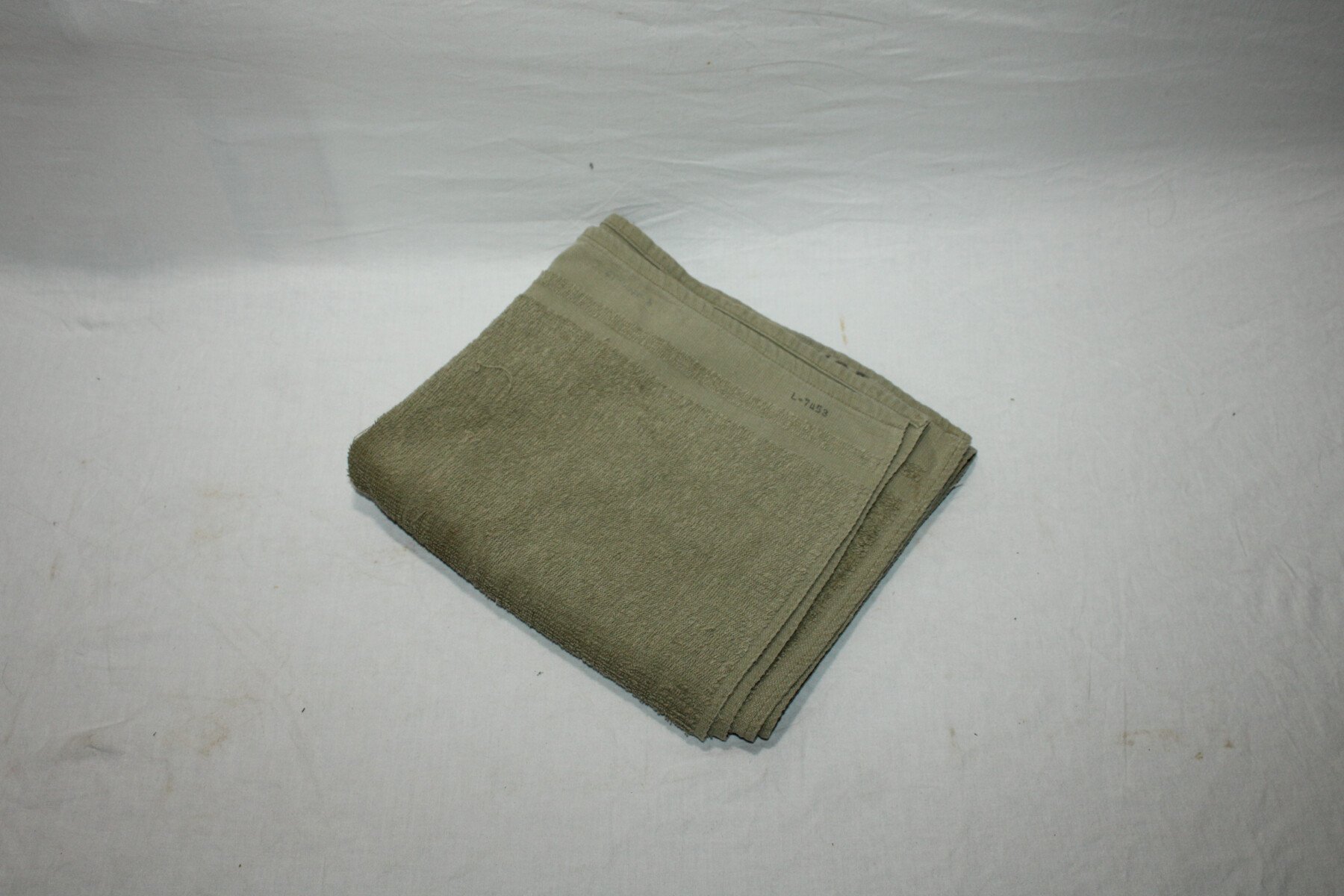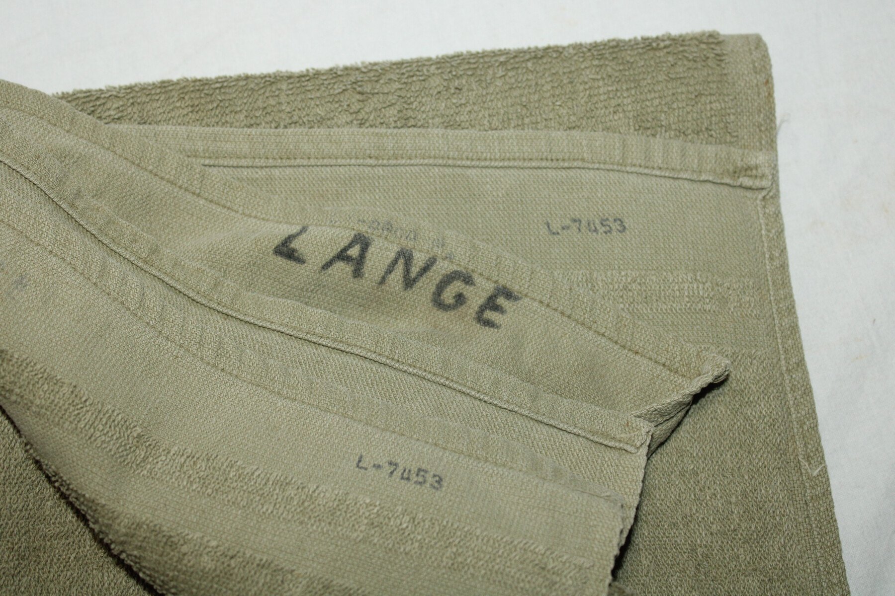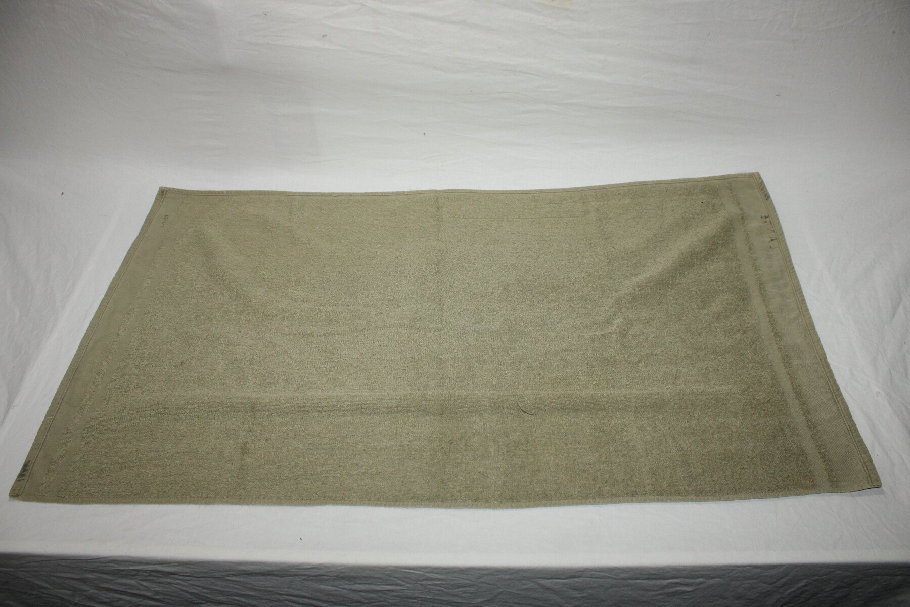 Serviette de toilette kaki, fabrication pour l'armée Américaine. Des laundrys numbers et un nom y sont visibles. Provient de camps cigarettes en Seine-Maritime.