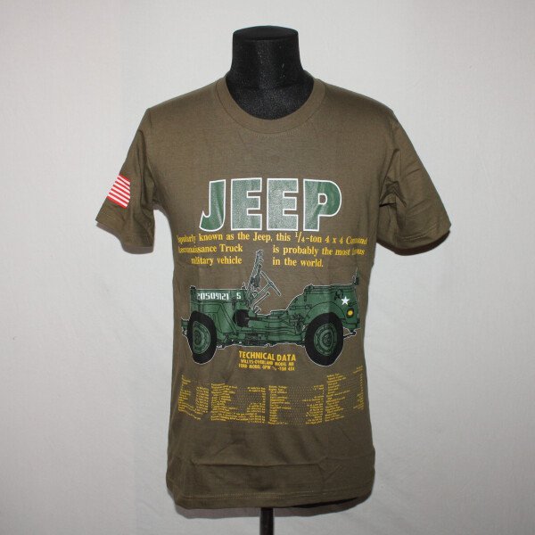Le tee-shirt est sérigraphié Jeep sur le devant. Le drapeau américain est présent sur la manche droite. Ce tee-shirt kaki est 100% coton, 190 gr/m2.