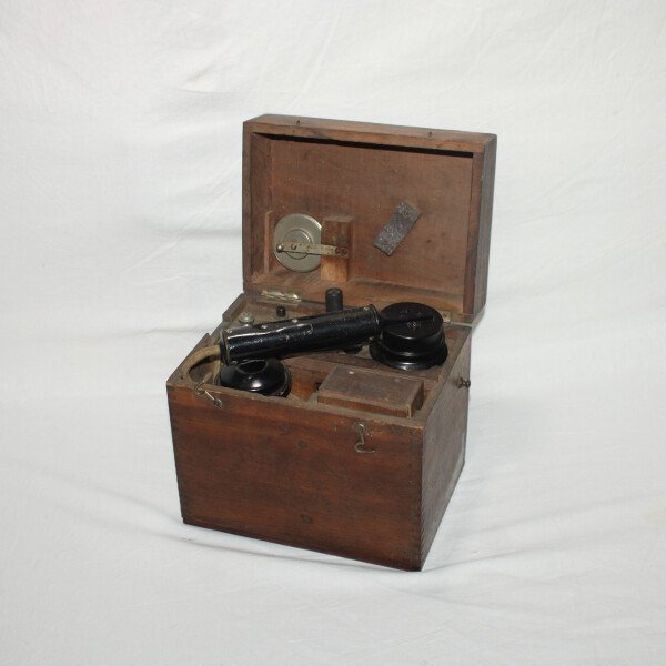 Telephone modèle 1916. Fabrication G.Mambret&cie. Complet avec sont combiné, écouteur en pièce de rechange dans la boite. Un éclat sur le combiné. Sangle de transport absente. Marqué TM à plusieurs endroits.