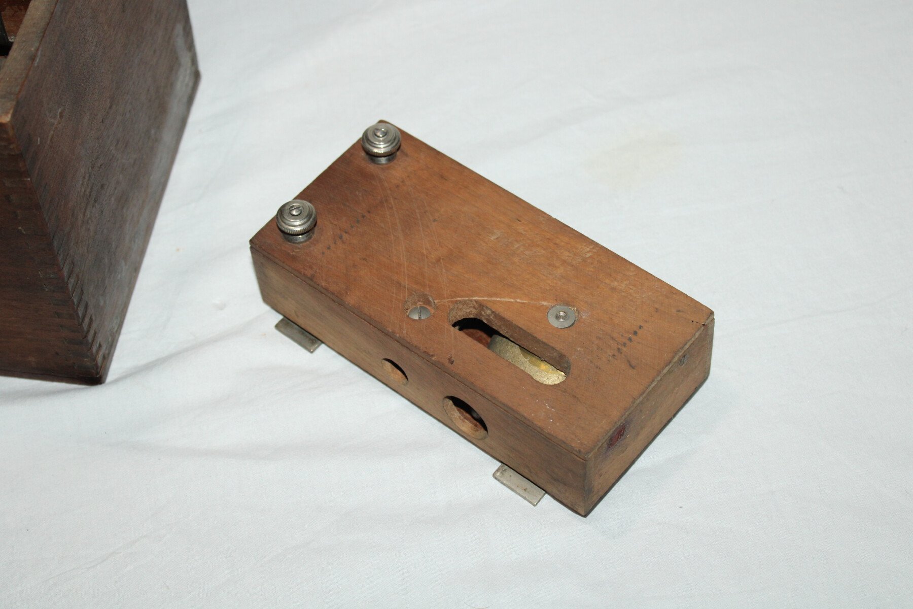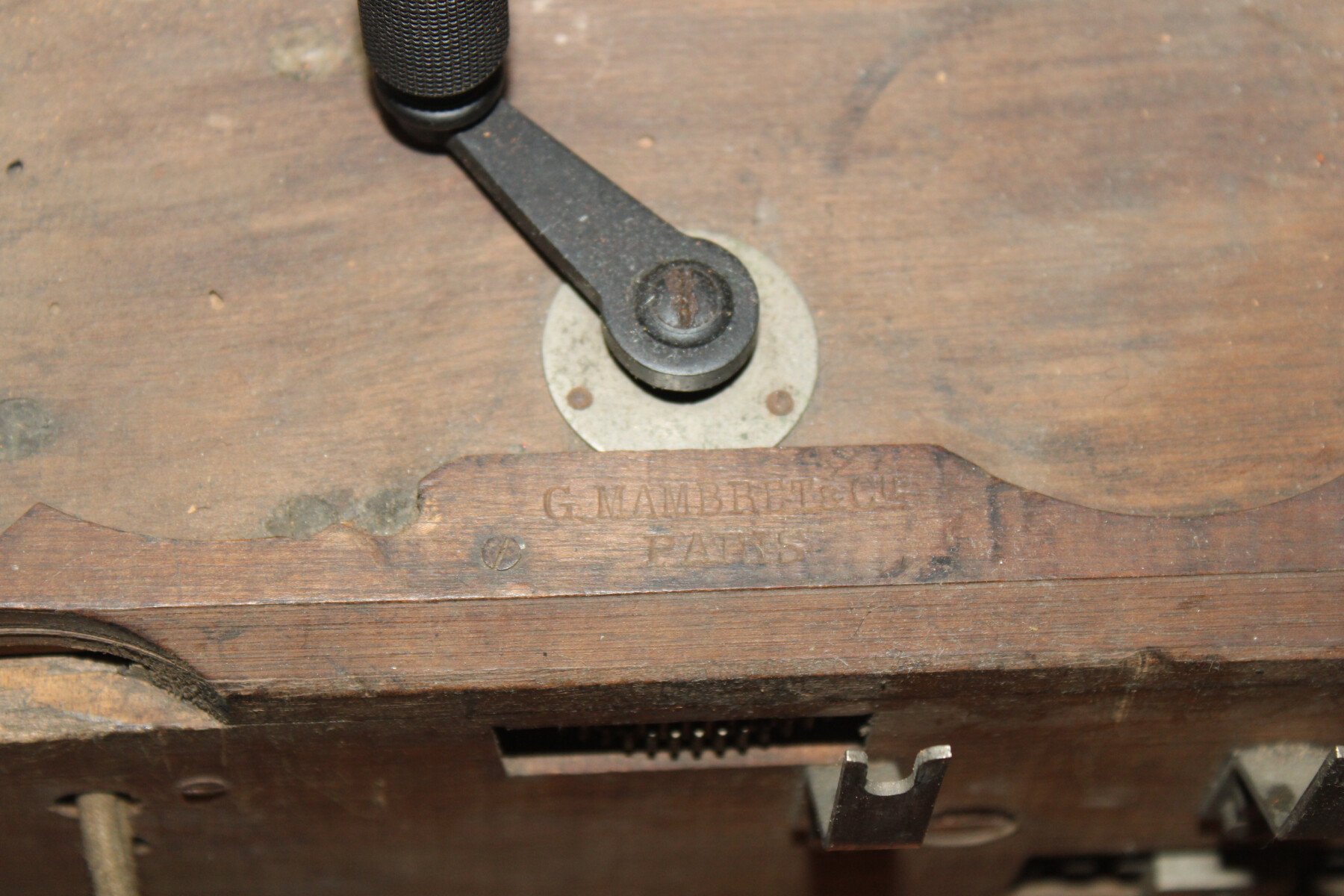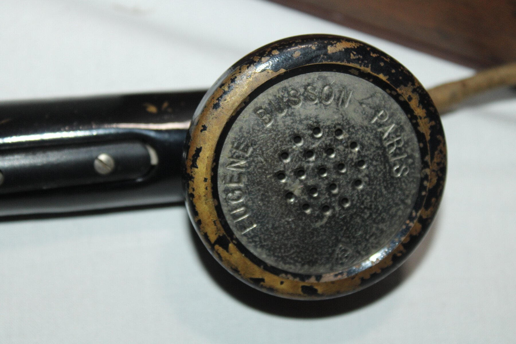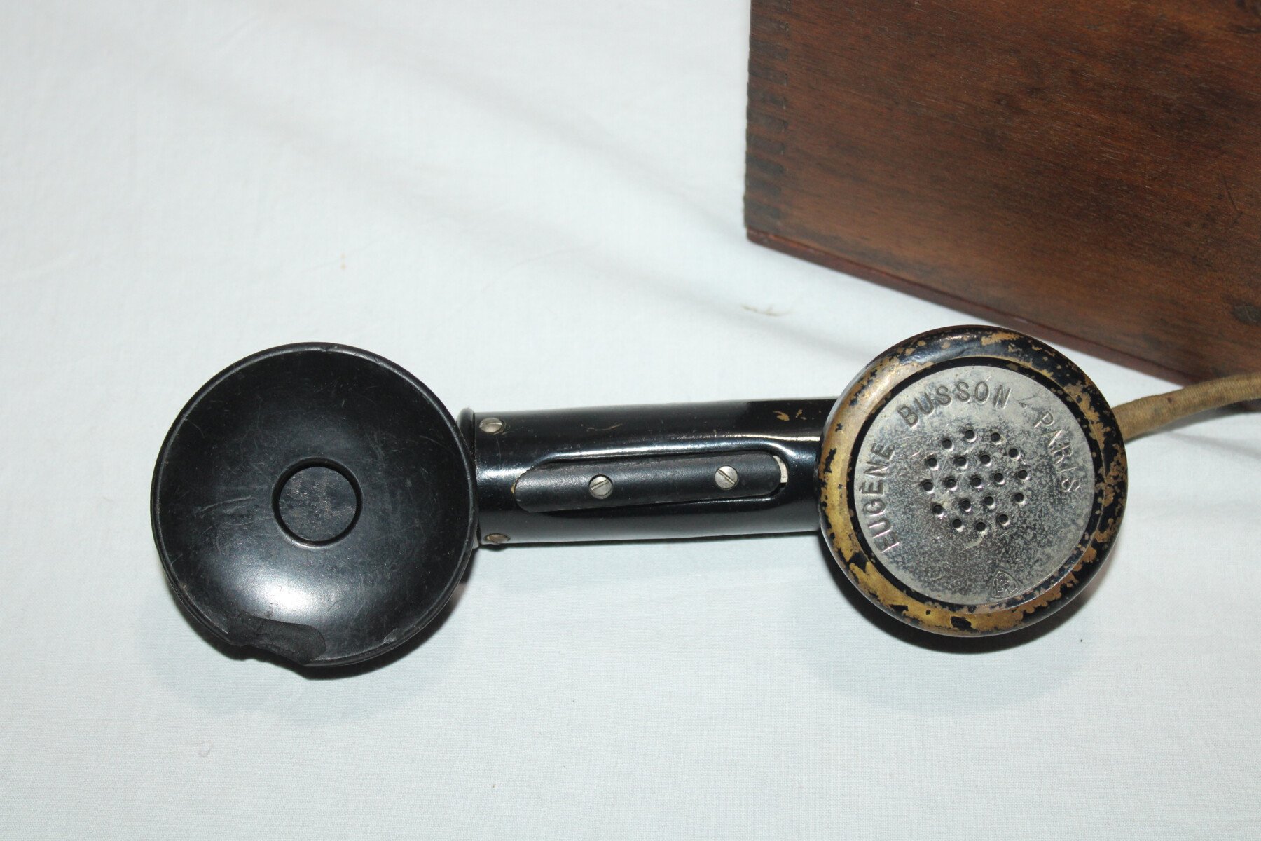 Telephone modèle 1916. Fabrication G.Mambret&cie. Complet avec sont combiné, écouteur en pièce de rechange dans la boite. Un éclat sur le combiné. Sangle de transport absente. Marqué TM à...