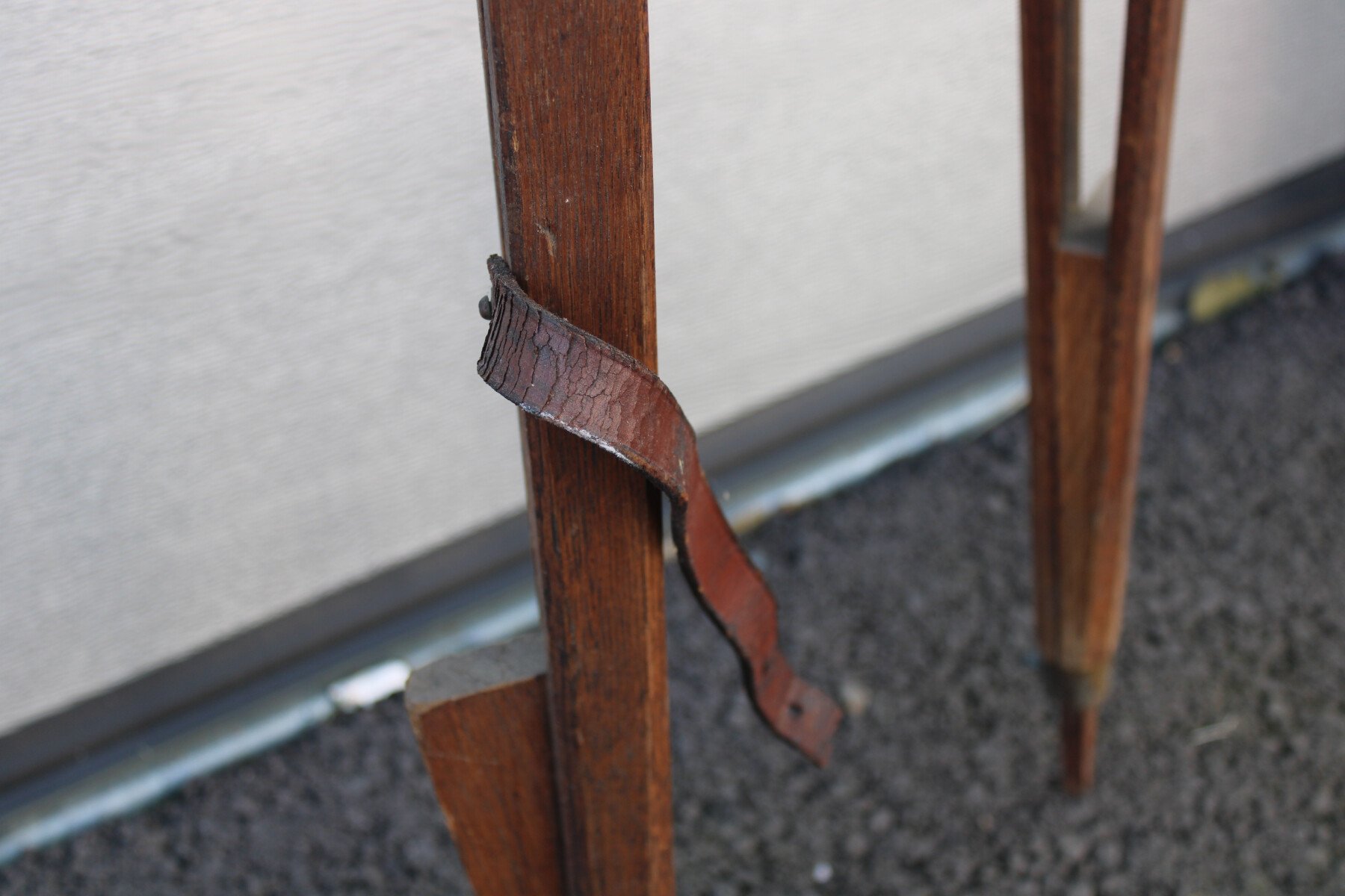Trépied a branche fixe non repliable pour micromètre tournant. Fabrication Huet Paris, marqué ministère de la guerre. Sanglon en cuir cassé. Hauteur 140cm.