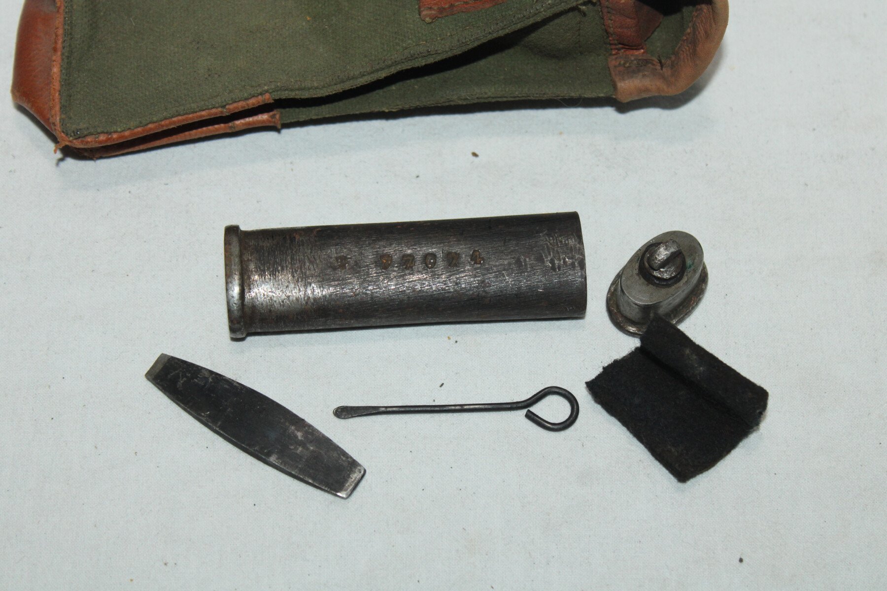 Trousse d'entretien pour le fusil semi automatique RCS 17, en toile verte, et en cuir. Languette en cuir et petit compartiment en cuir présent avec son bouton grelot. Avec nécessaire de nettoyage modèle 1874.