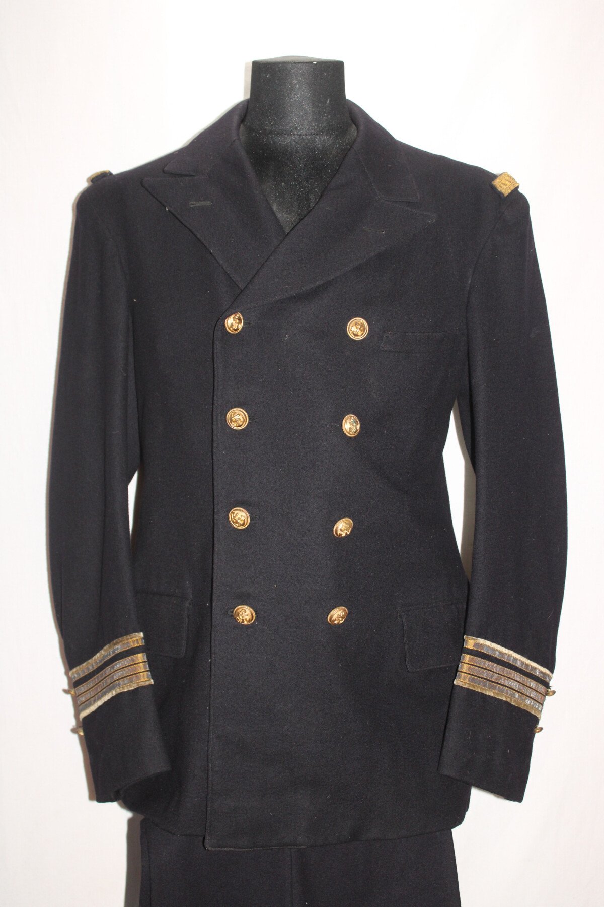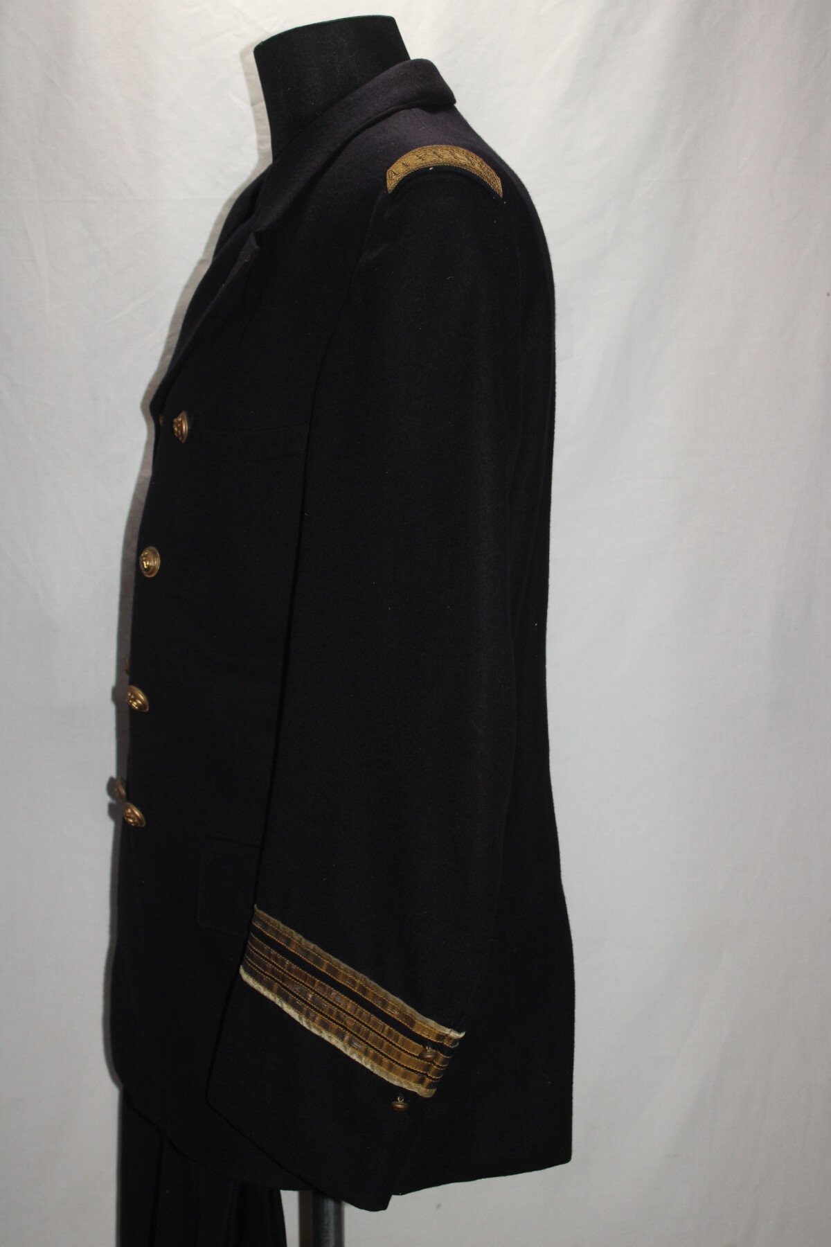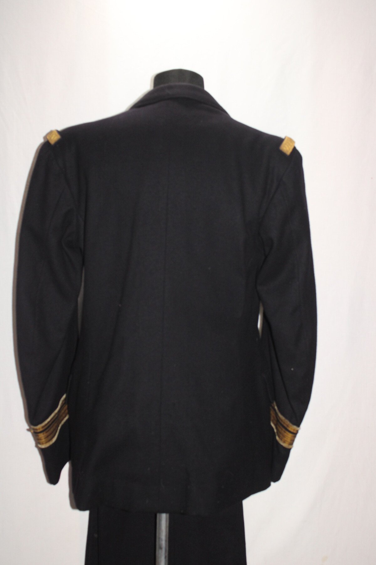 Vareuse en drap de laine de la marine nationale au grade de capitaine de corvette. Bel état général. Taille: largeur d'épaules 50cm à plat. Longueur de manche: 66 cm. Pantalon droit, un petit...