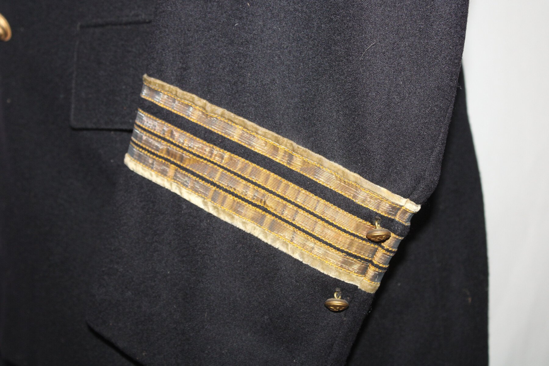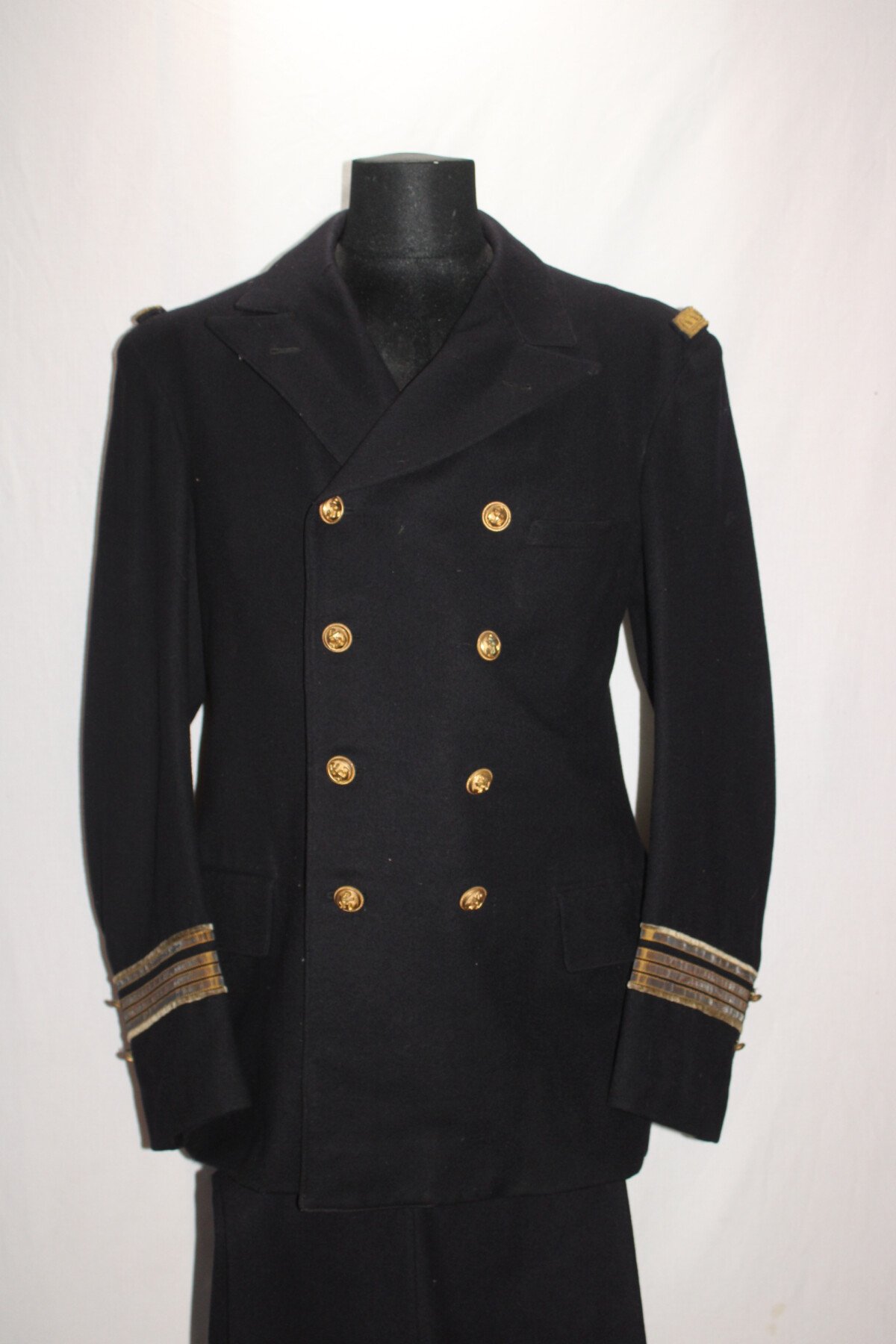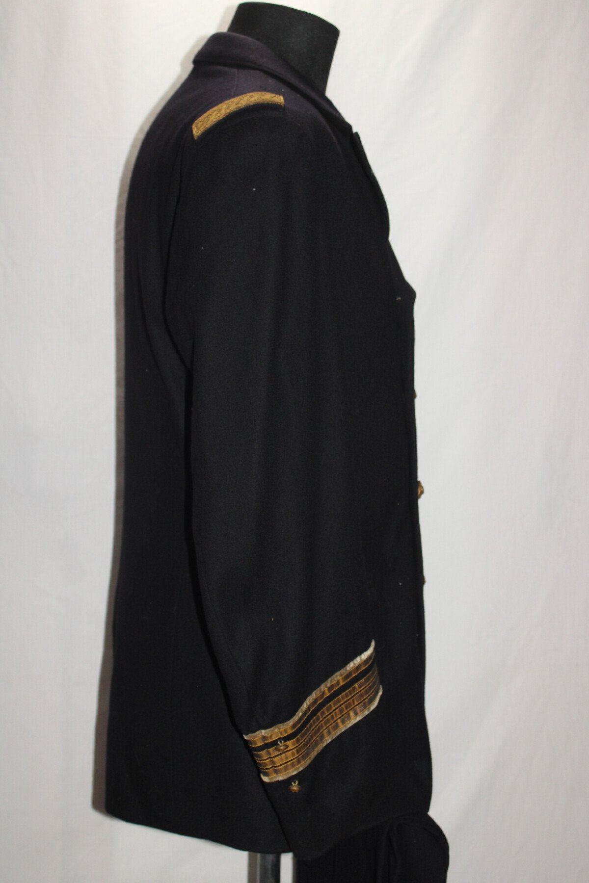 Vareuse en drap de laine de la marine nationale au grade de capitaine de corvette. Bel état général. Taille: largeur d'épaules 50cm à plat. Longueur de manche: 66 cm. Pantalon droit, un petit...